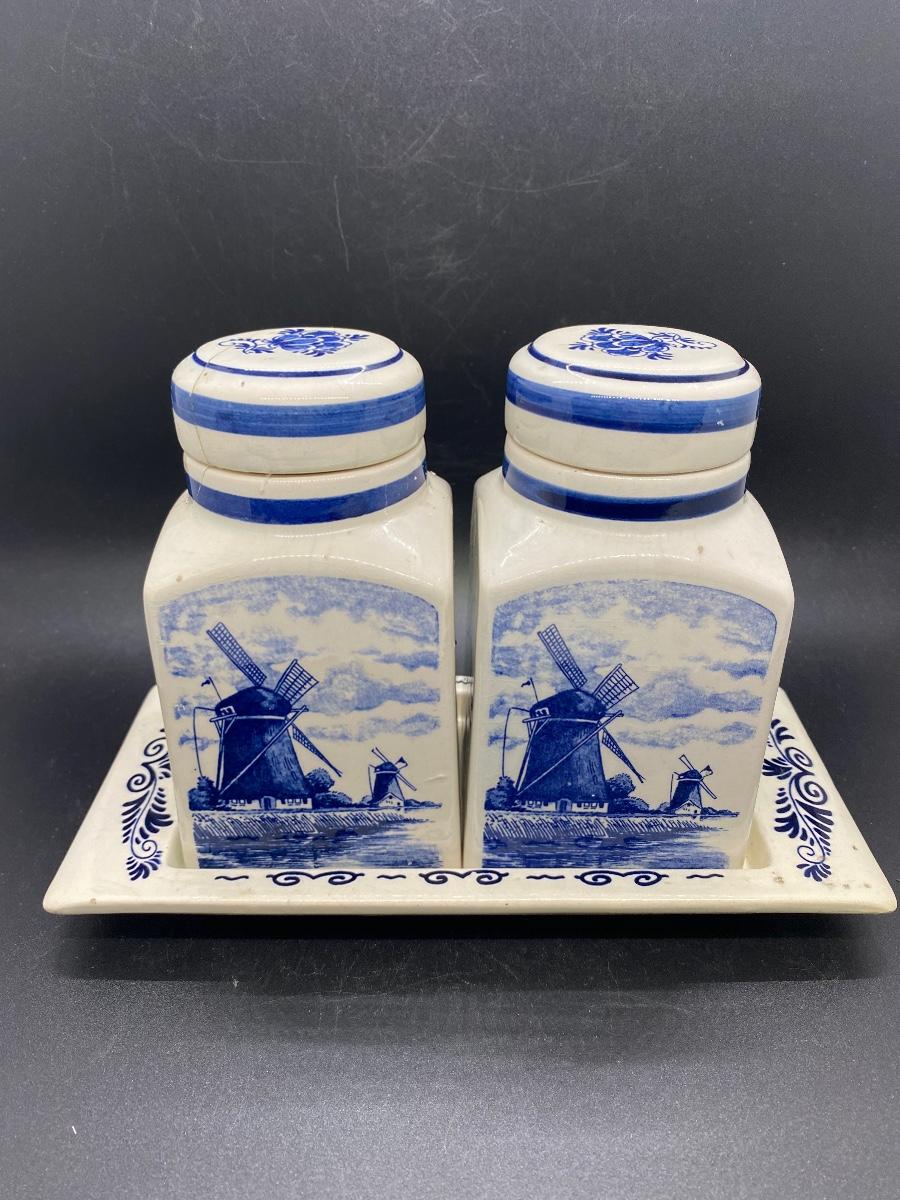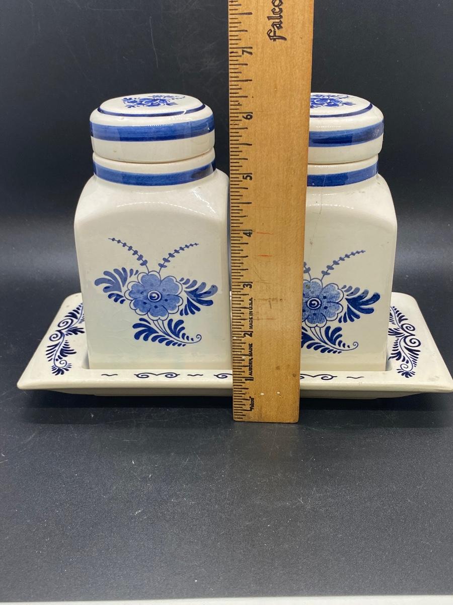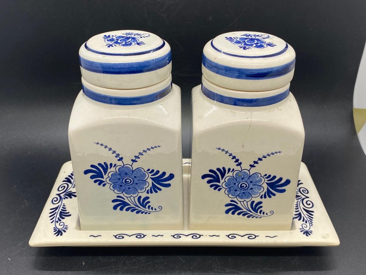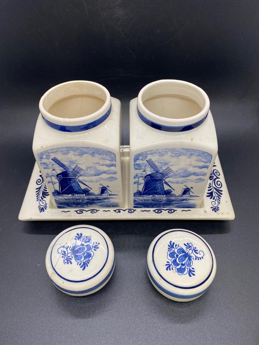 Pair of Antique Made in Holland Hand Painted Delft Blauw Spice Jars with Lids and Tray. One has been repaired. Display nicely. Check pictures for more details and for sizing.