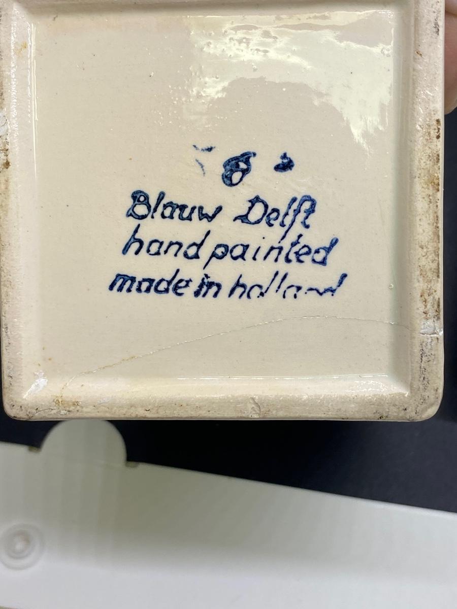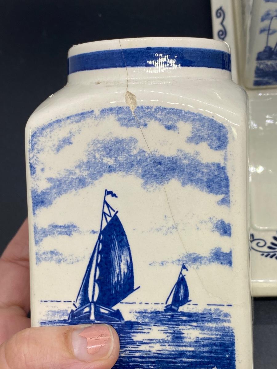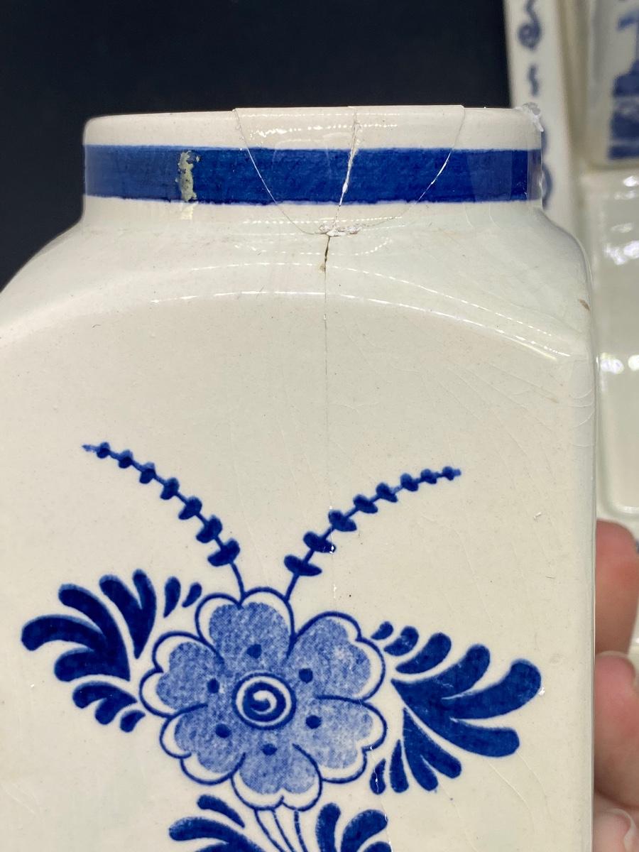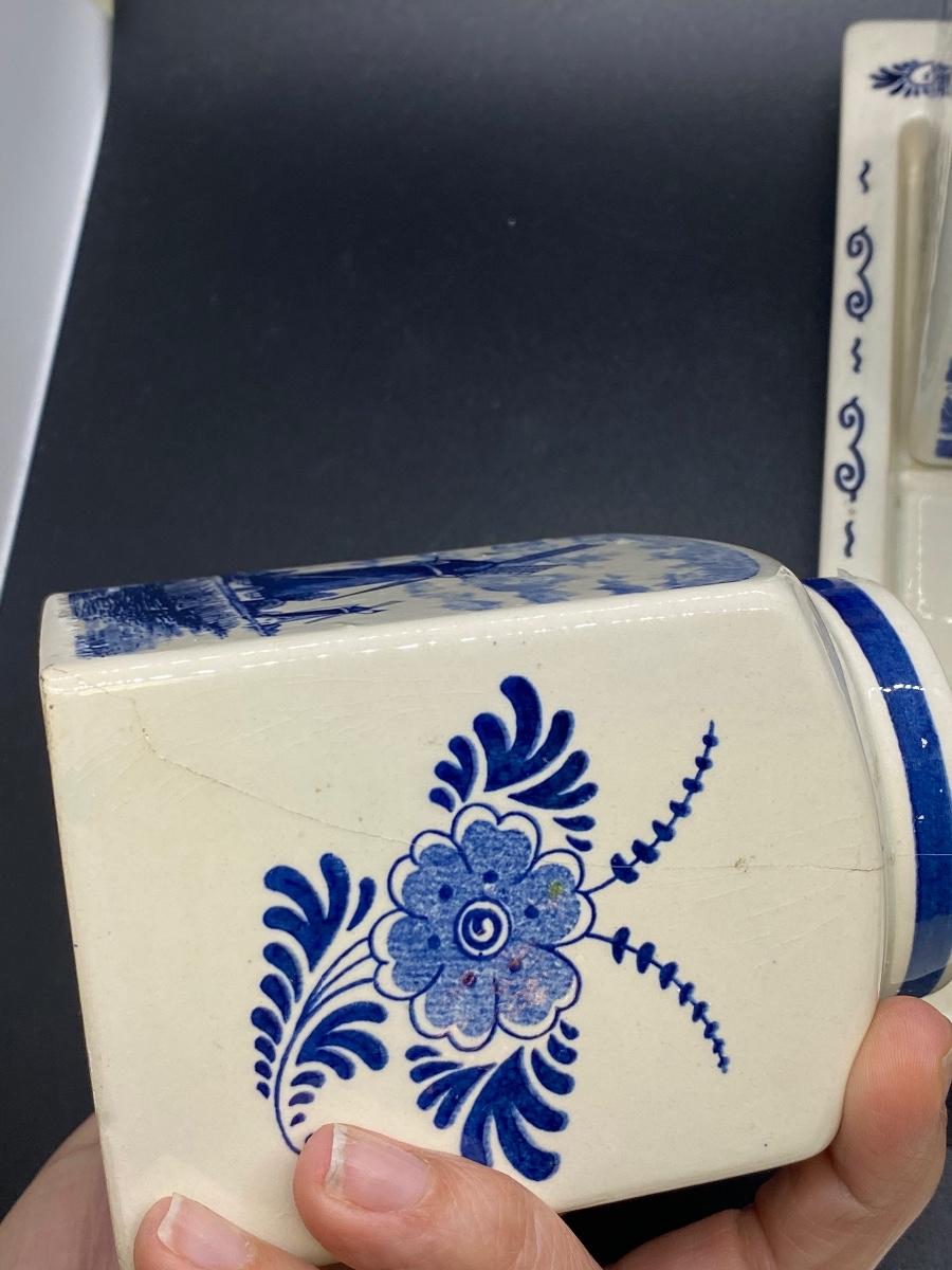 Pair of Antique Made in Holland Hand Painted Delft Blauw Spice Jars with Lids and Tray. One has been repaired. Display nicely. Check pictures for more details and for sizing.