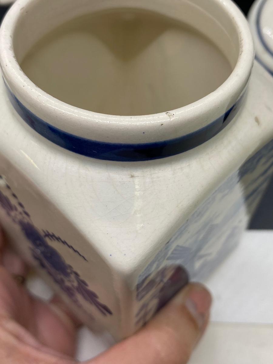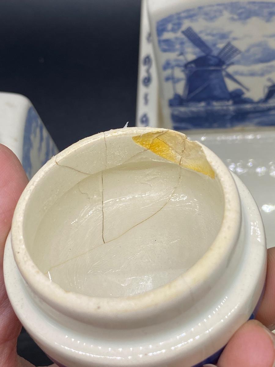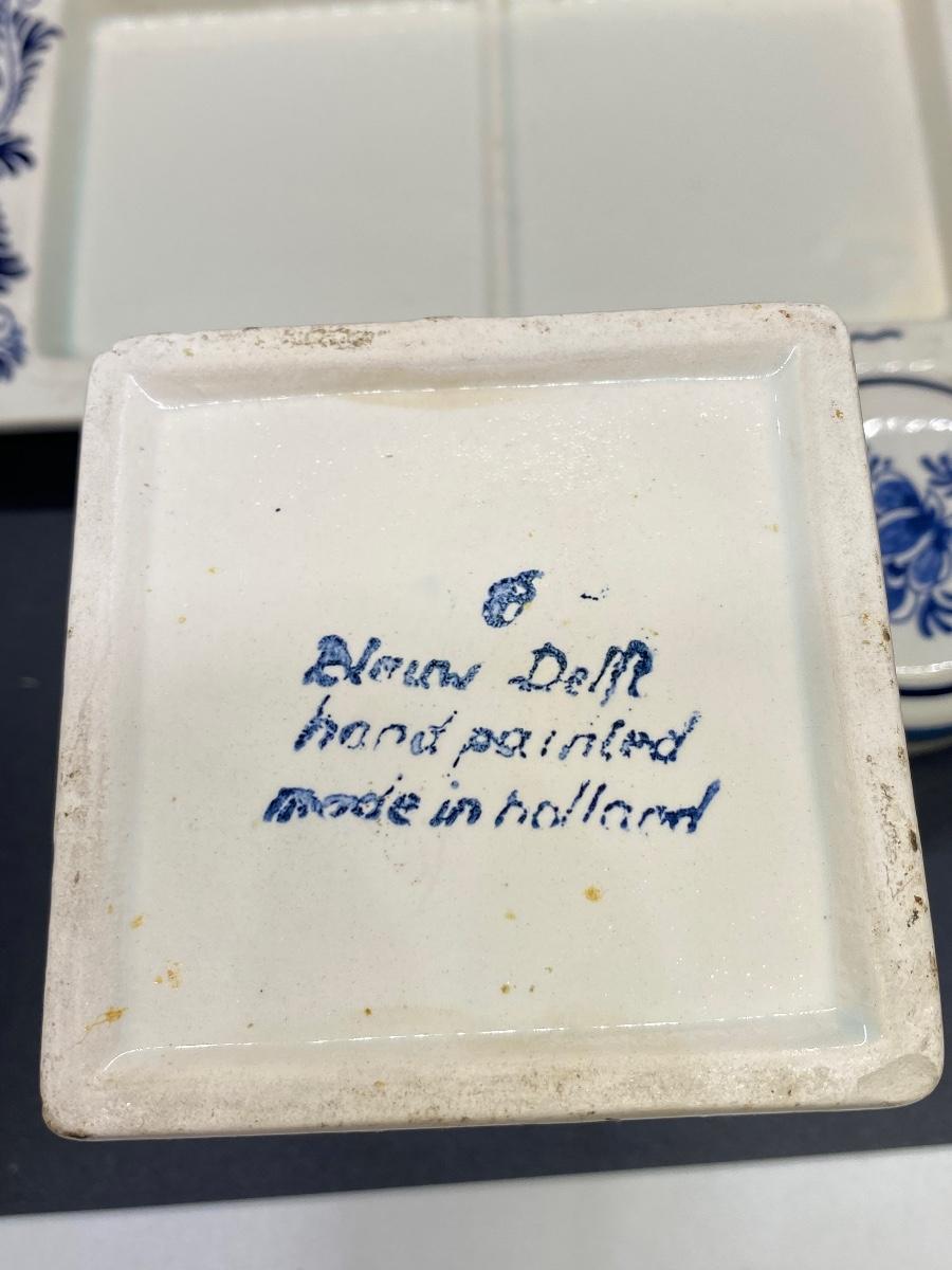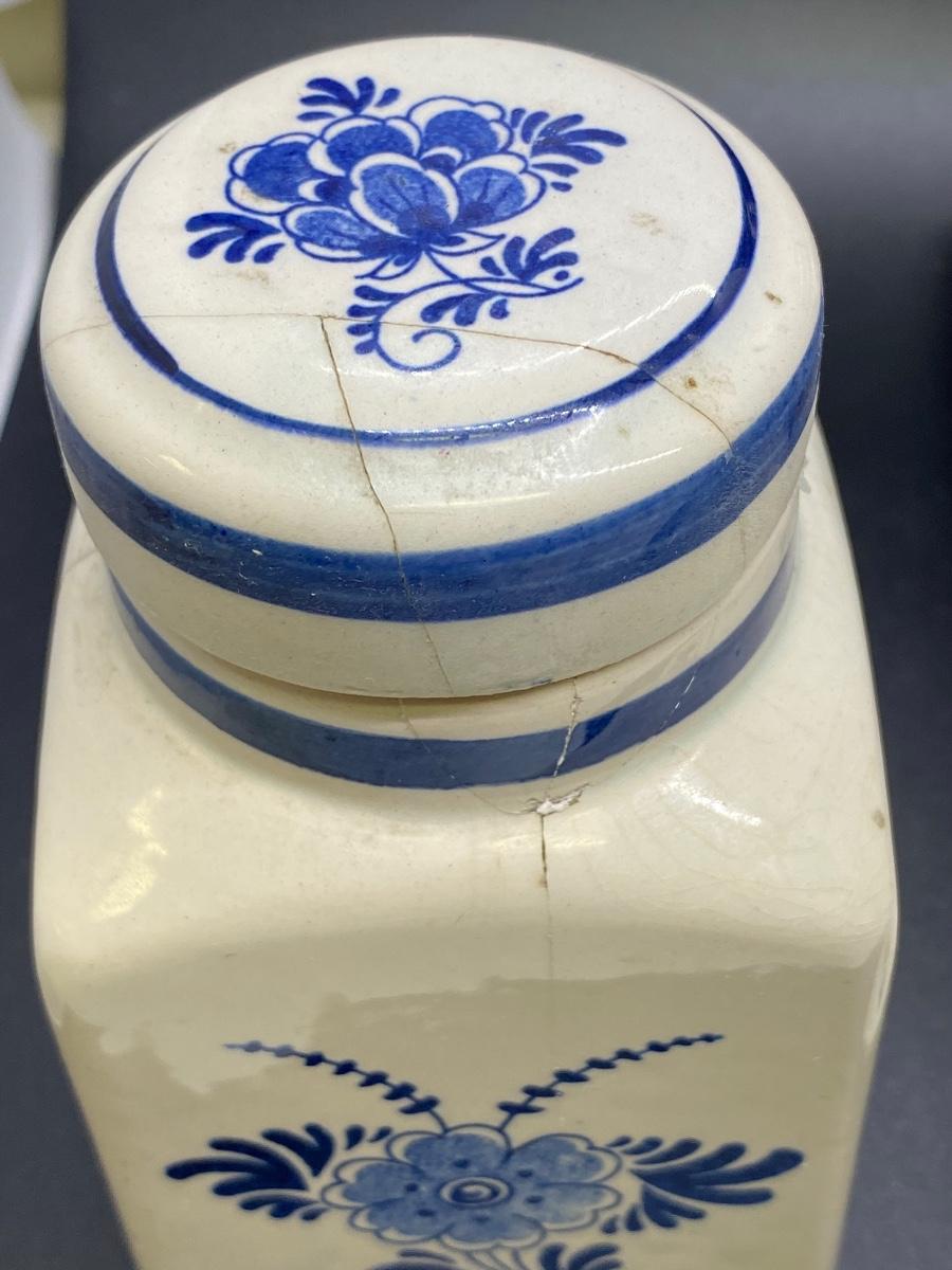Pair of Antique Made in Holland Hand Painted Delft Blauw Spice Jars with Lids and Tray. One has been repaired. Display nicely. Check pictures for more details and for sizing.