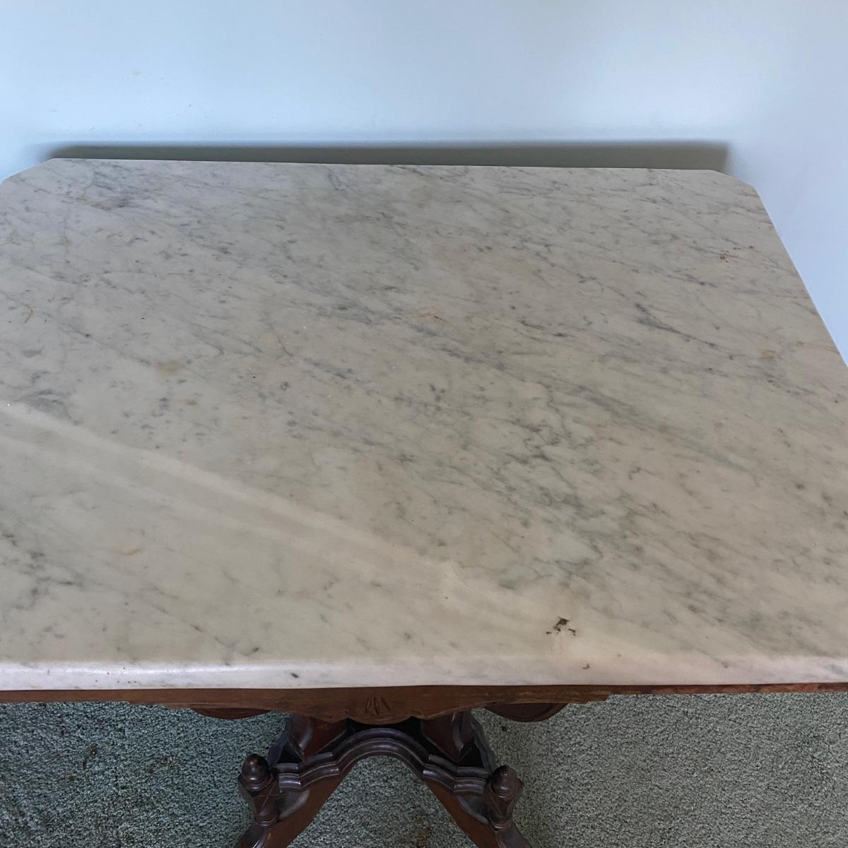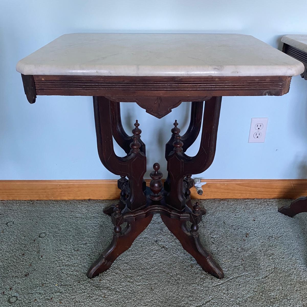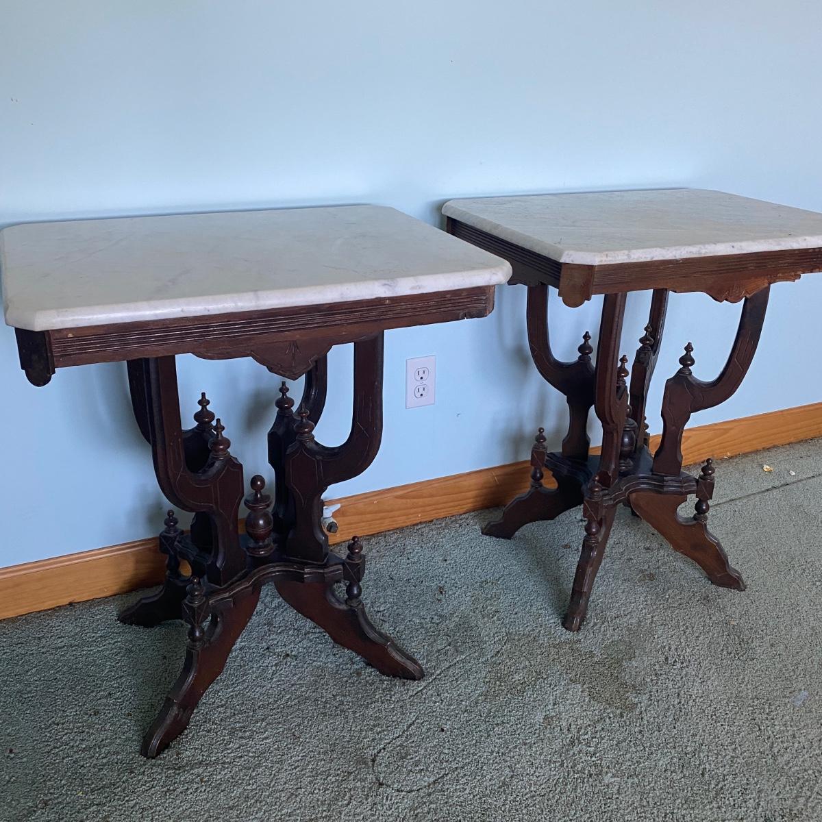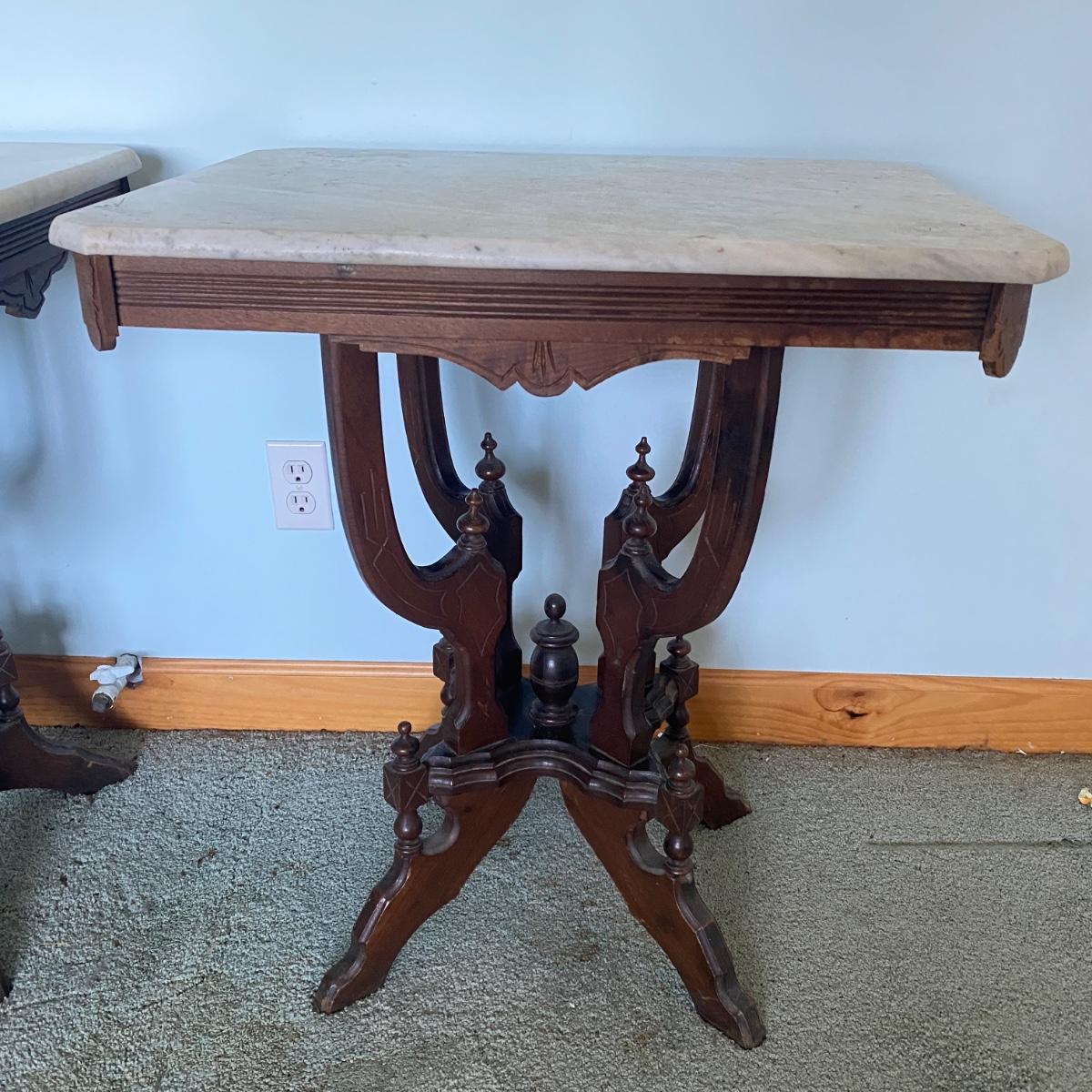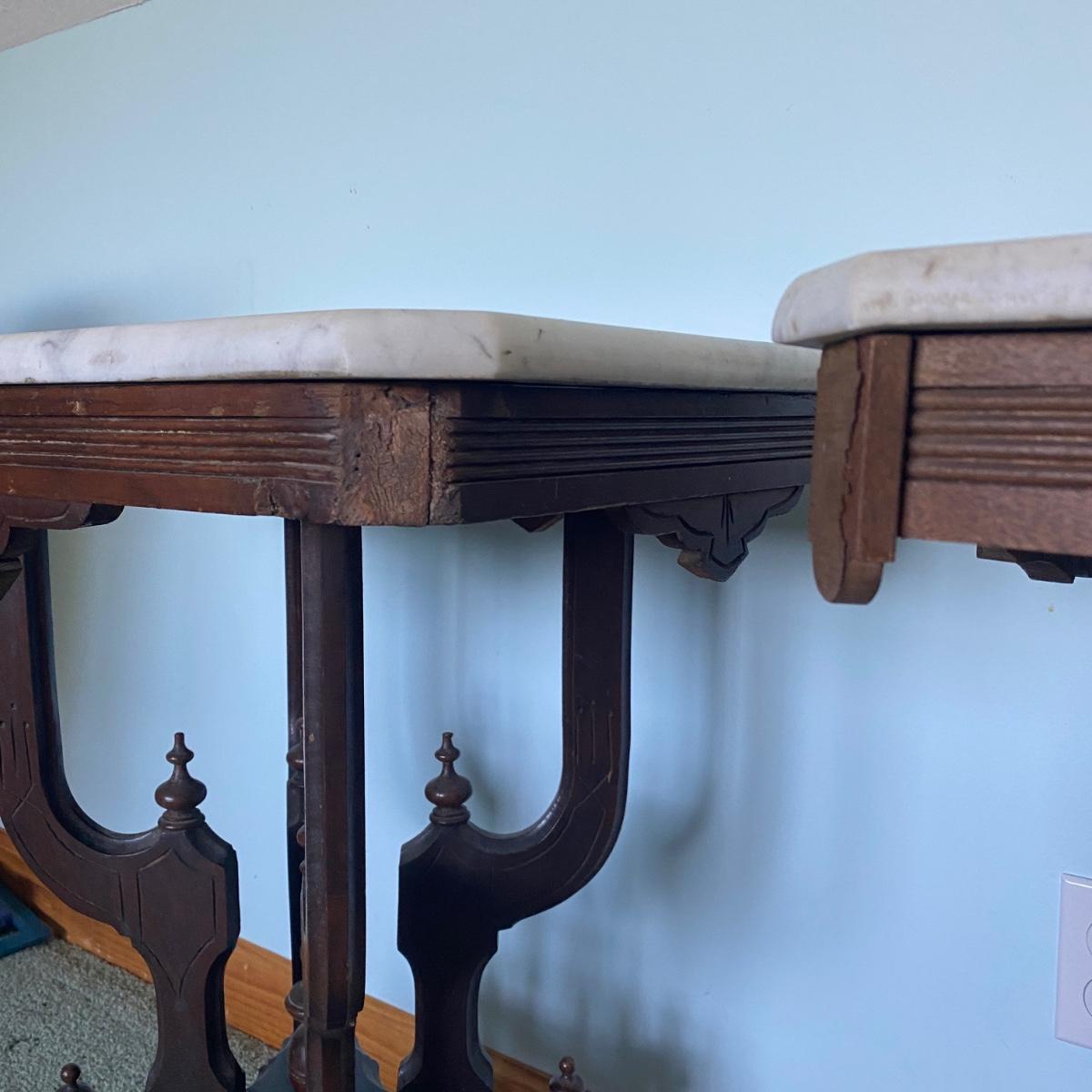 Two matching side tables with heavy removable marble tops. The white marble is free of cracks but one has a double white line across the top and the other has some surface scratches. The wood bottoms are in good condition. Sturdy and have all finials and legs intact. The front wood panel on the right one is a little lighter in color. Measures 25.5” x 19” x 28.5” tall. Local pick up only.