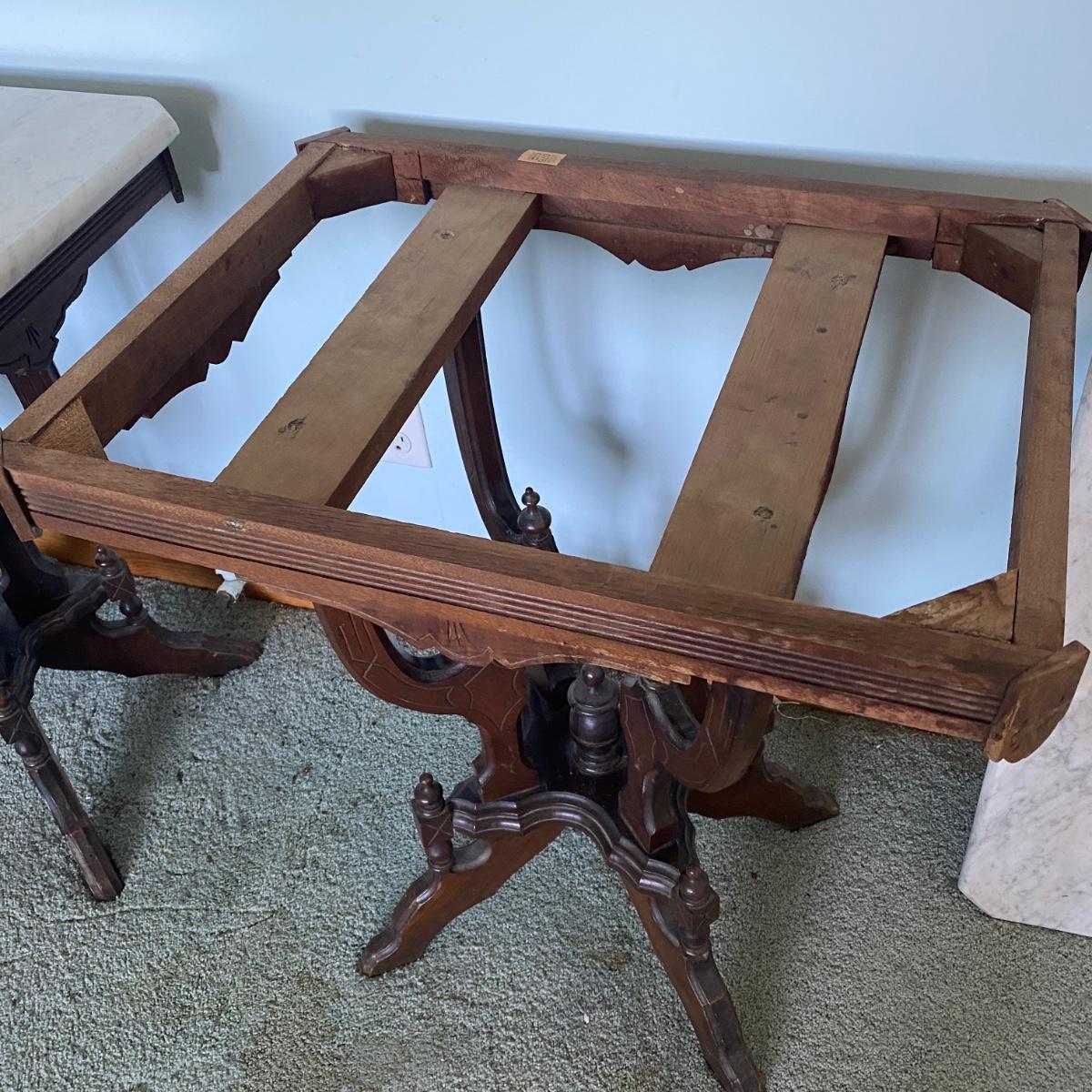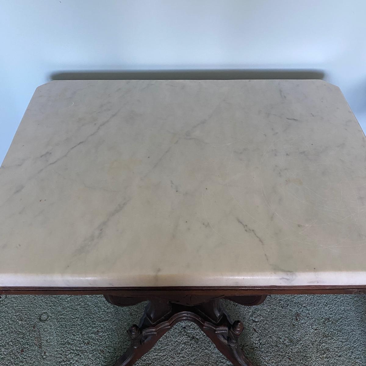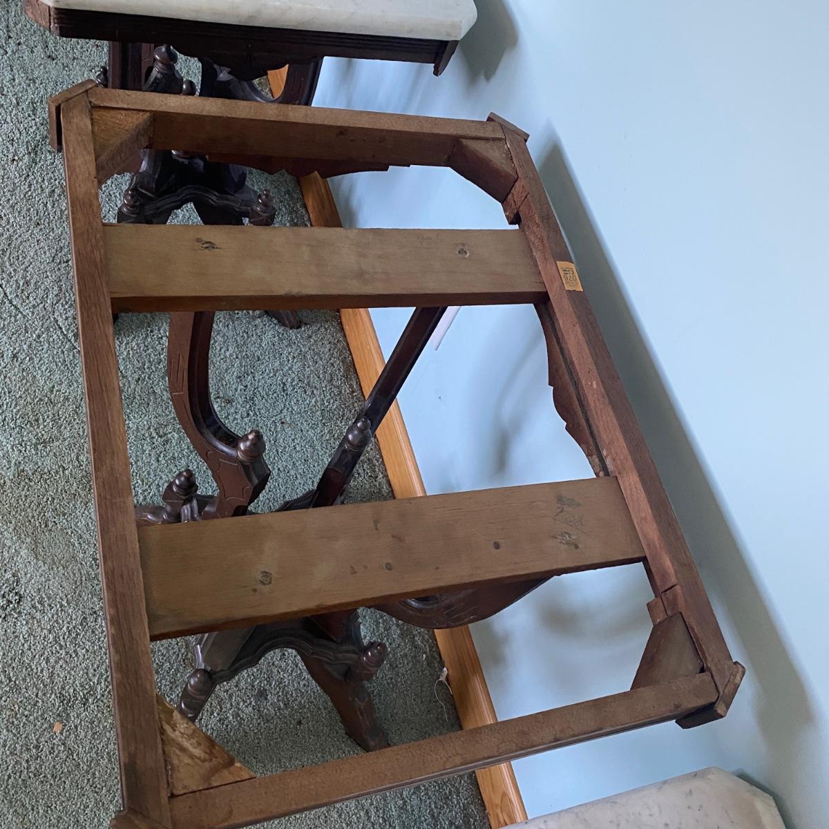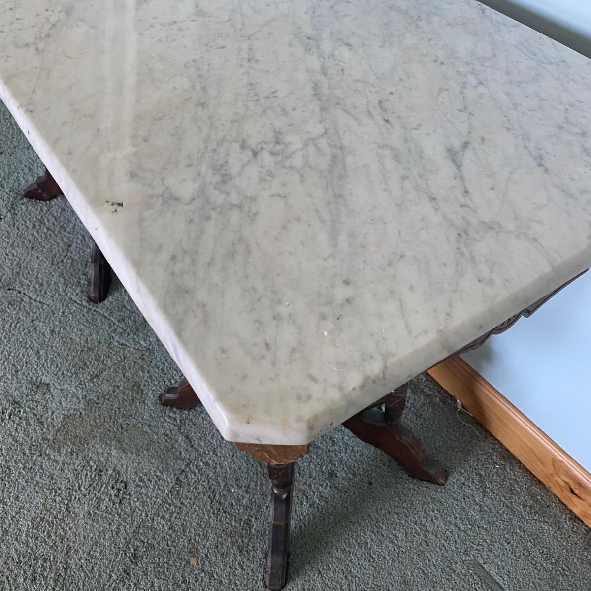 Two matching side tables with heavy removable marble tops. The white marble is free of cracks but one has a double white line across the top and the other has some surface scratches. The wood bottoms are in good condition. Sturdy and have all finials and legs intact. The front wood panel on the right one is a little lighter in color. Measures 25.5” x 19” x 28.5” tall. Local pick up only.