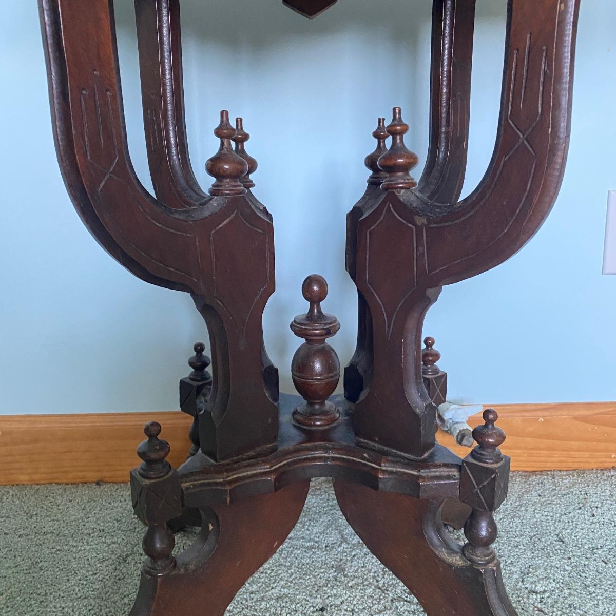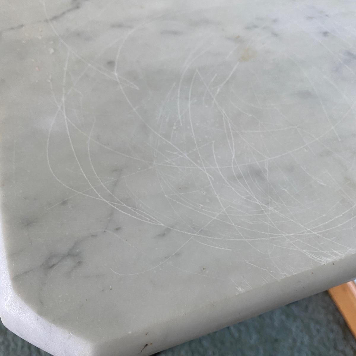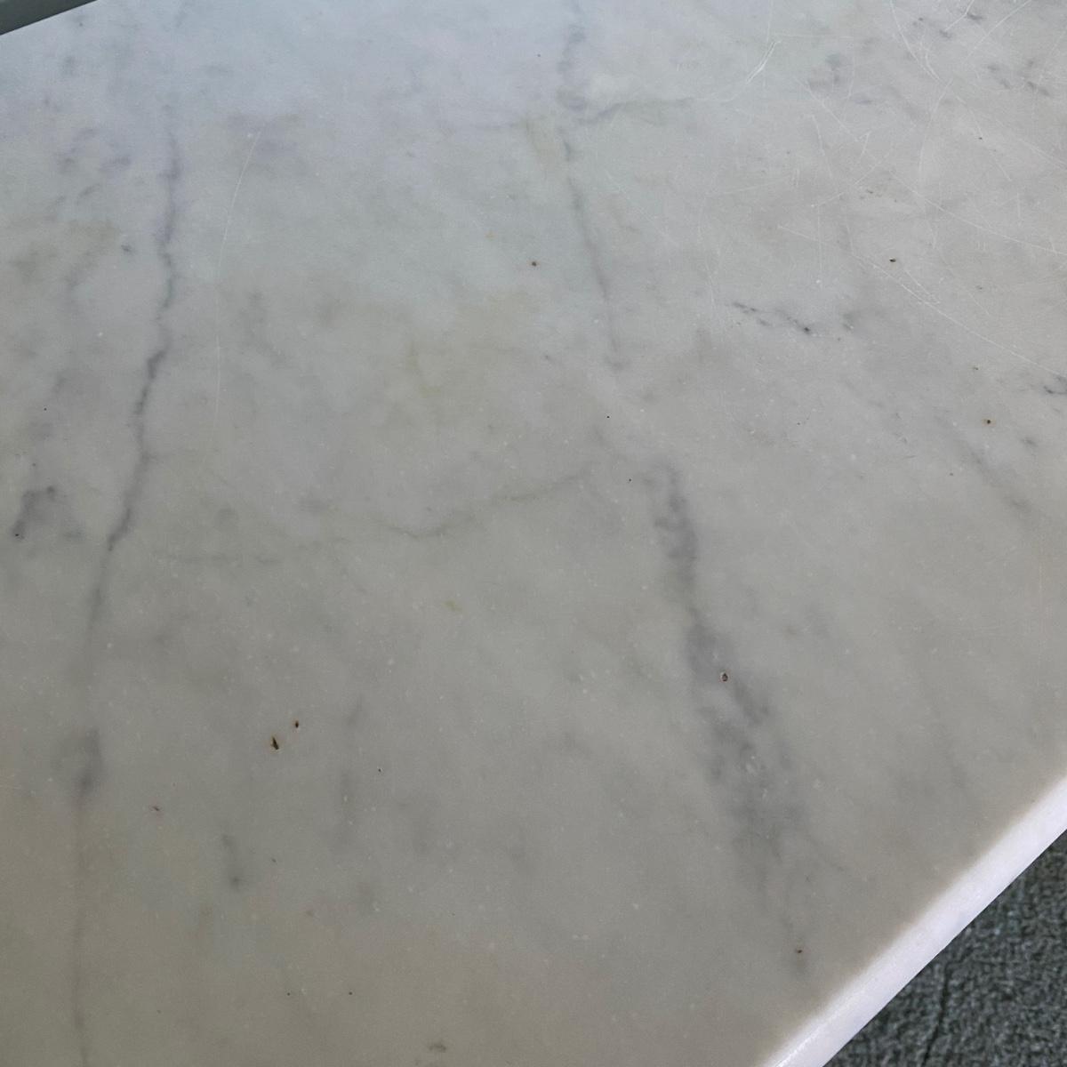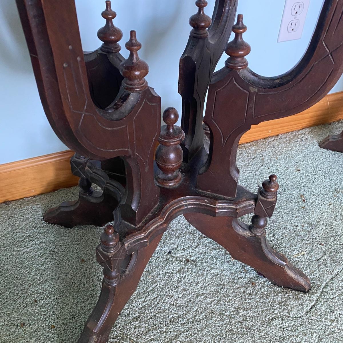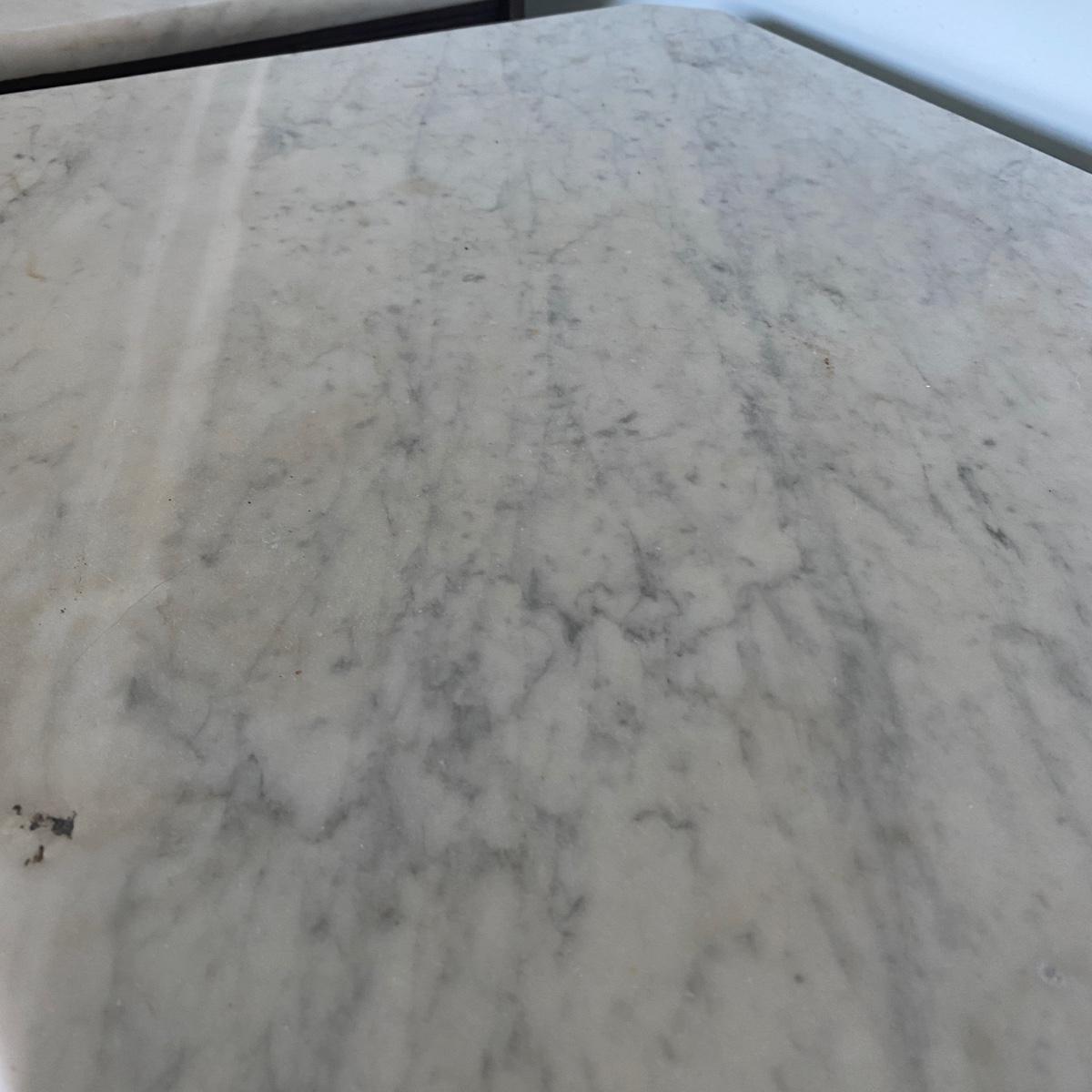 Two matching side tables with heavy removable marble tops. The white marble is free of cracks but one has a double white line across the top and the other has some surface scratches. The wood bottoms are in good condition. Sturdy and have all finials and legs intact. The front wood panel on the right one is a little lighter in color. Measures 25.5” x 19” x 28.5” tall. Local pick up only.