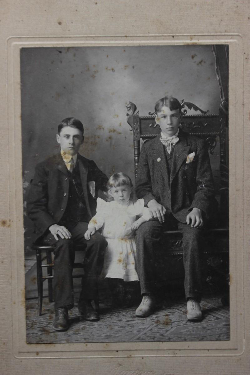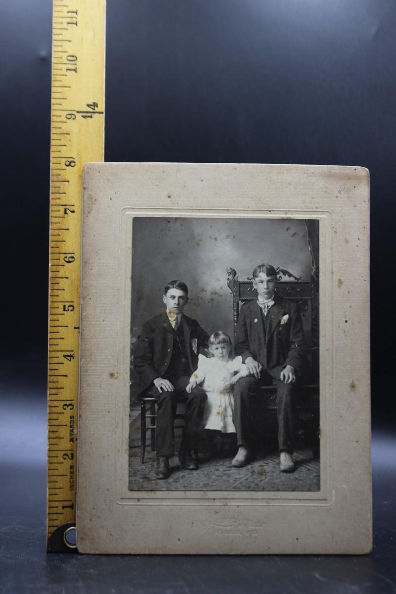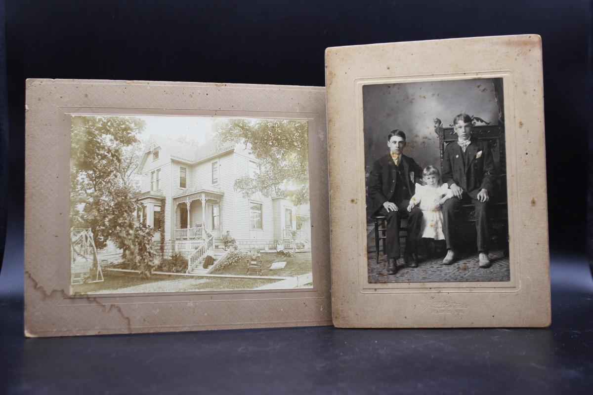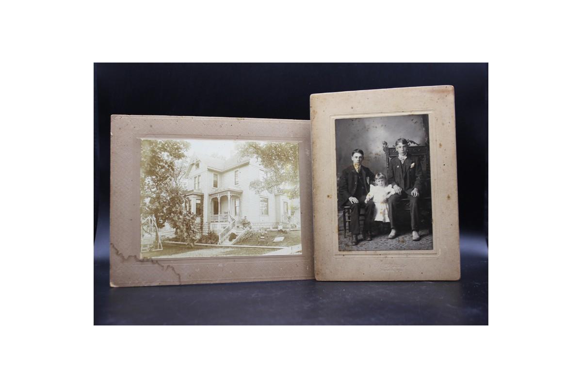 Pair of Antique Matted Photographs of Children and a House with the Original Newspaper Listing, there are no significant rips or damage to the photographs. There is some water damage to the house photograph, check pictures for more details and for sizing.