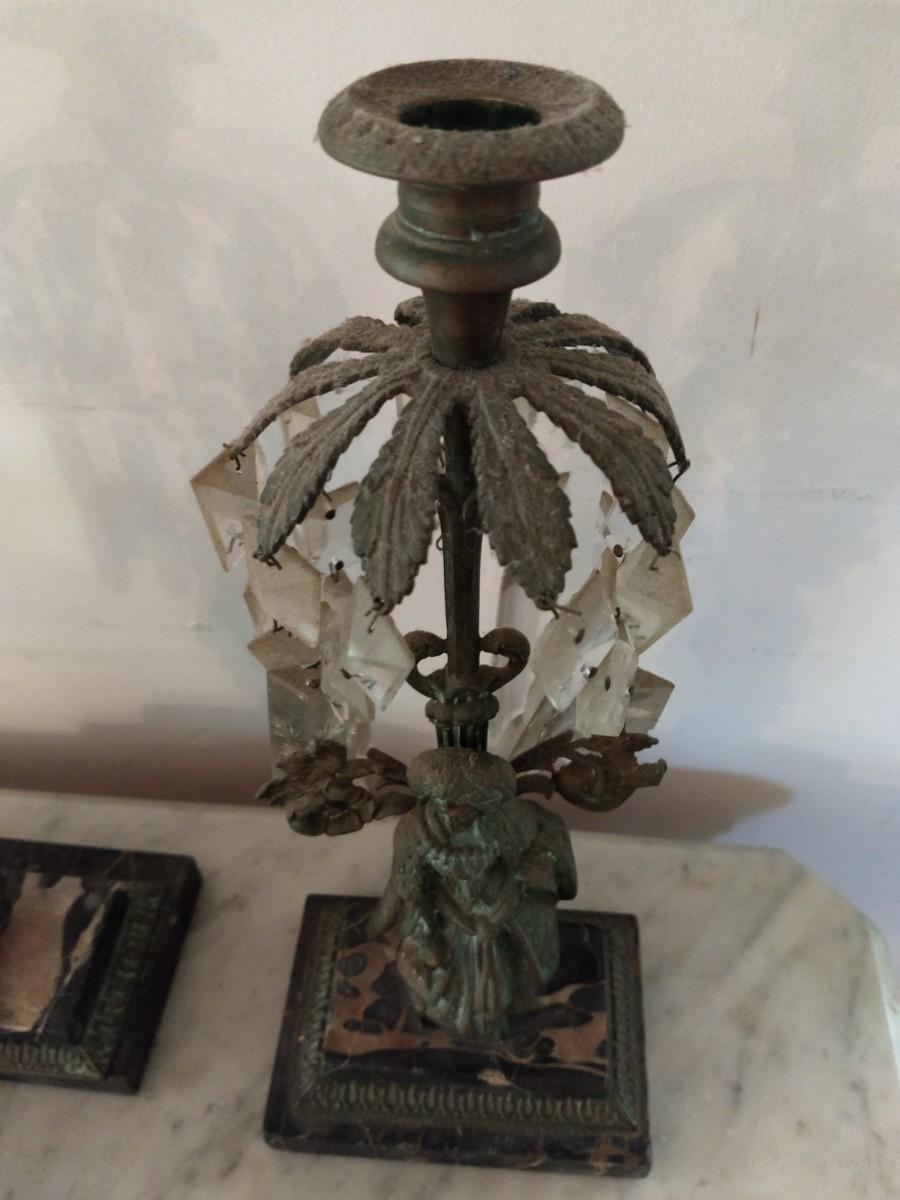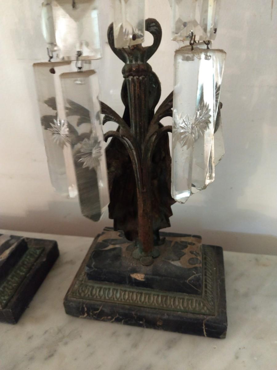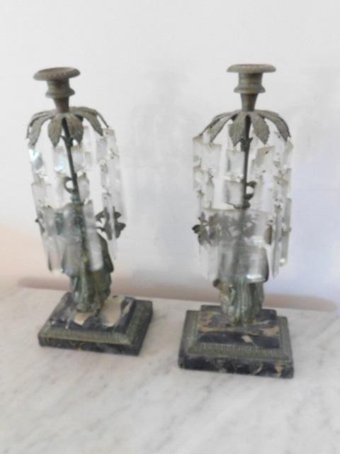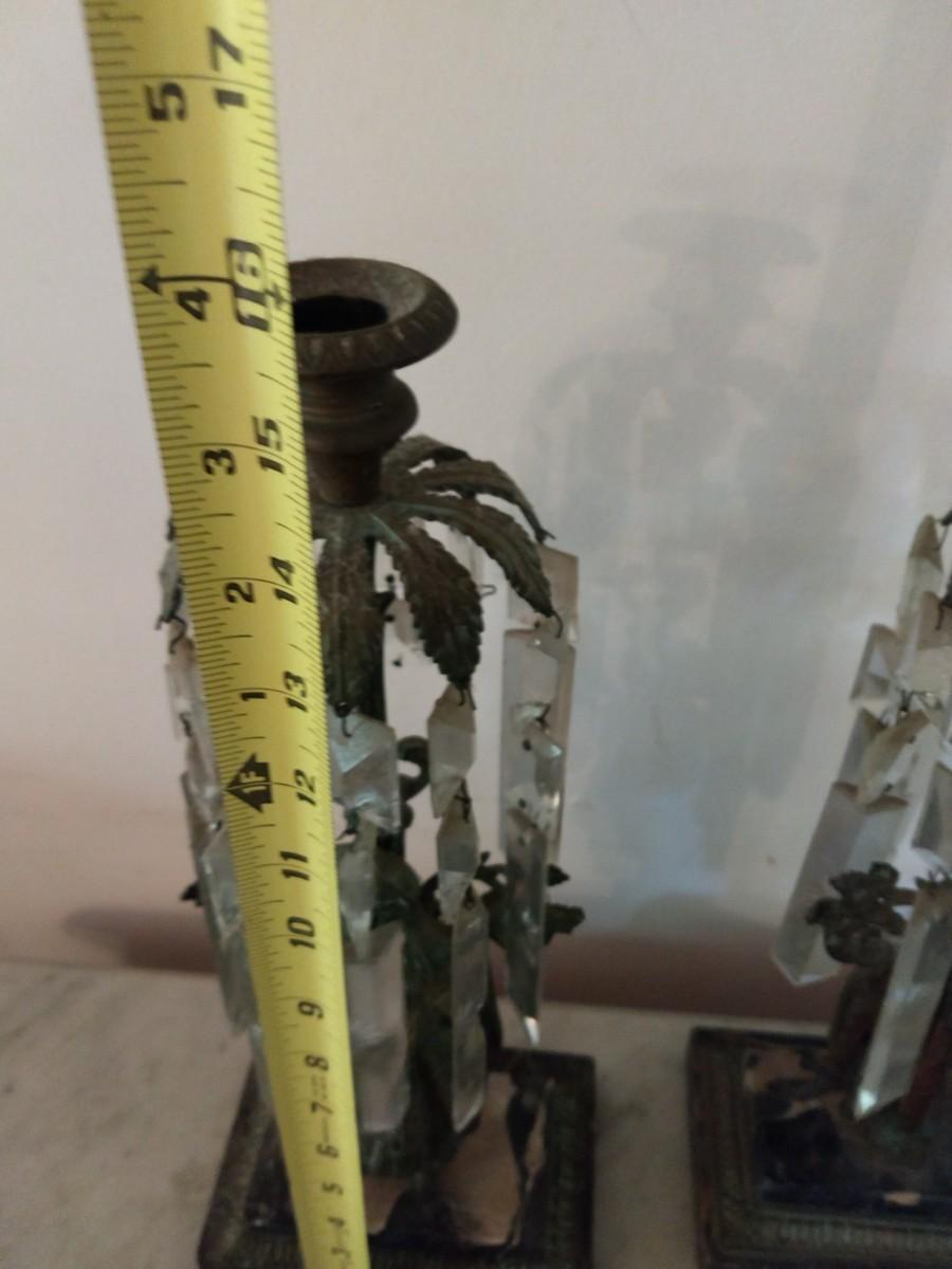 Pair of Antique Metal Candle Holders with Crystal Accents