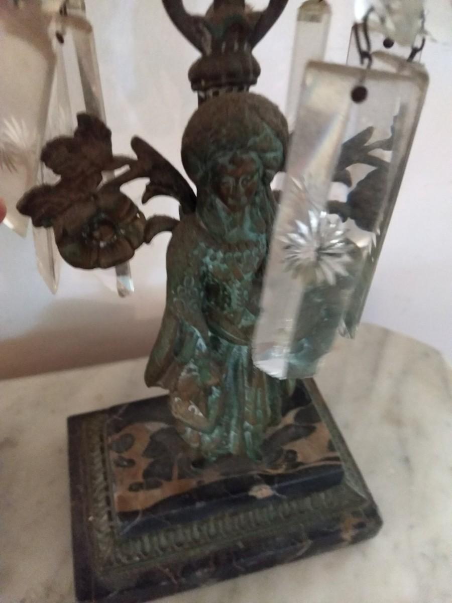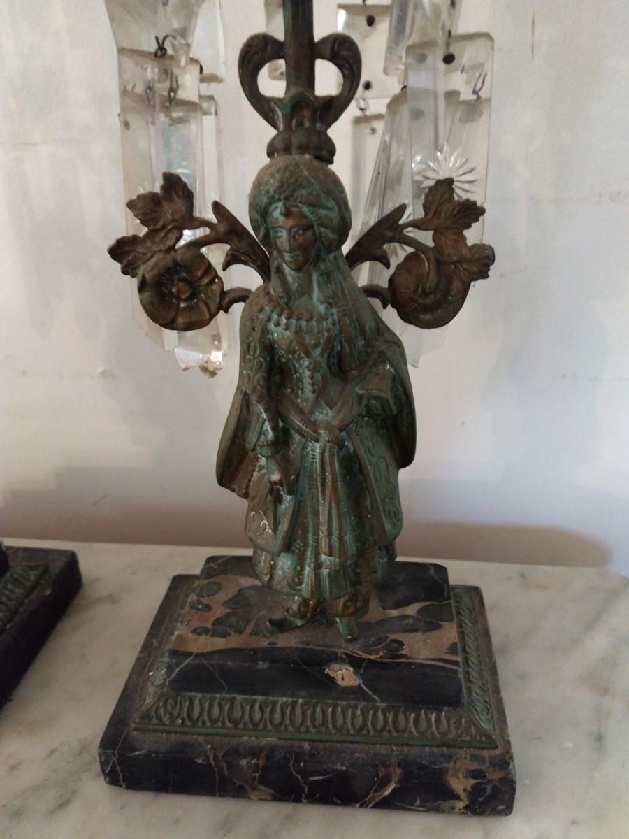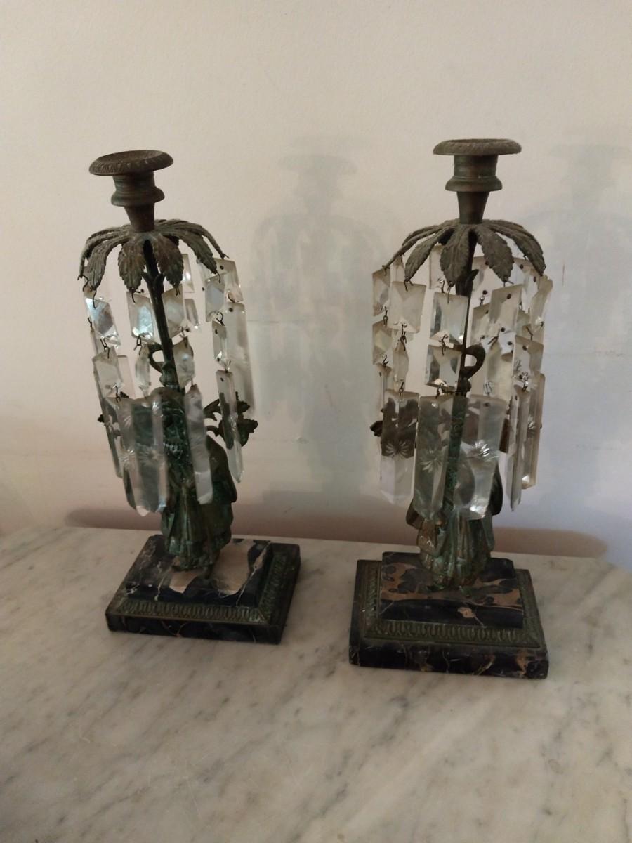 Pair of Antique Metal Candle Holders with Crystal Accents