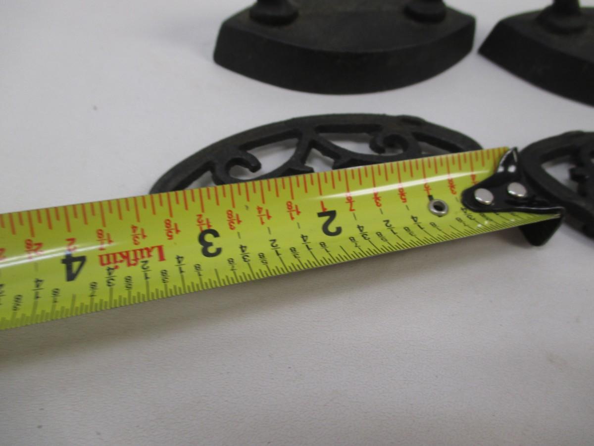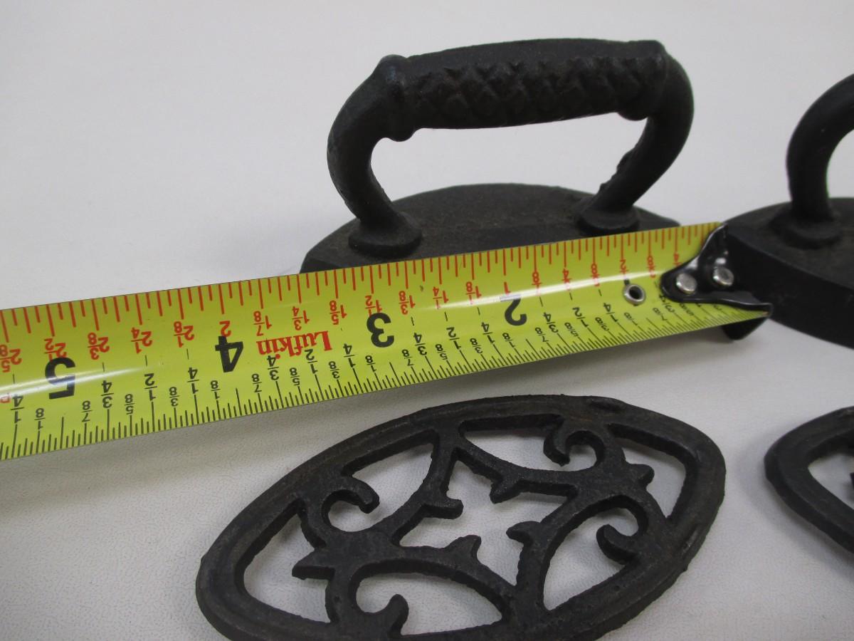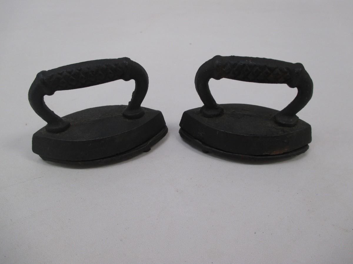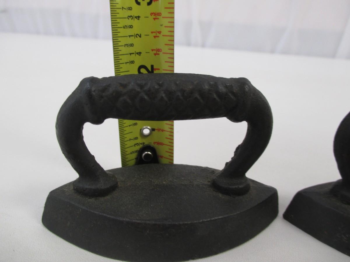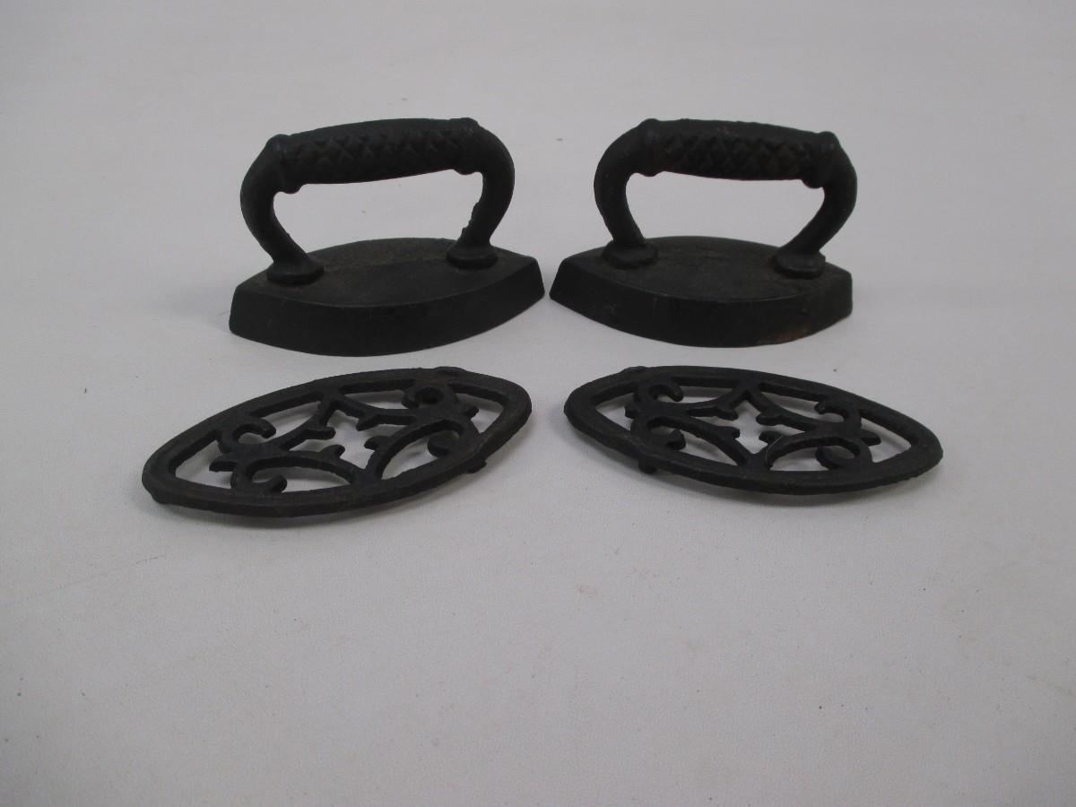 Pair Of Antique Miniature Child's Cast Iron Twisted Handle Sad Iron Salesman Sample With Trivet Stands
