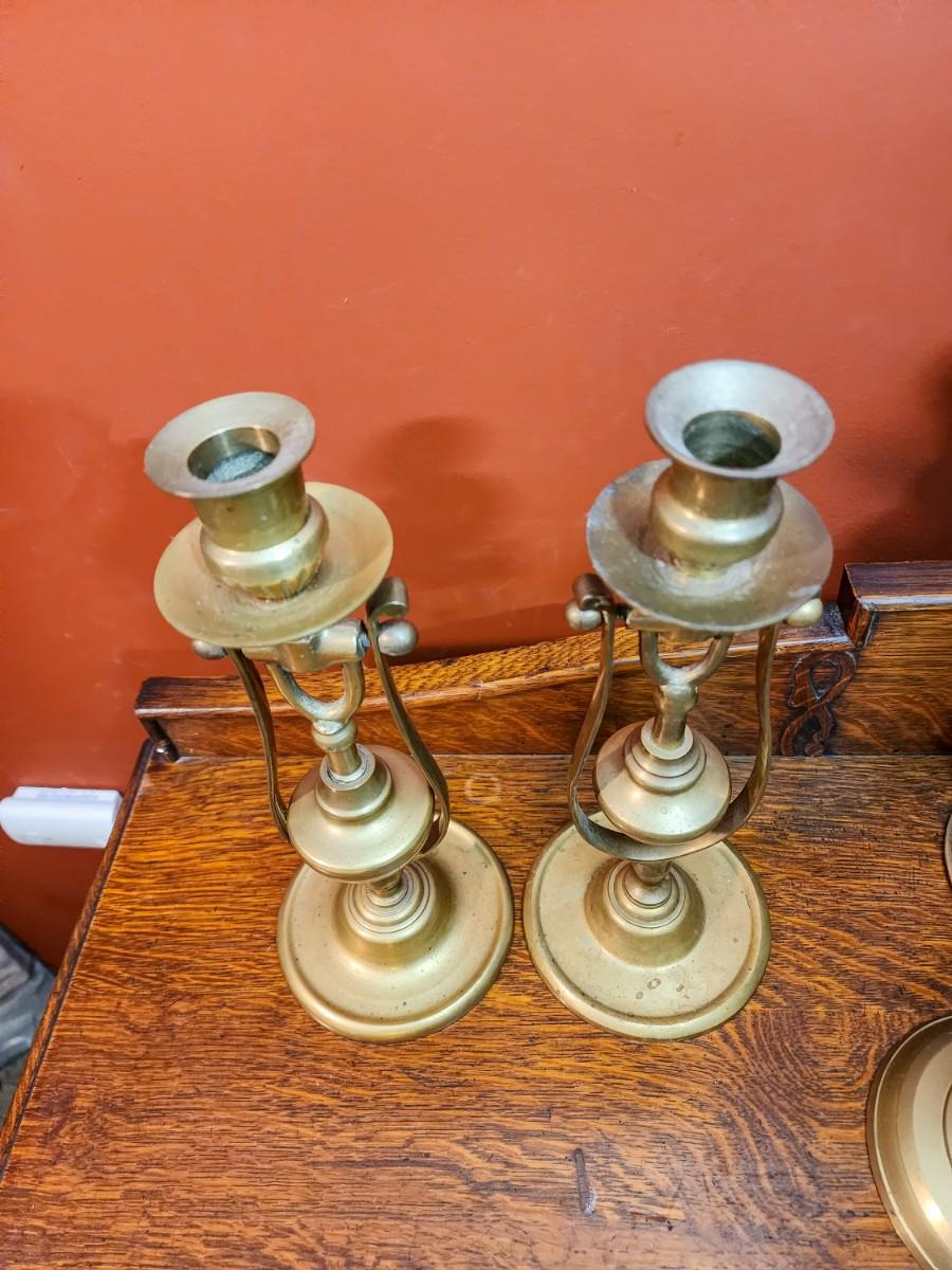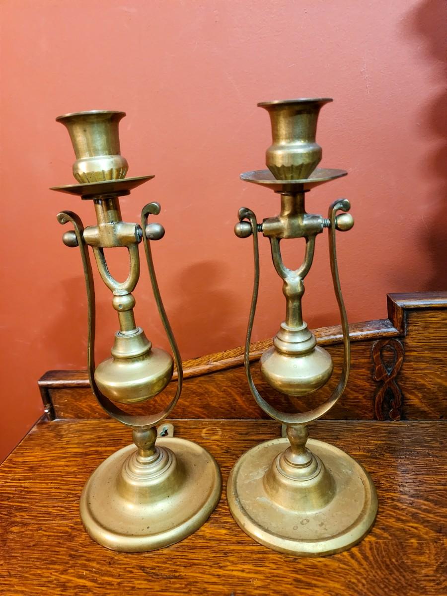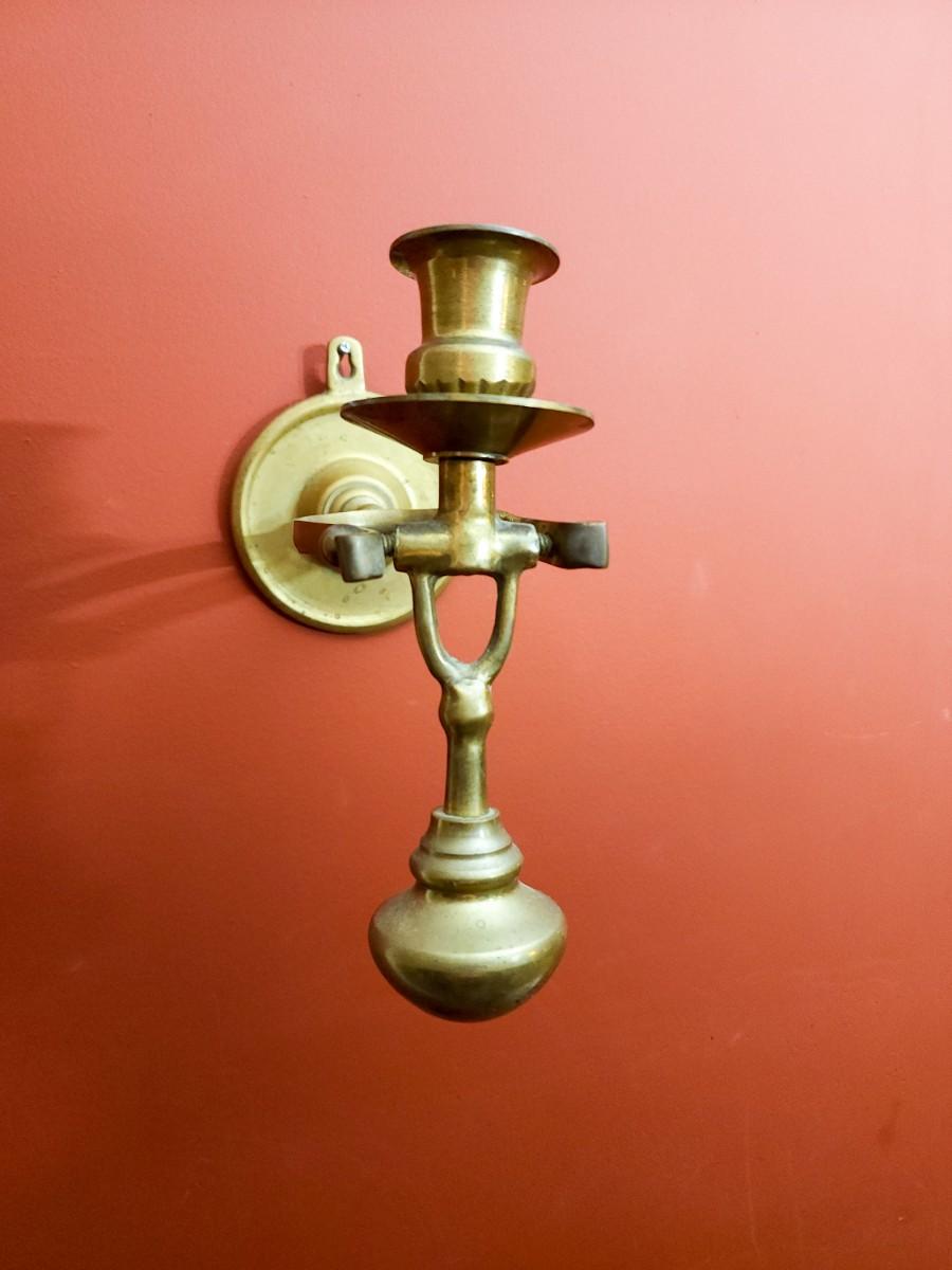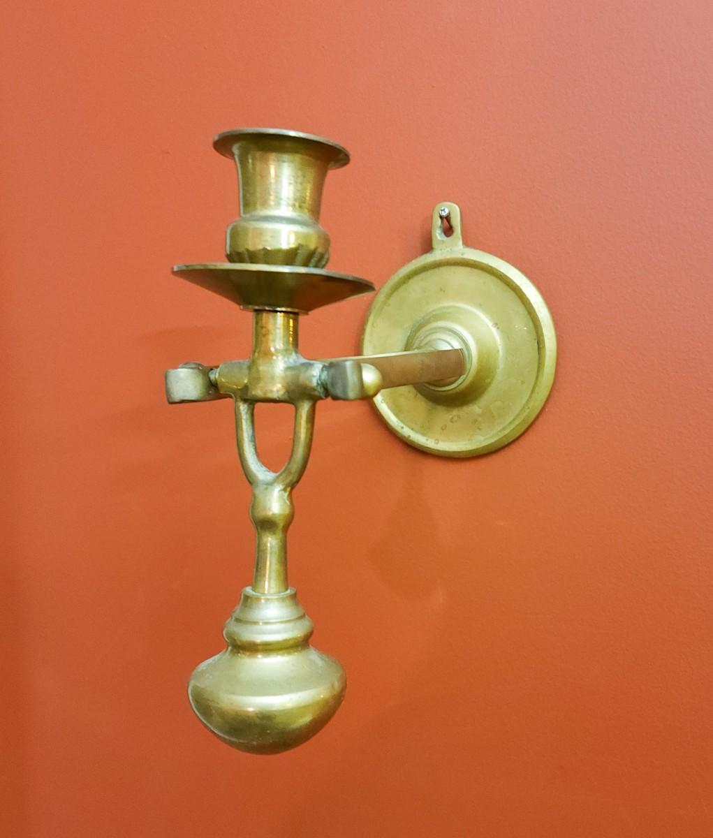 These brass candlesticks can stand on a table or hang on the wall. The gimbal arm allows them to sway with the movement of the ocean when onboard a ship.