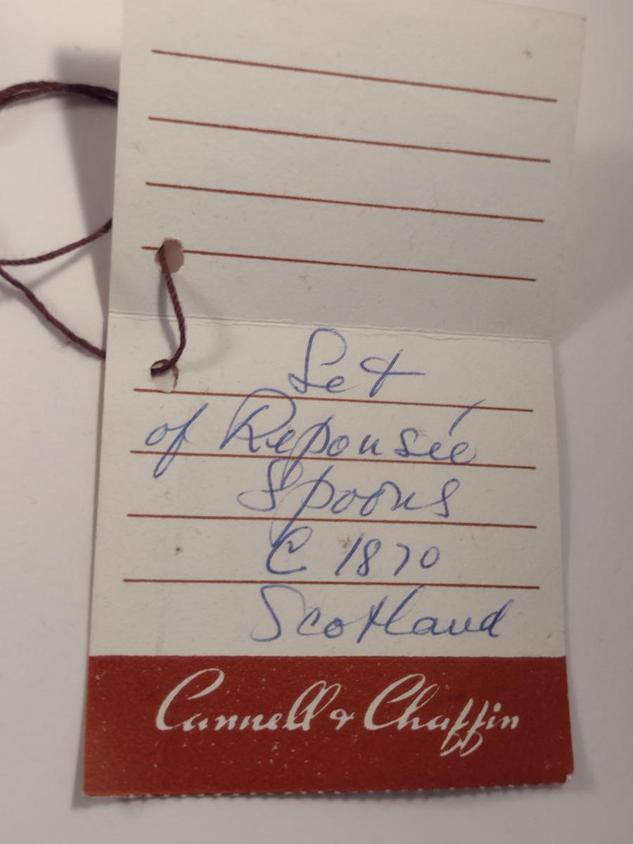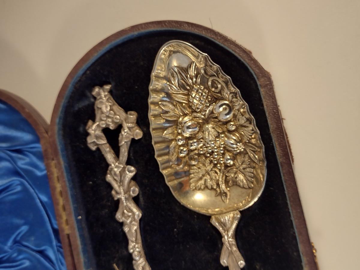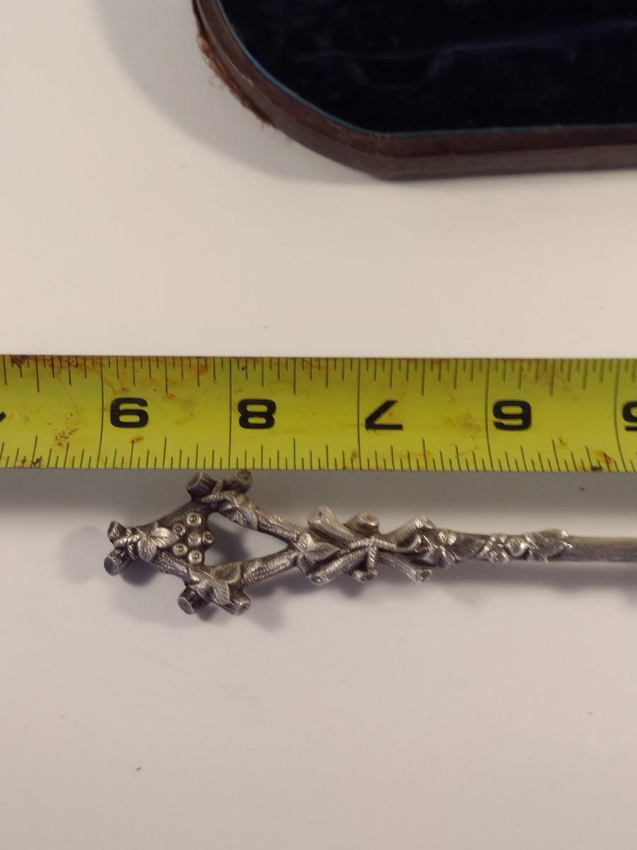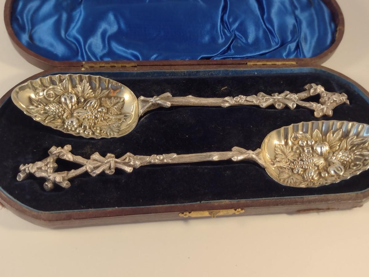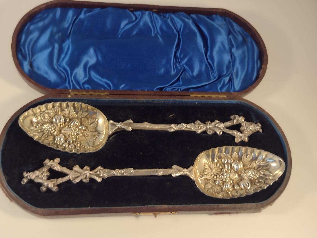 Pair of Antique Repousse' Spoons with Storage Case- Circa 1870. Items were curated from Scotland for Cannell & Chaffin.