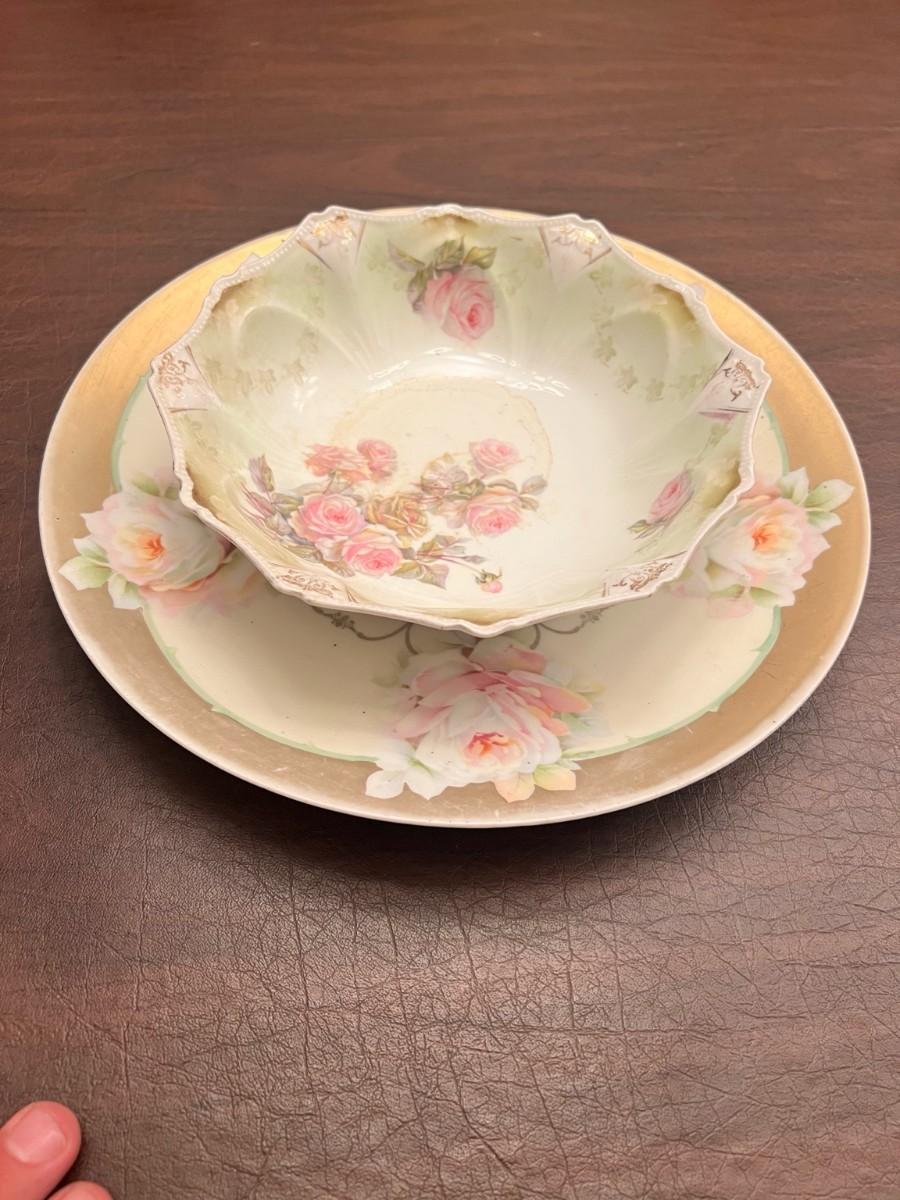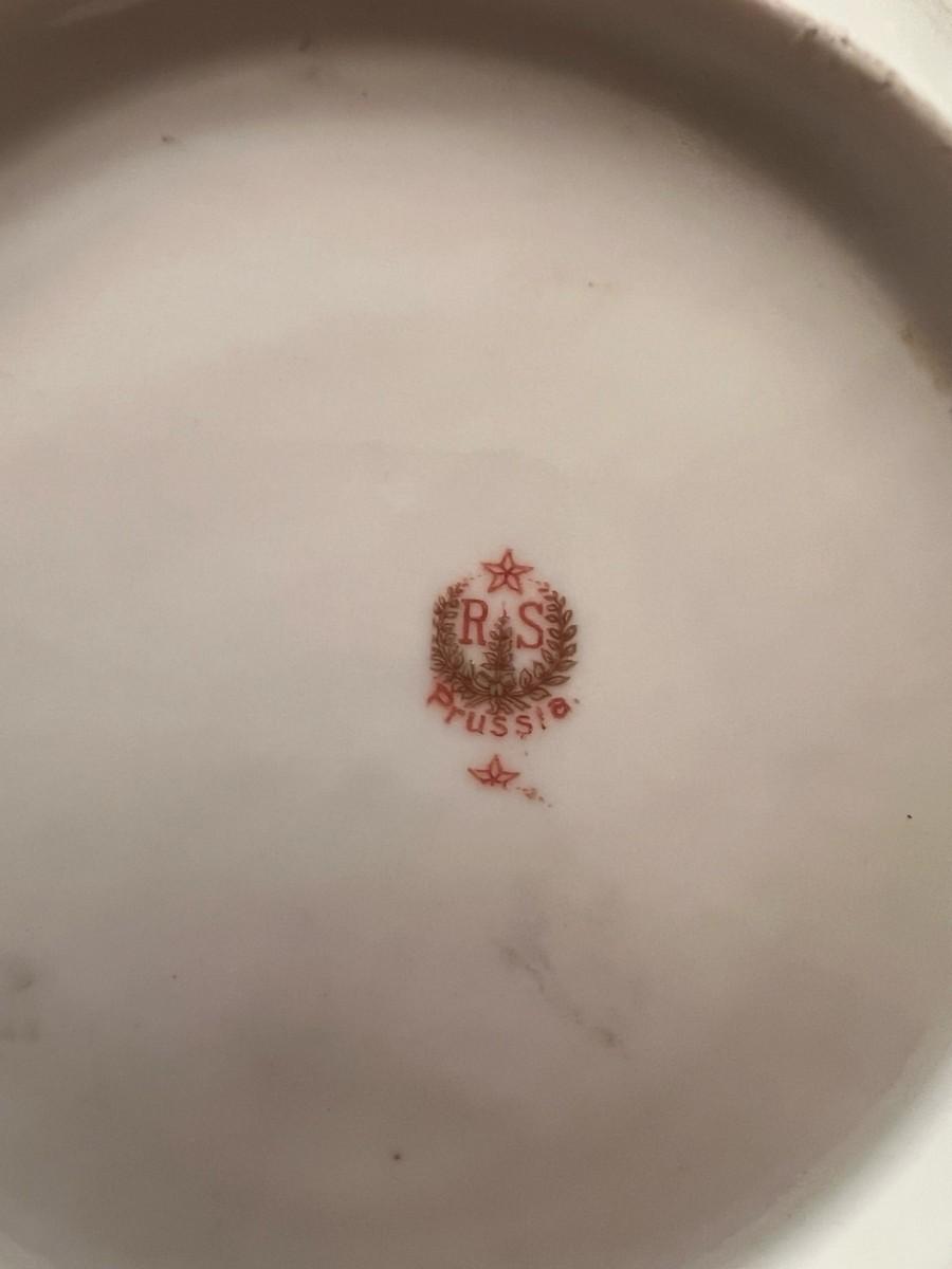 1️⃣ RS Prussia shallow bowl – soft green fade, pink rose clusters, ornate scalloped rim, gold details.