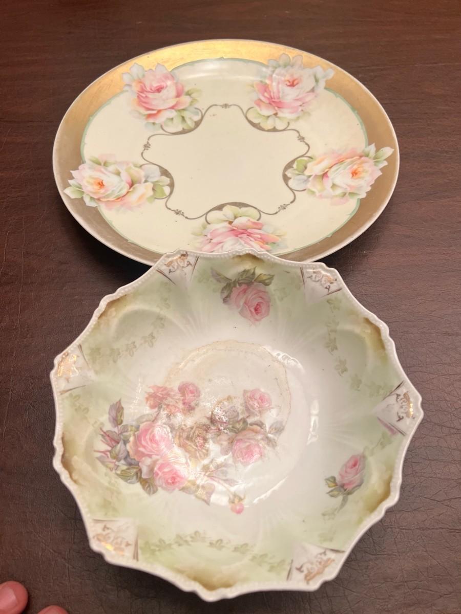 Lovely pair of antique Prussian porcelain dishes, featuring hand-painted roses and elegant gold embellishment. The set includes: