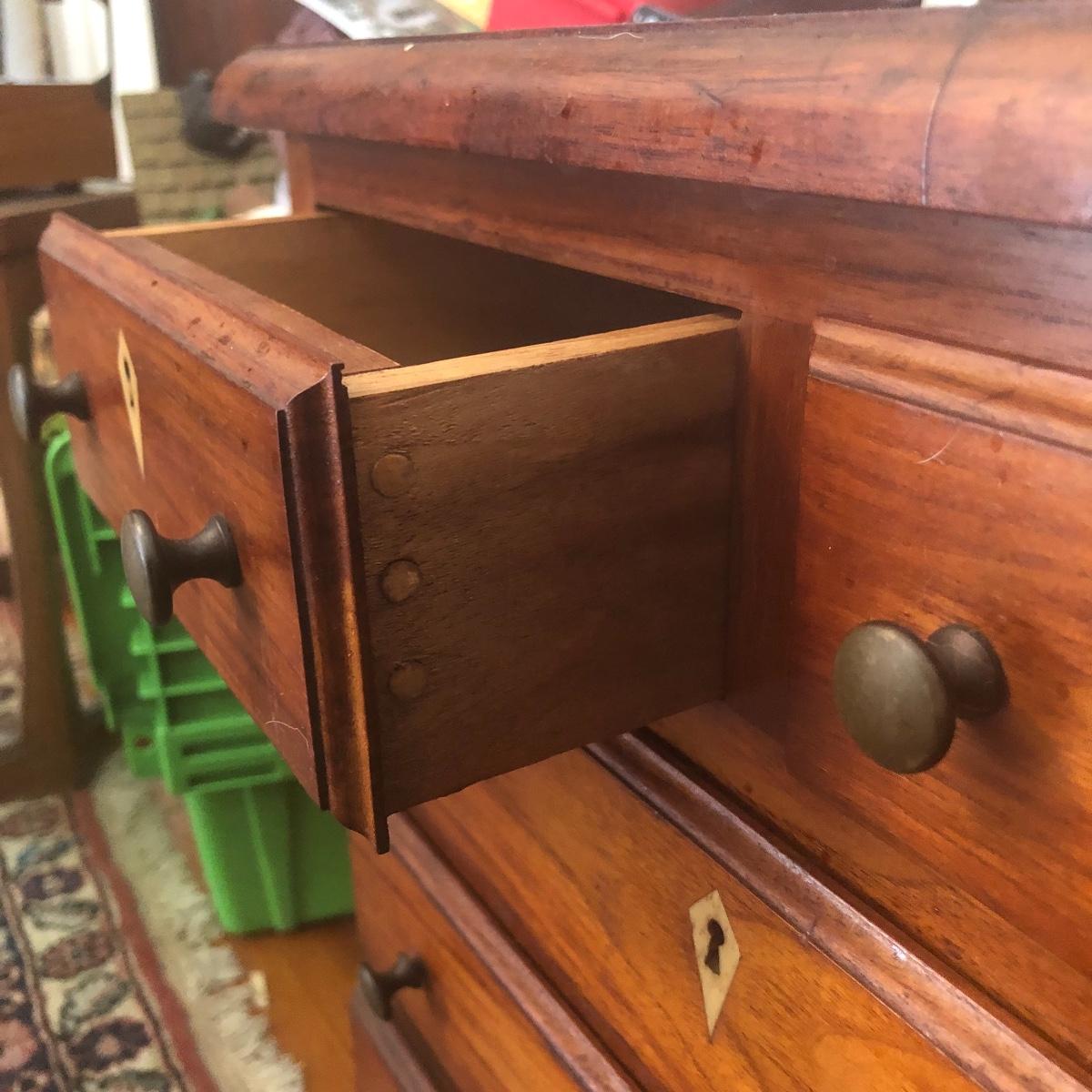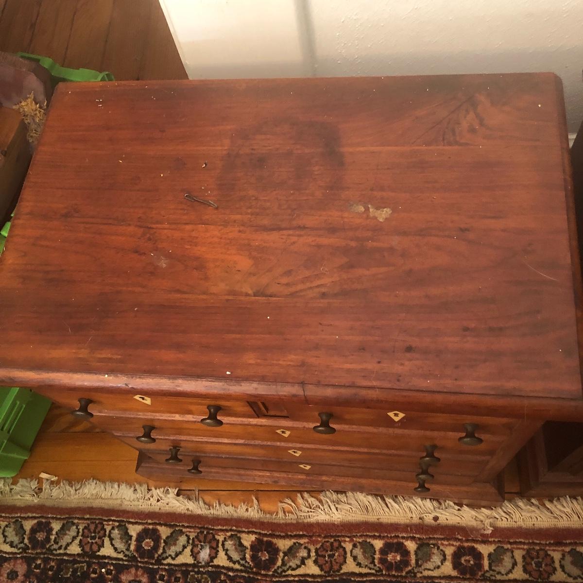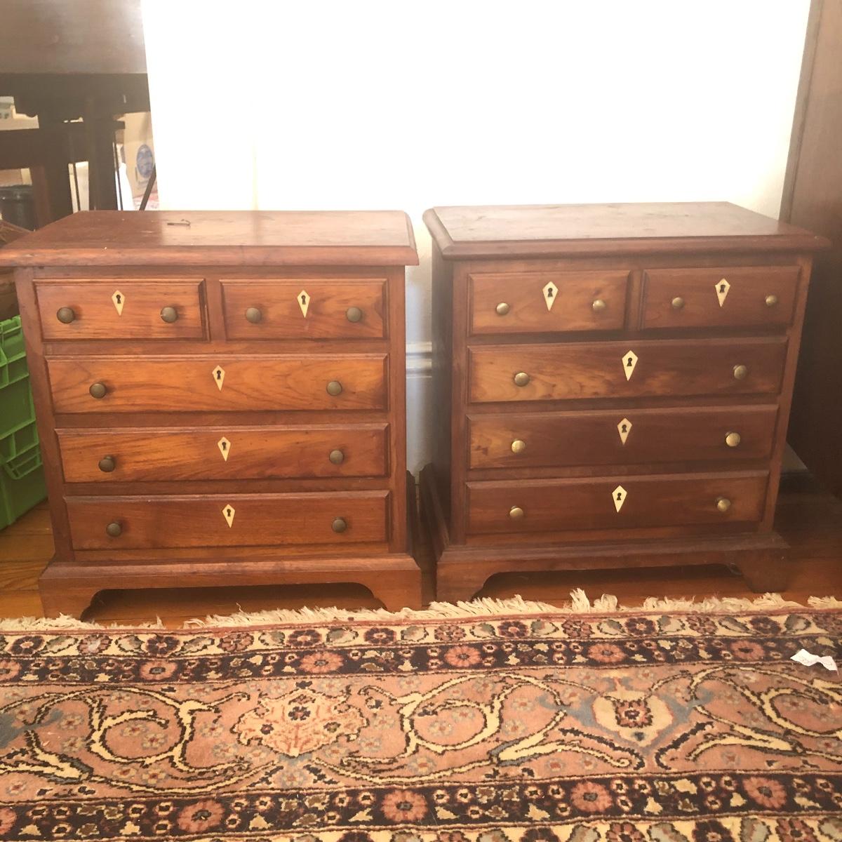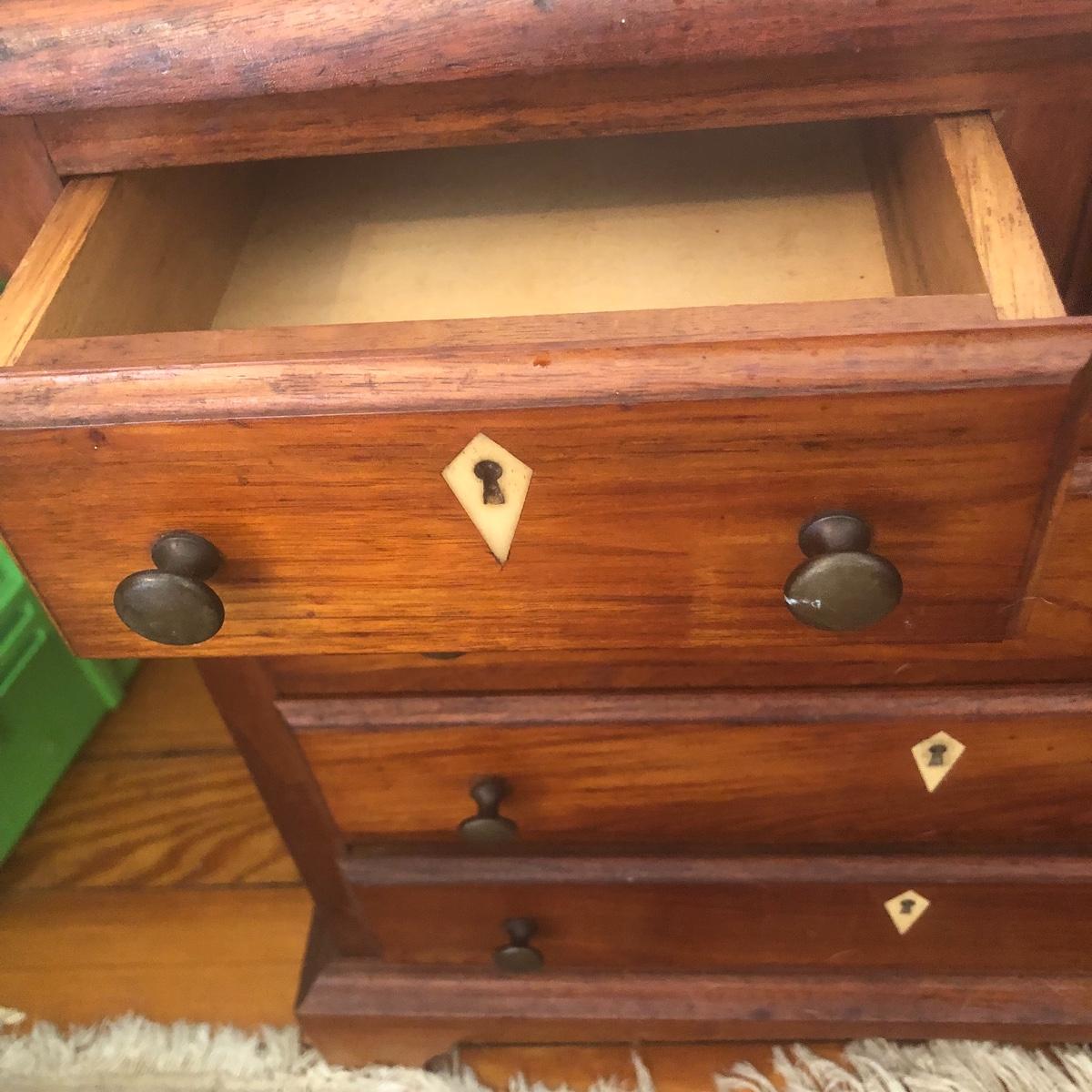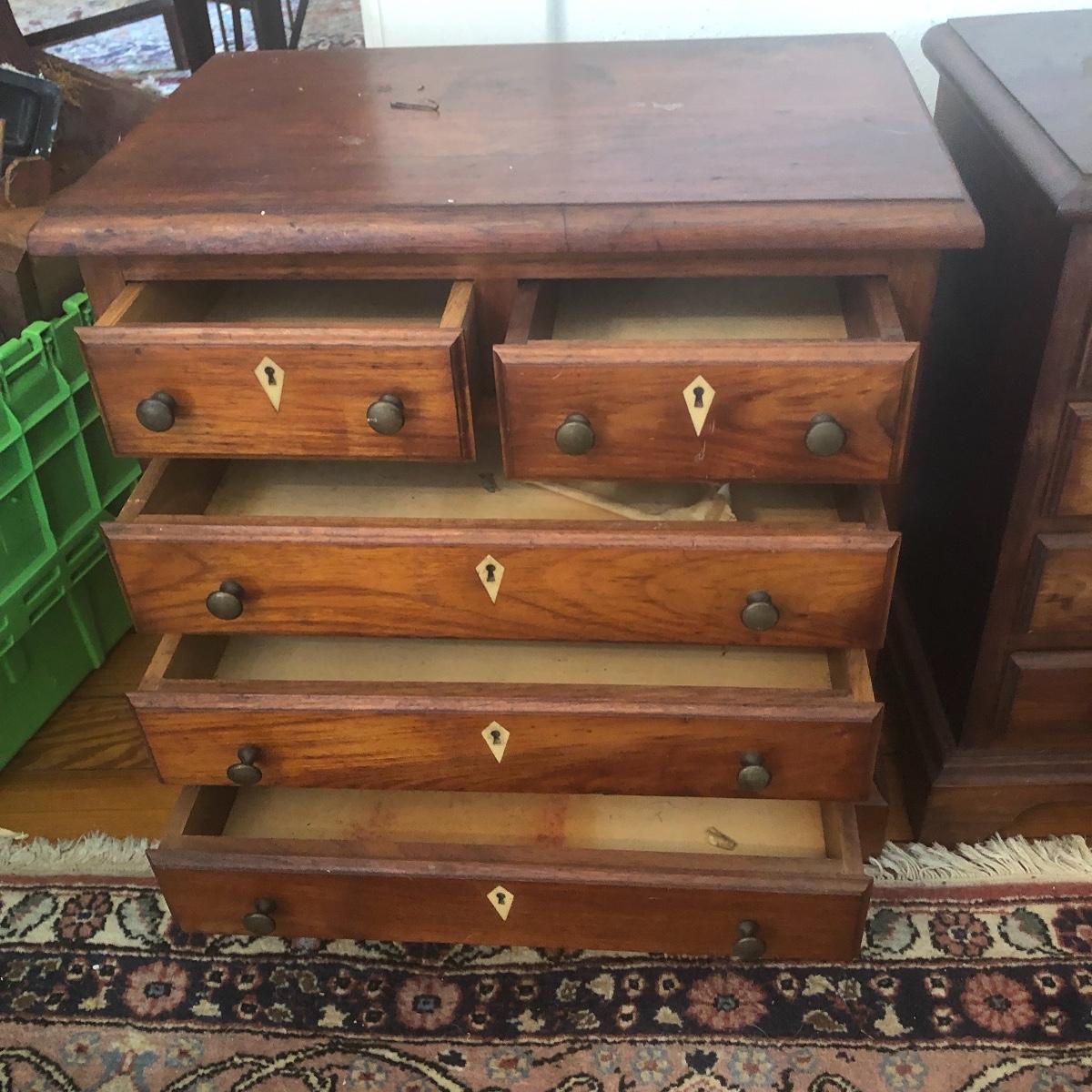 This pair of antique small chest of drawers each have five drawers with dowel joints and with key holes on each (no keys) and metal pulls. They are identical except for one has a slightly darker finish. They are in good condition with just a few blemishes on top surface and measure 11” x 18” x 19”.
