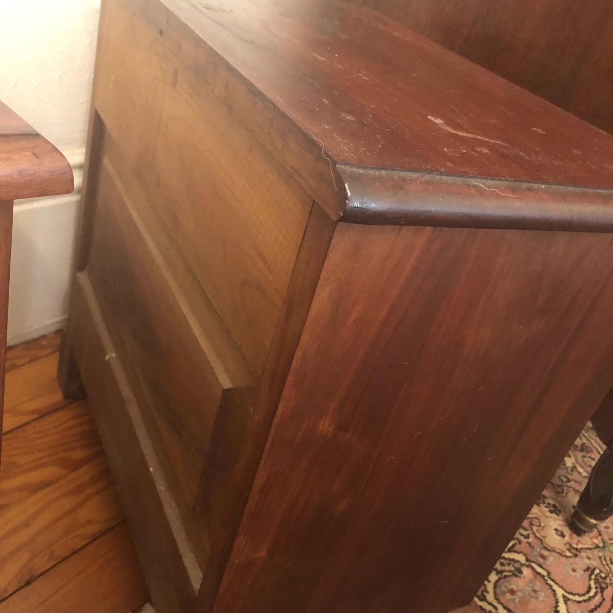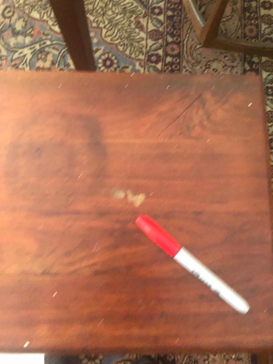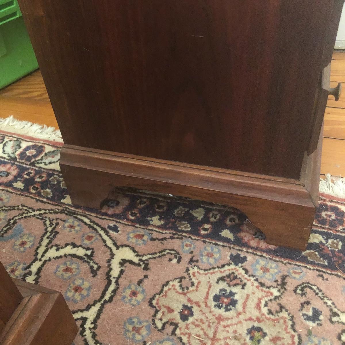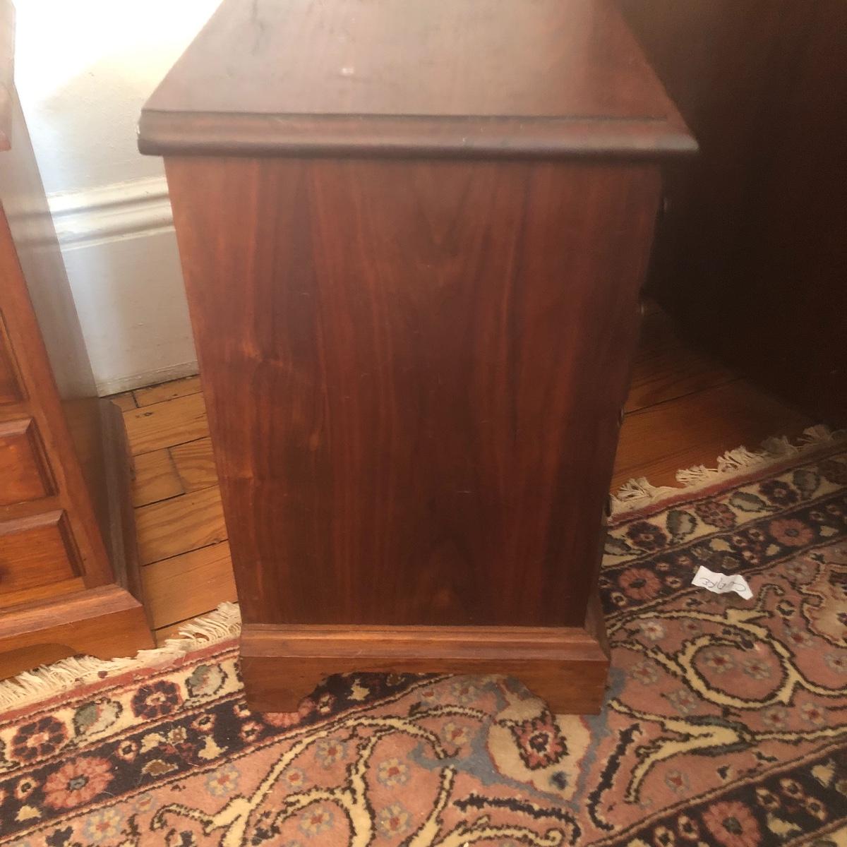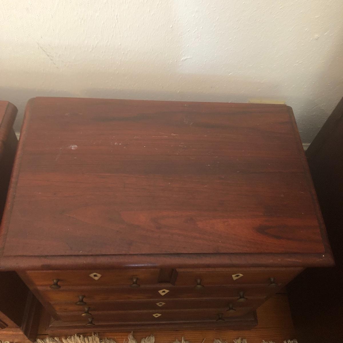 This pair of antique small chest of drawers each have five drawers with dowel joints and with key holes on each (no keys) and metal pulls. They are identical except for one has a slightly darker finish. They are in good condition with just a few blemishes on top surface and measure 11” x 18” x 19”.