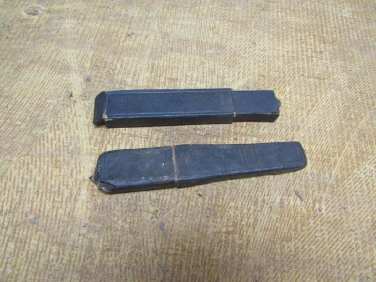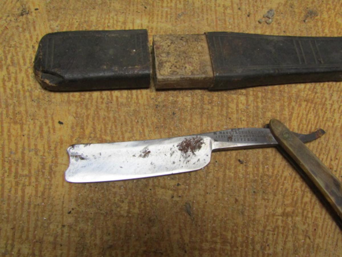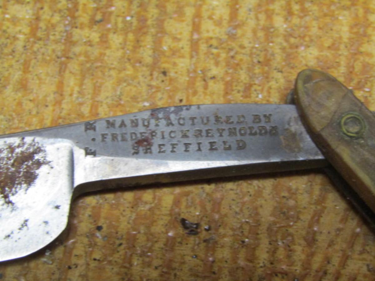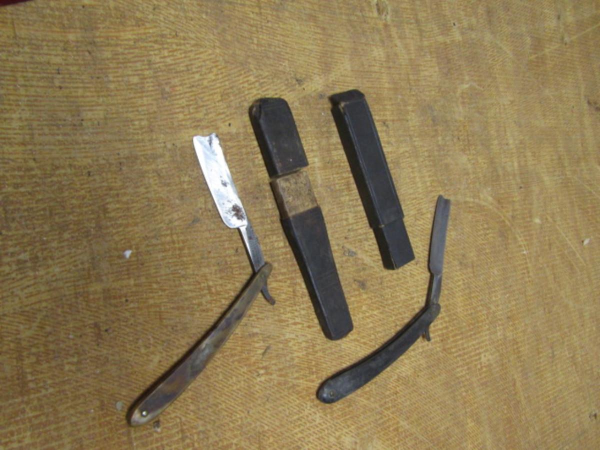 Pair of Antique Straight Razors. One is Frederick Reynolds Sheffield. Stored in non-climatized basement so expect item may need to be cleaned from dust, insects, etc. Shipped in as is condition
