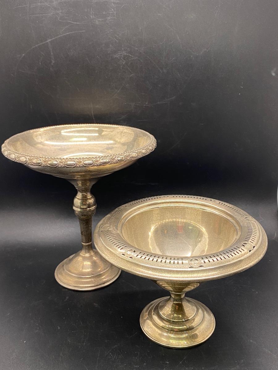Pair of antique weighted sterling silver compotes. Pedestal style base. One about 6" one about 4" tall. In overall good condition, may have a small ding here or there. Both are marked on the bottom.