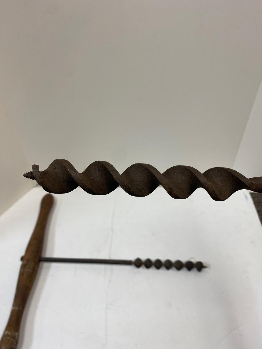 Pair of Antique Wood Handle Screw Tip Auger Drill Bits. In very good antique condition. Useable or great for display.