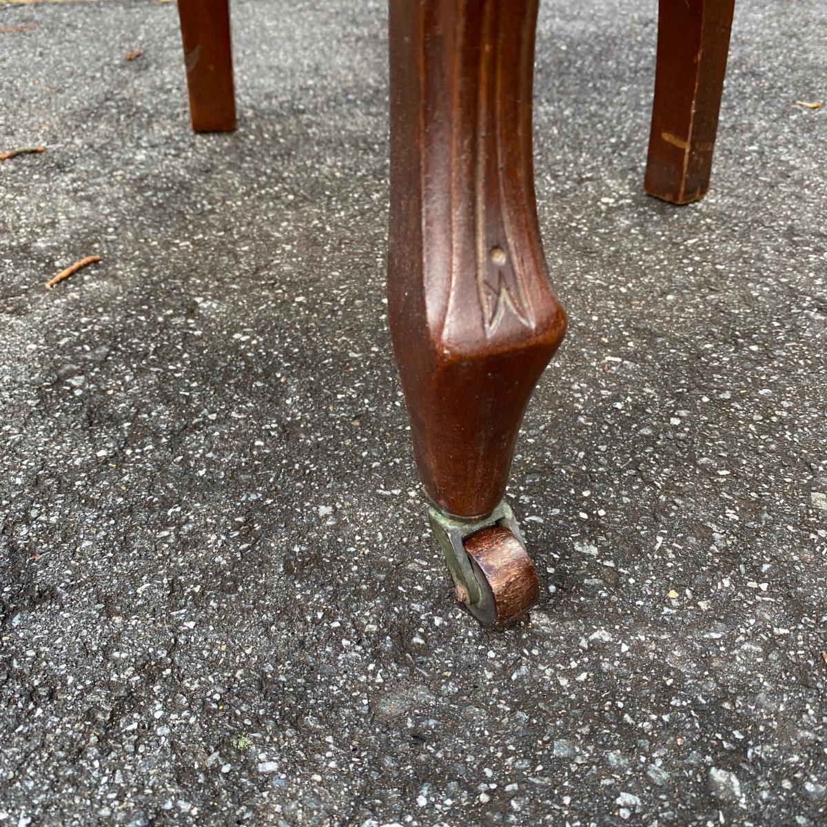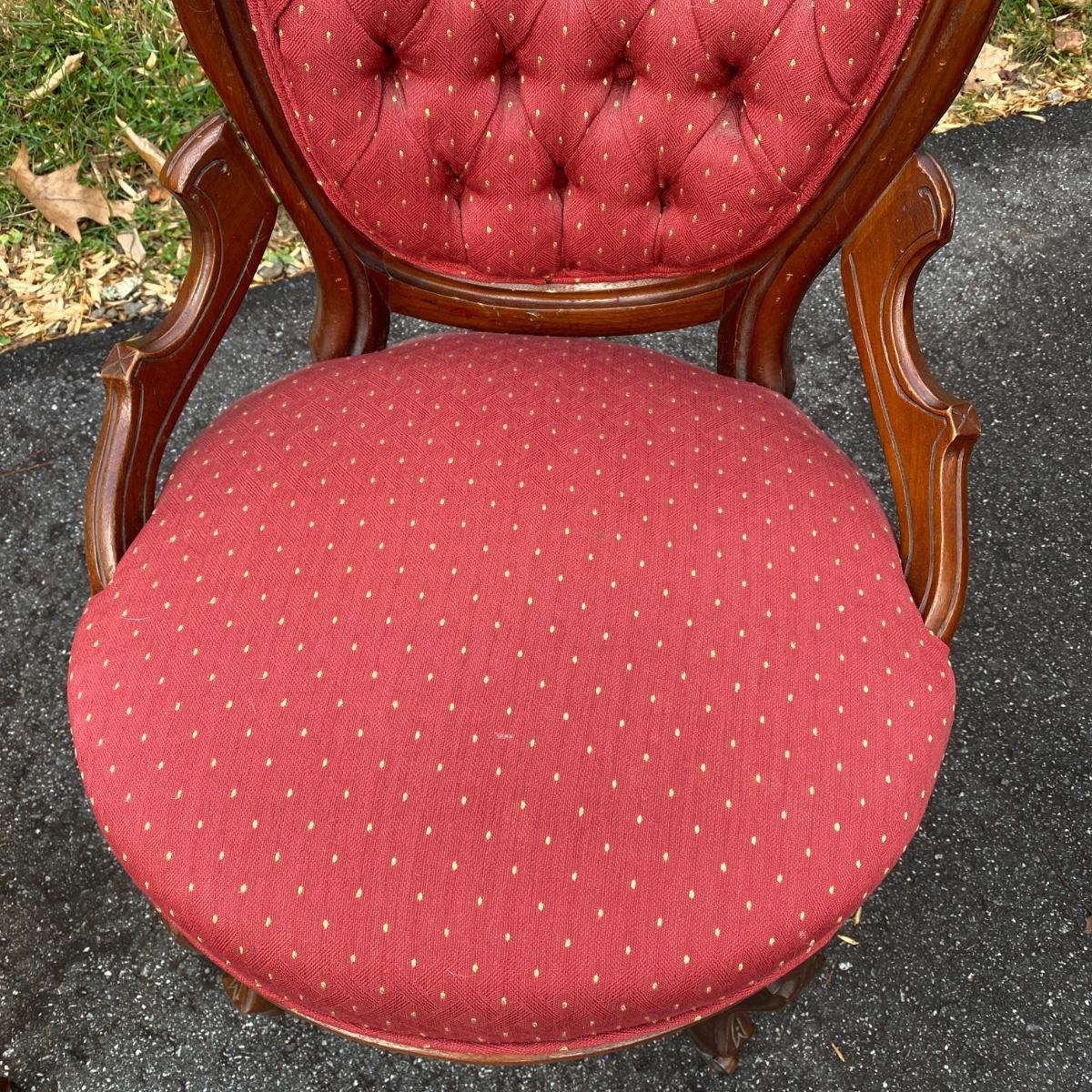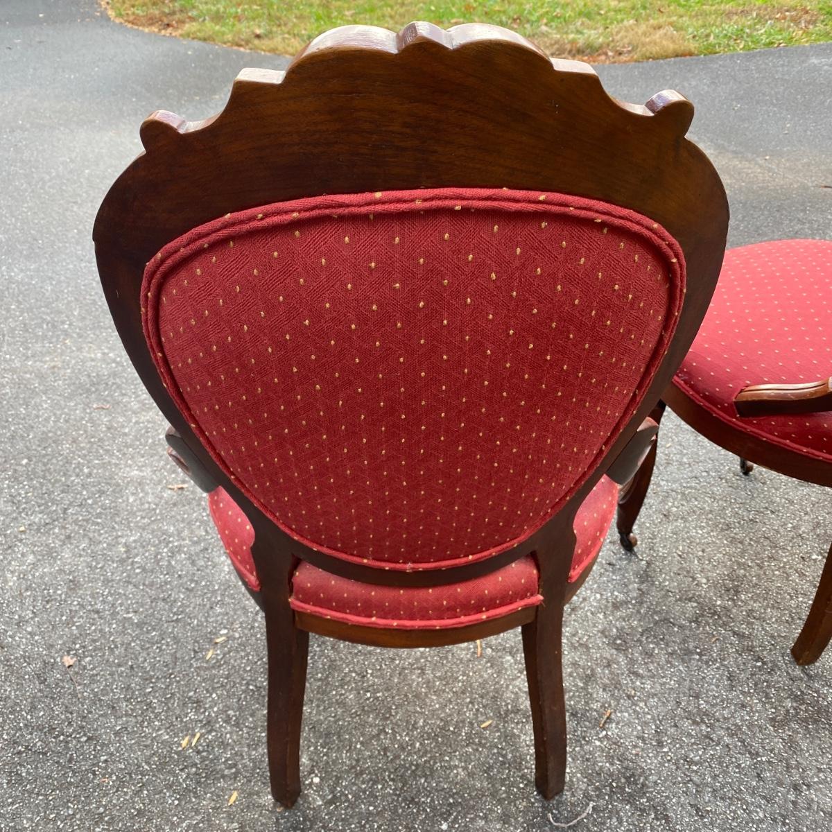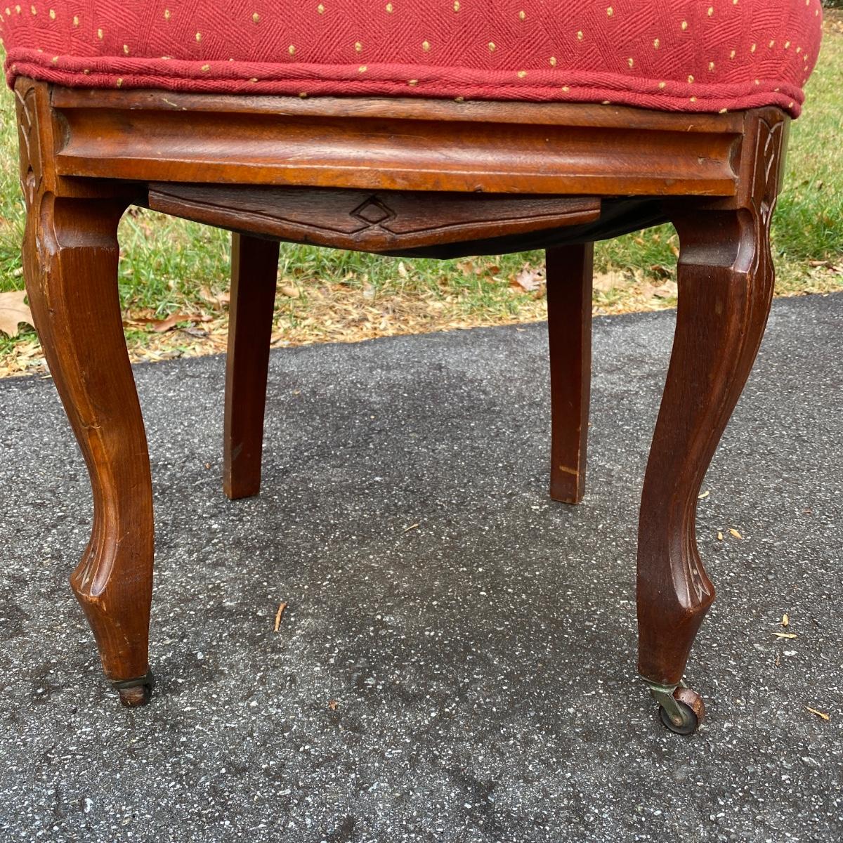 Two antique wood chairs with cushioned seat and back and front casters. Seat cushions have springs. Nice carved wooden design on top. Chairs measure 20” x 17” x 38” with a seat height of 19”. There is a slight separation in the wood connection to the back. It is not currently hampering the chair sturdiness. Should be able to reconnect easily. They are overall in good condition.