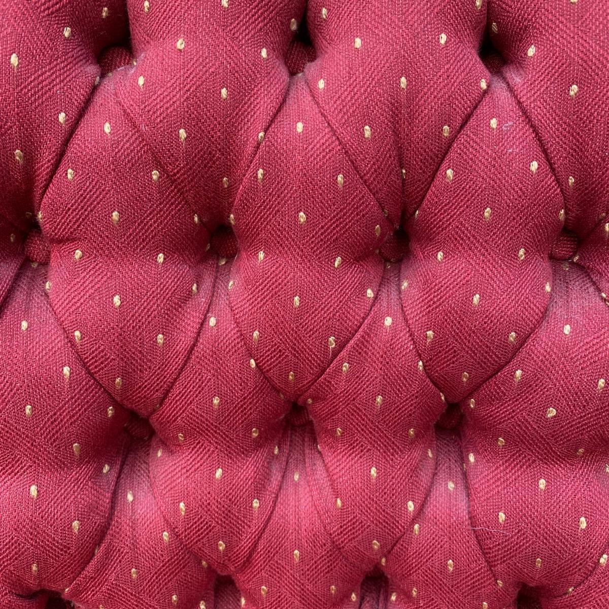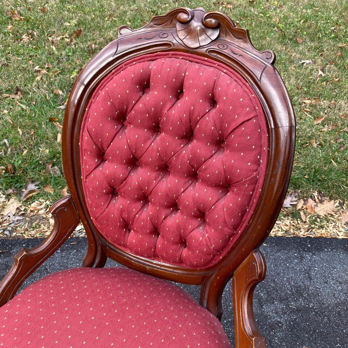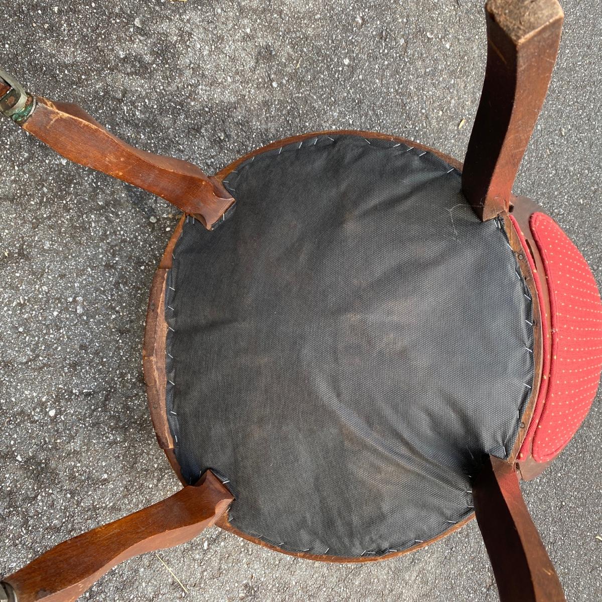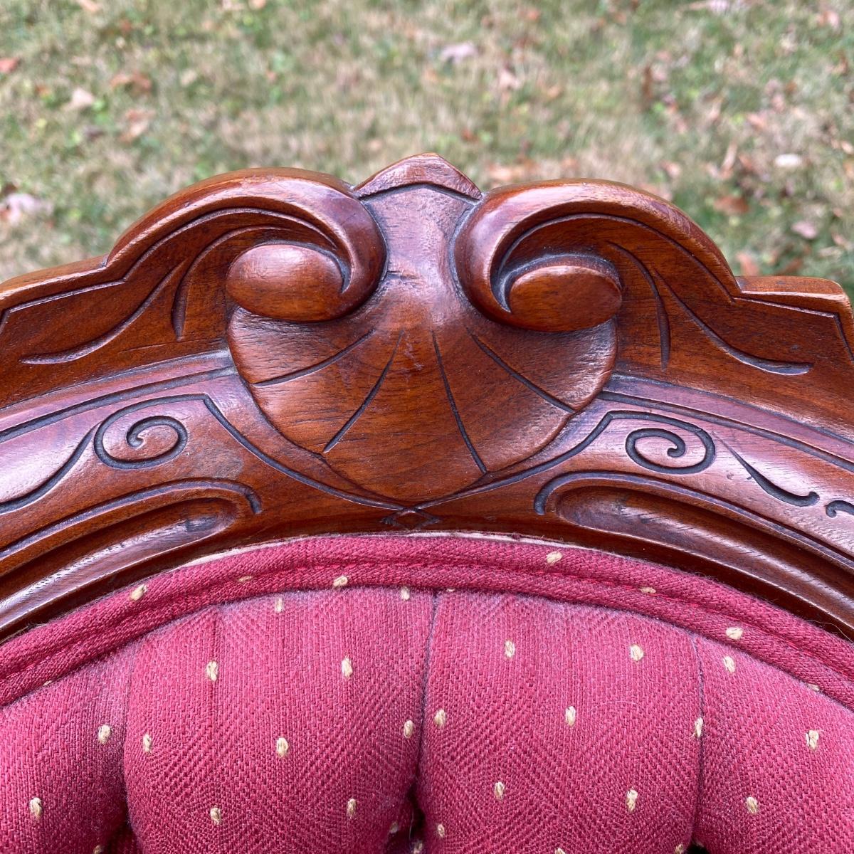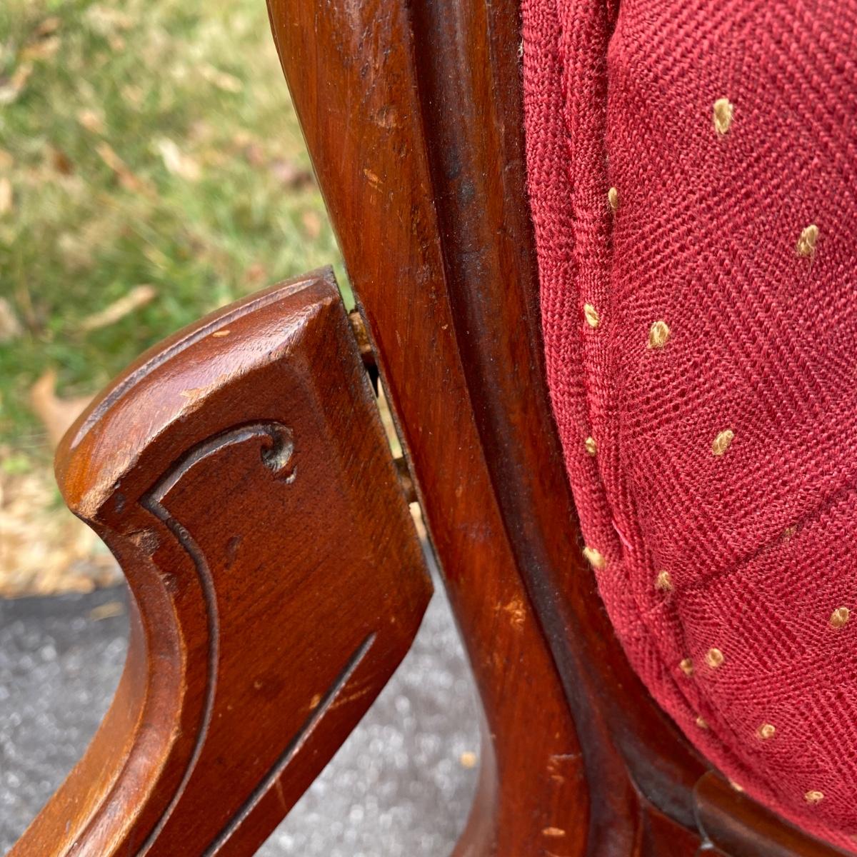 Two antique wood chairs with cushioned seat and back and front casters. Seat cushions have springs. Nice carved wooden design on top. Chairs measure 20” x 17” x 38” with a seat height of 19”. There is a slight separation in the wood connection to the back. It is not currently hampering the chair sturdiness. Should be able to reconnect easily. They are overall in good condition.