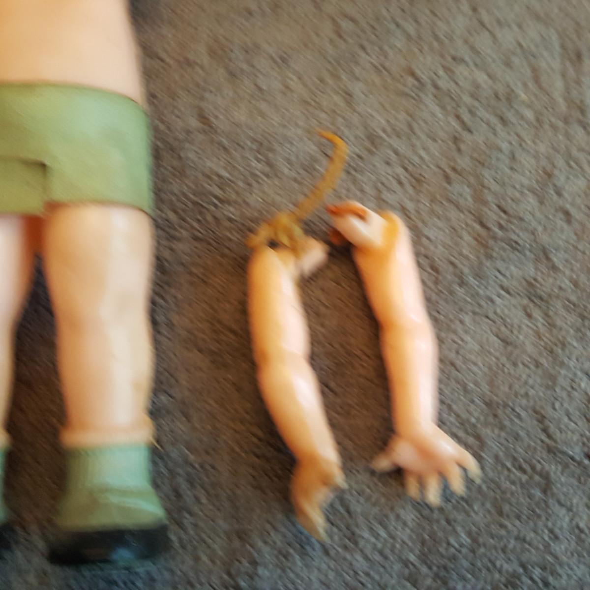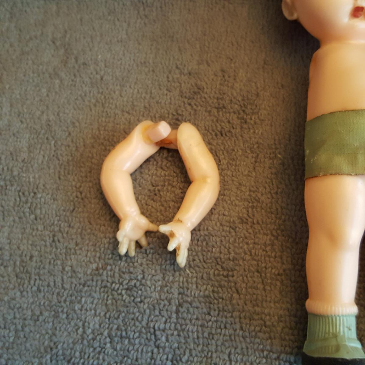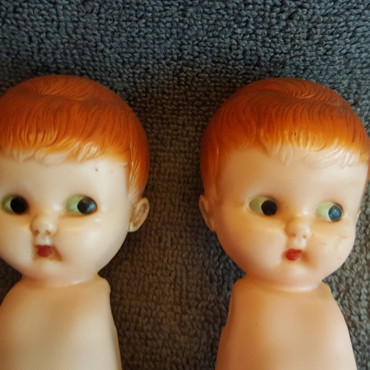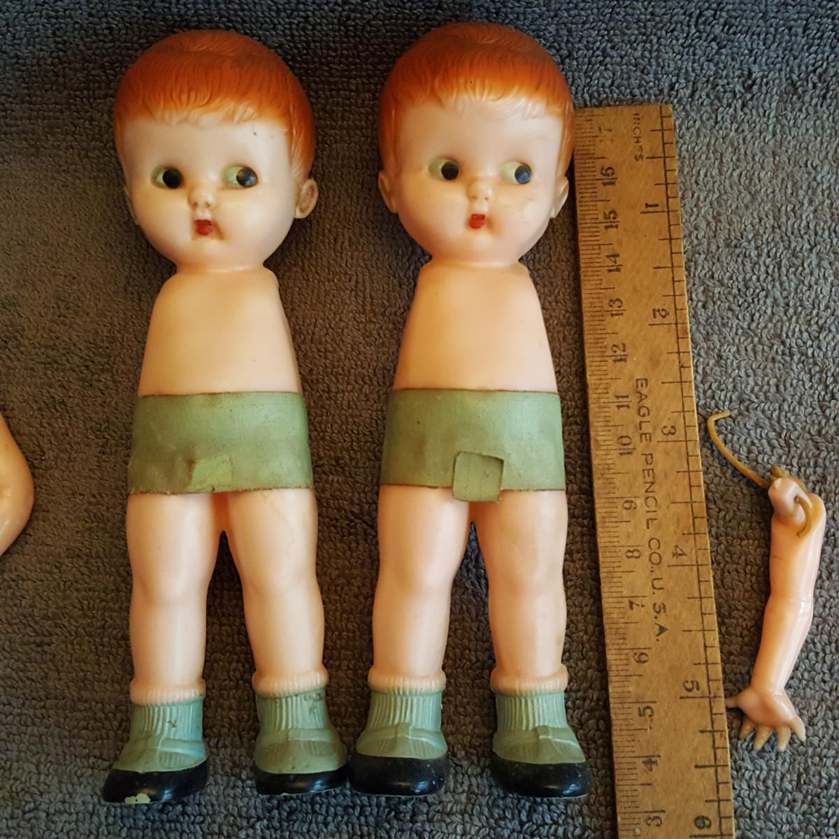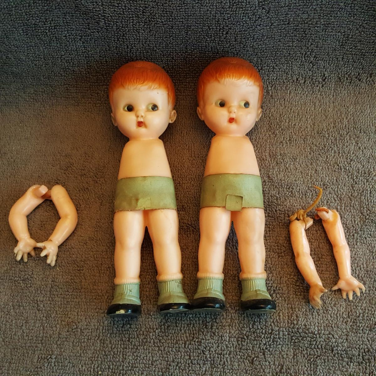 This auction lot is a Pair of Arm-less Twin Dolls. These dudes need some loving for sure. They are cute as a button and are marked Knickerbocker Plastic Company, Glendale, CA on the back. The arms are in the bag they just need to be restrung - which is easy if you know how. Google-search.