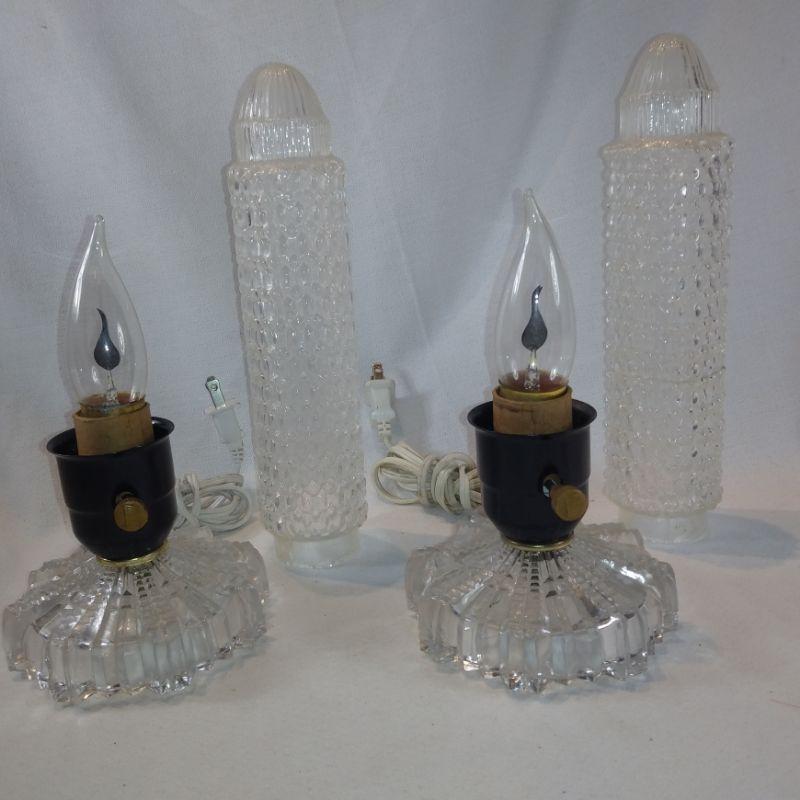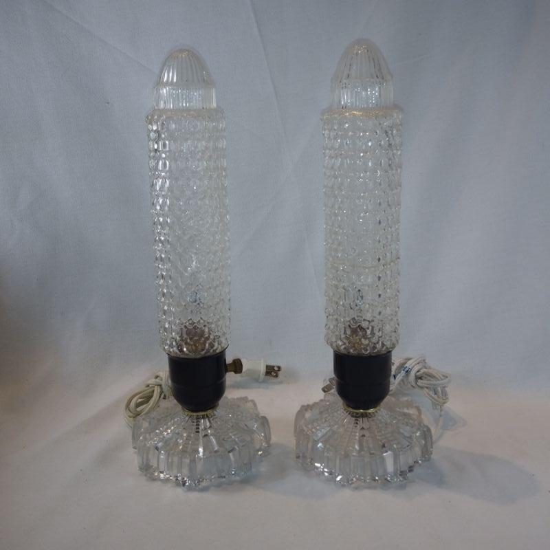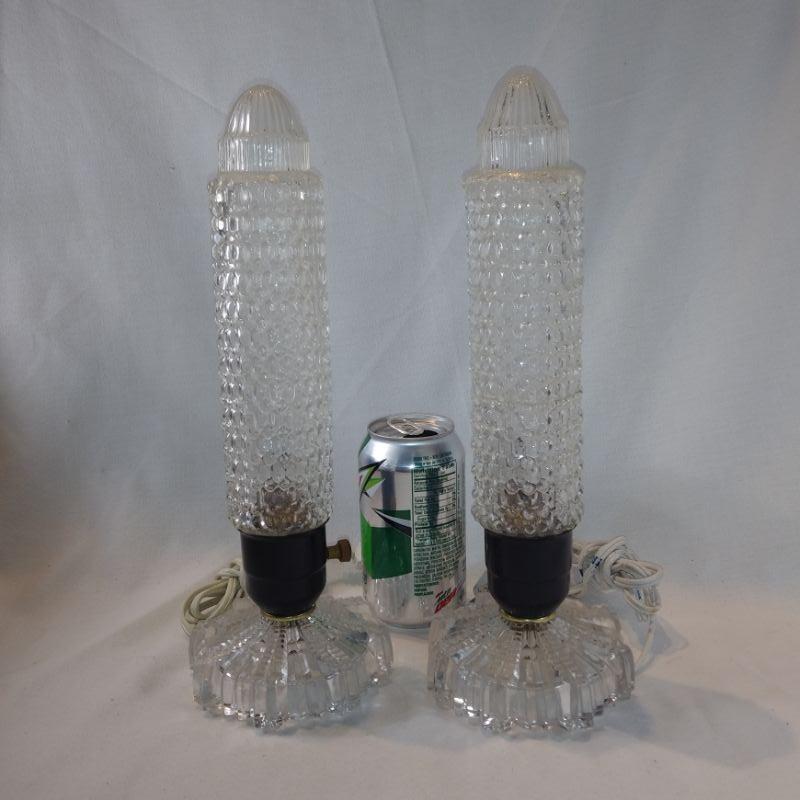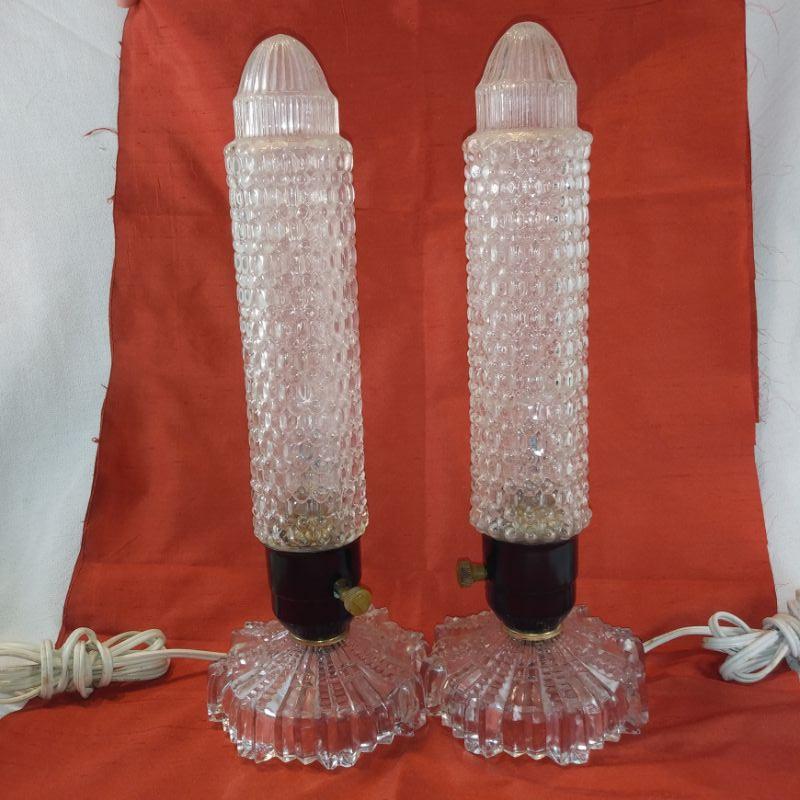 These very old Deco-style lamps are quite unusual. They stand 13-inches tall X 4-1/2-inches in diameter at base. The cords show they were rewired approximately 15 years ago. The bulbs inside are flicker bulbs, but you can replace with whatever type bulb you wish - standard socket. The lamp to the right has been repaired. Has a crack around the circumference about two thirds down but repaired very well. I didn't notice it until I got it in the photo area. These are very cool and working all the way.