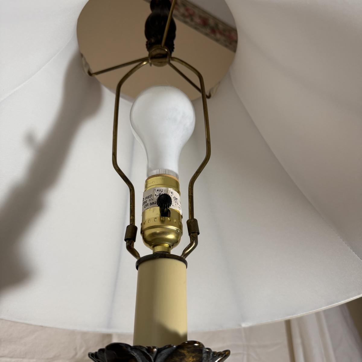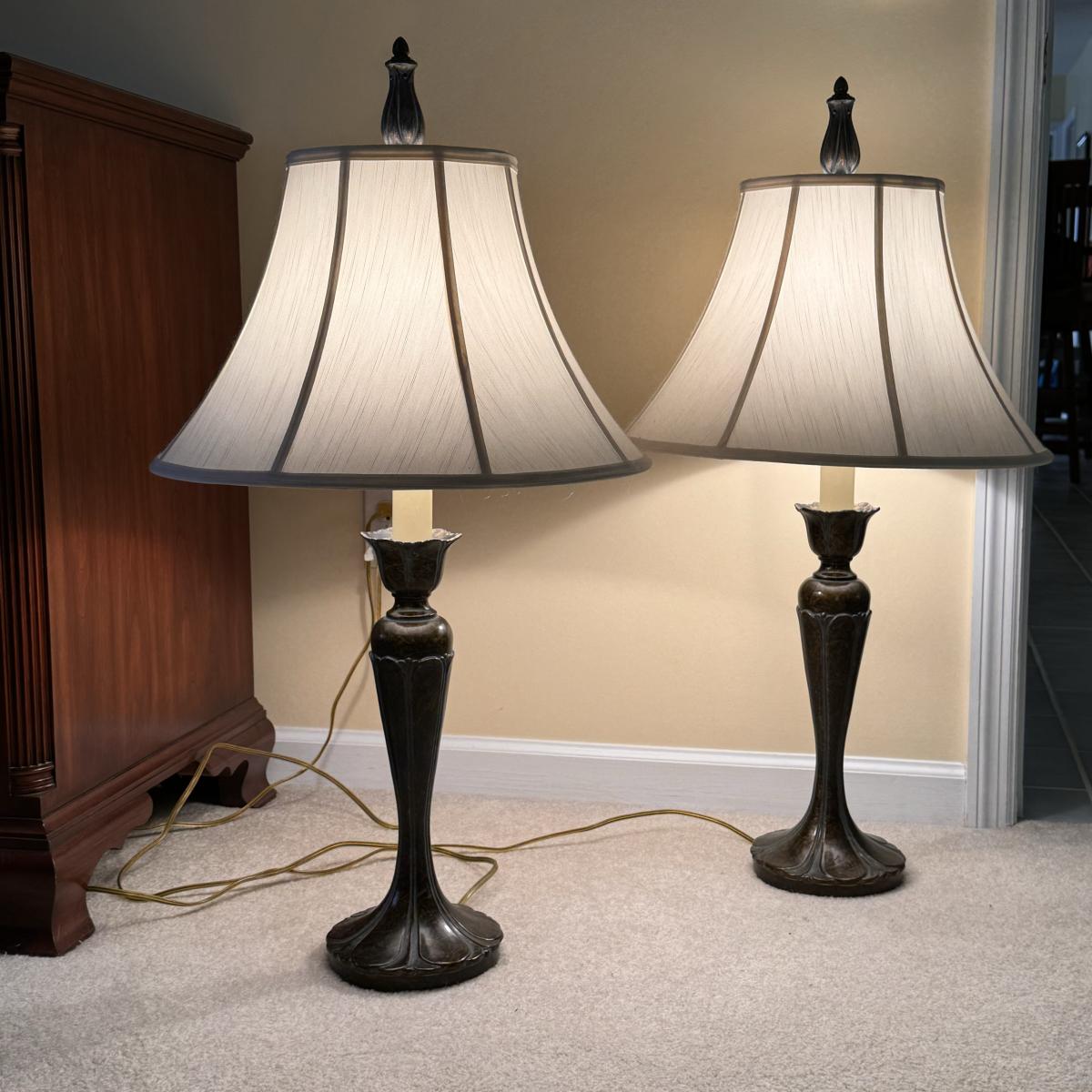 Lot includes two matching metal lamps that are an art nouveau style. Both lamps powered on when plugged in - see last picture included. The lamps, and the shades included, individually measure 17” x 35” H. Shipping available.