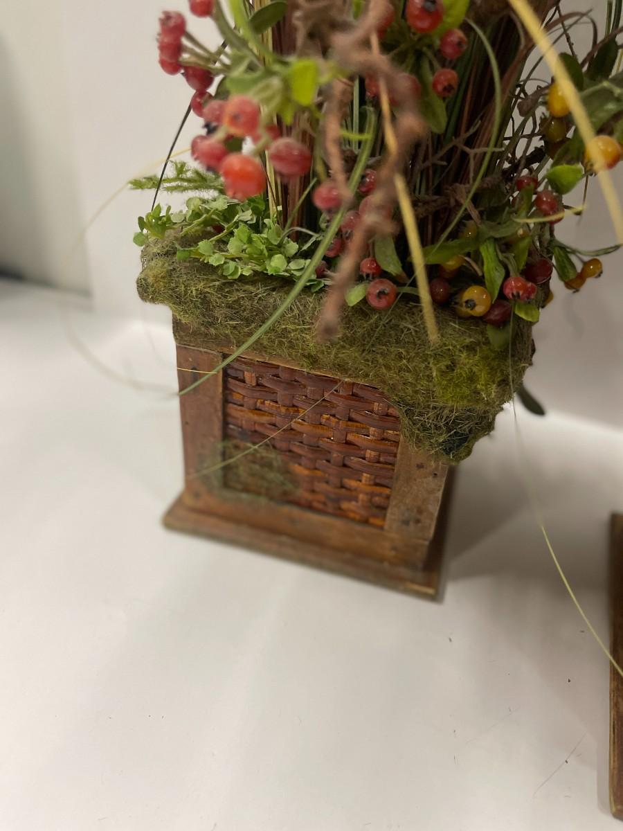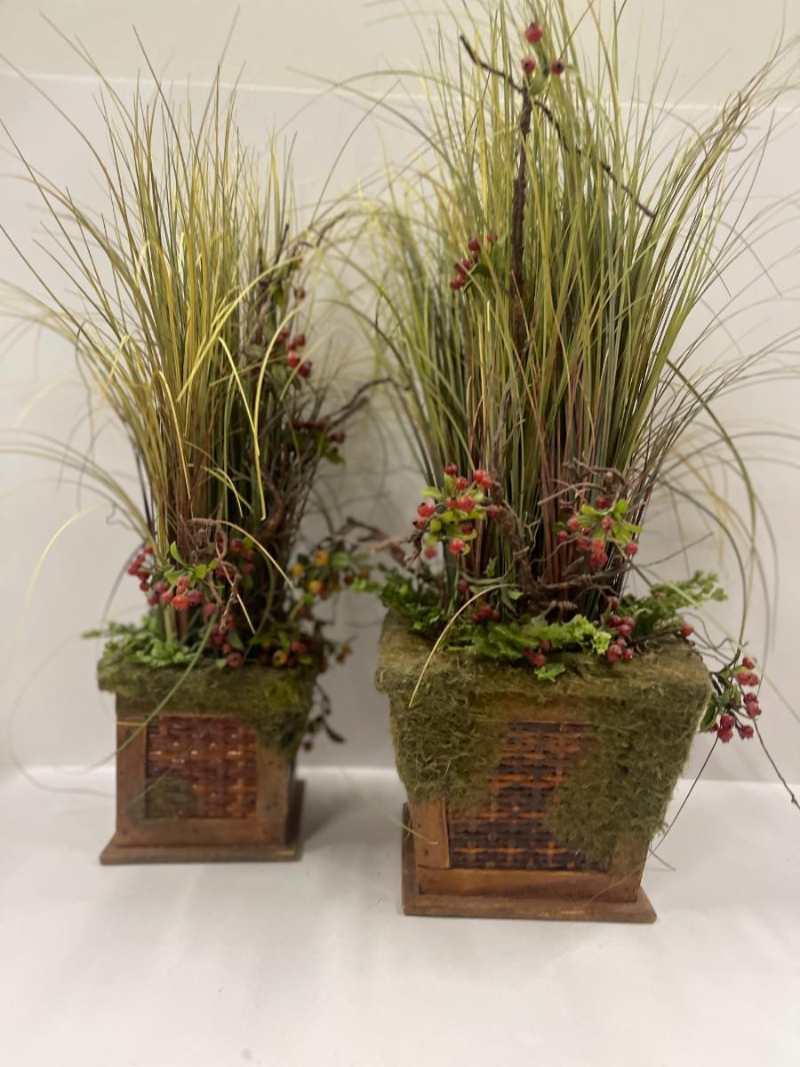 Pair of artificial grass plants in wooden planters. Approx 22" to the top of the grasses. One is 7" square and the other is 5". Very good condition.