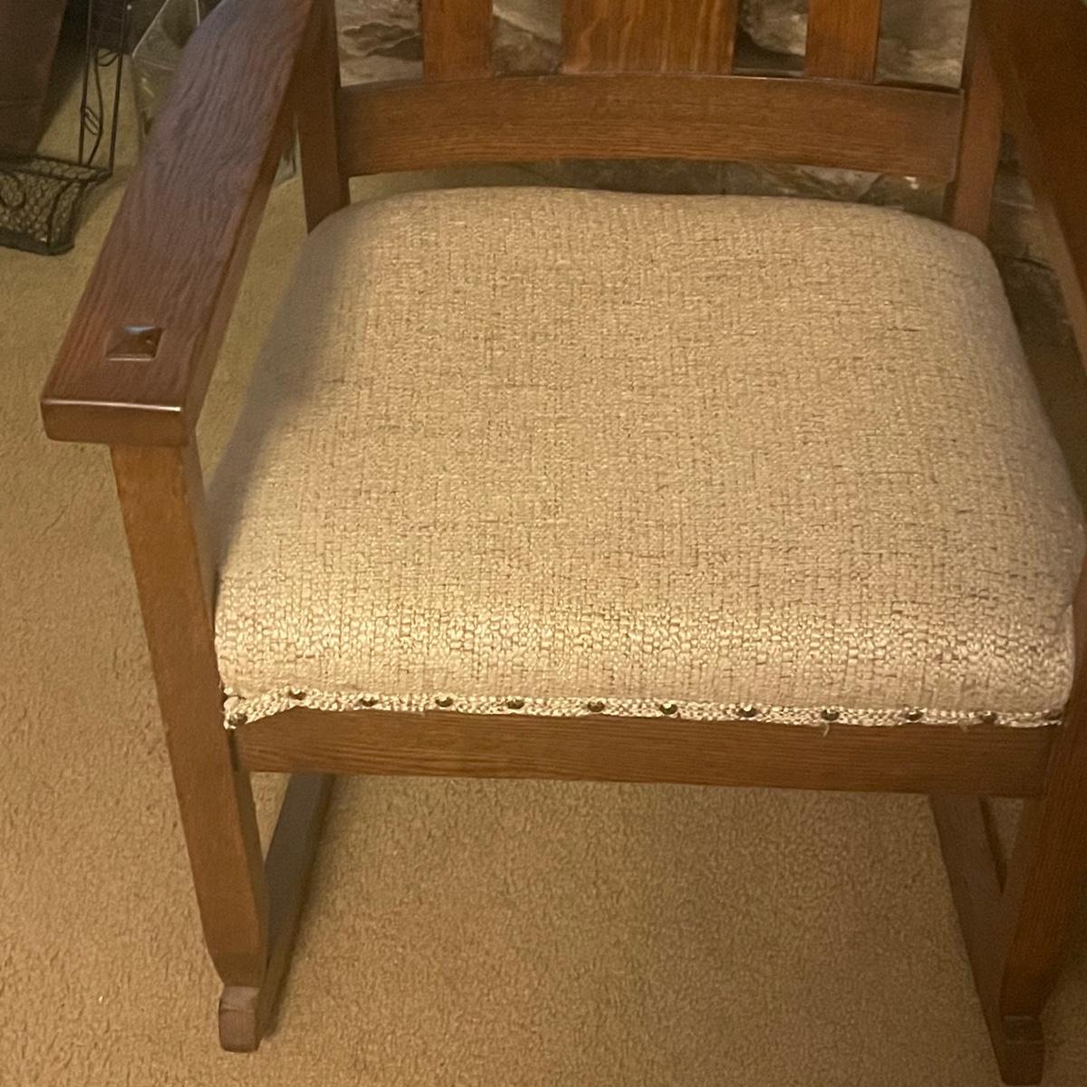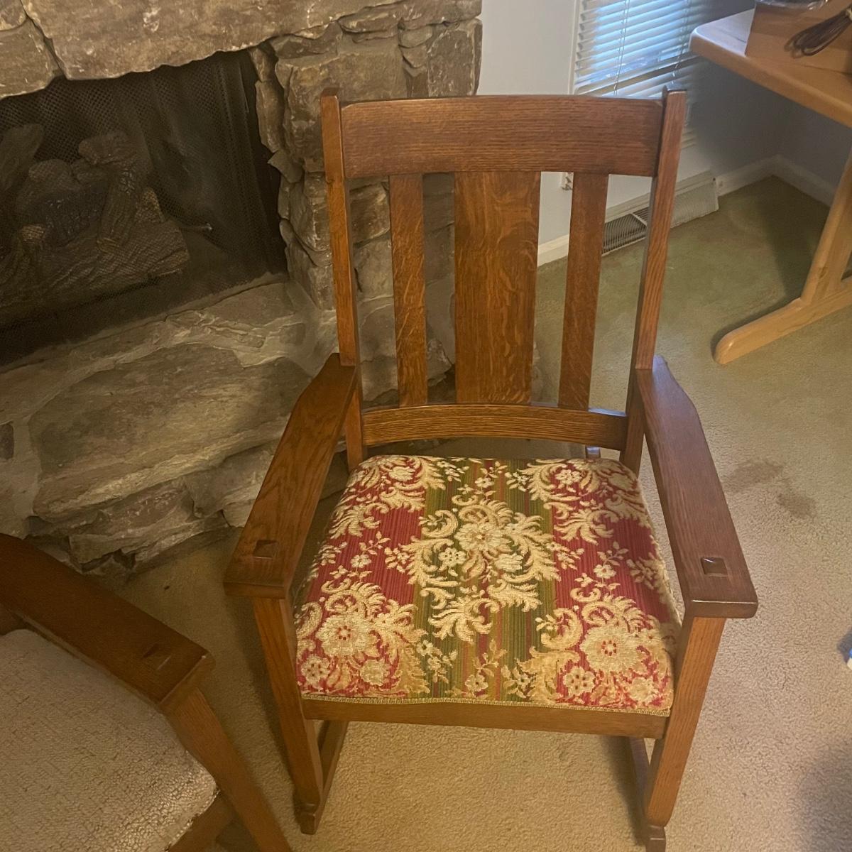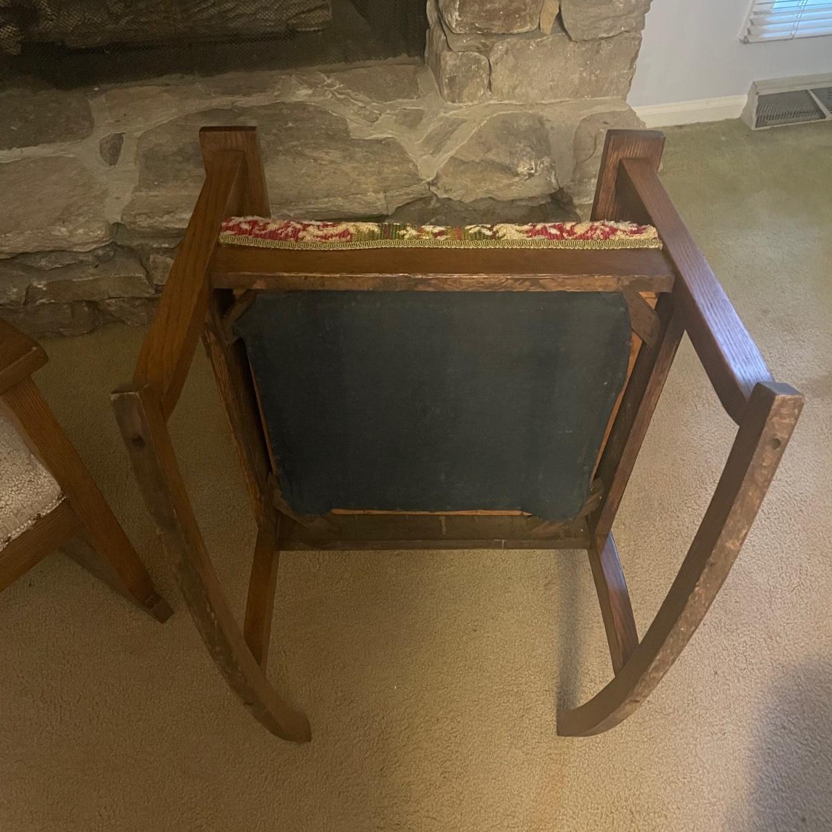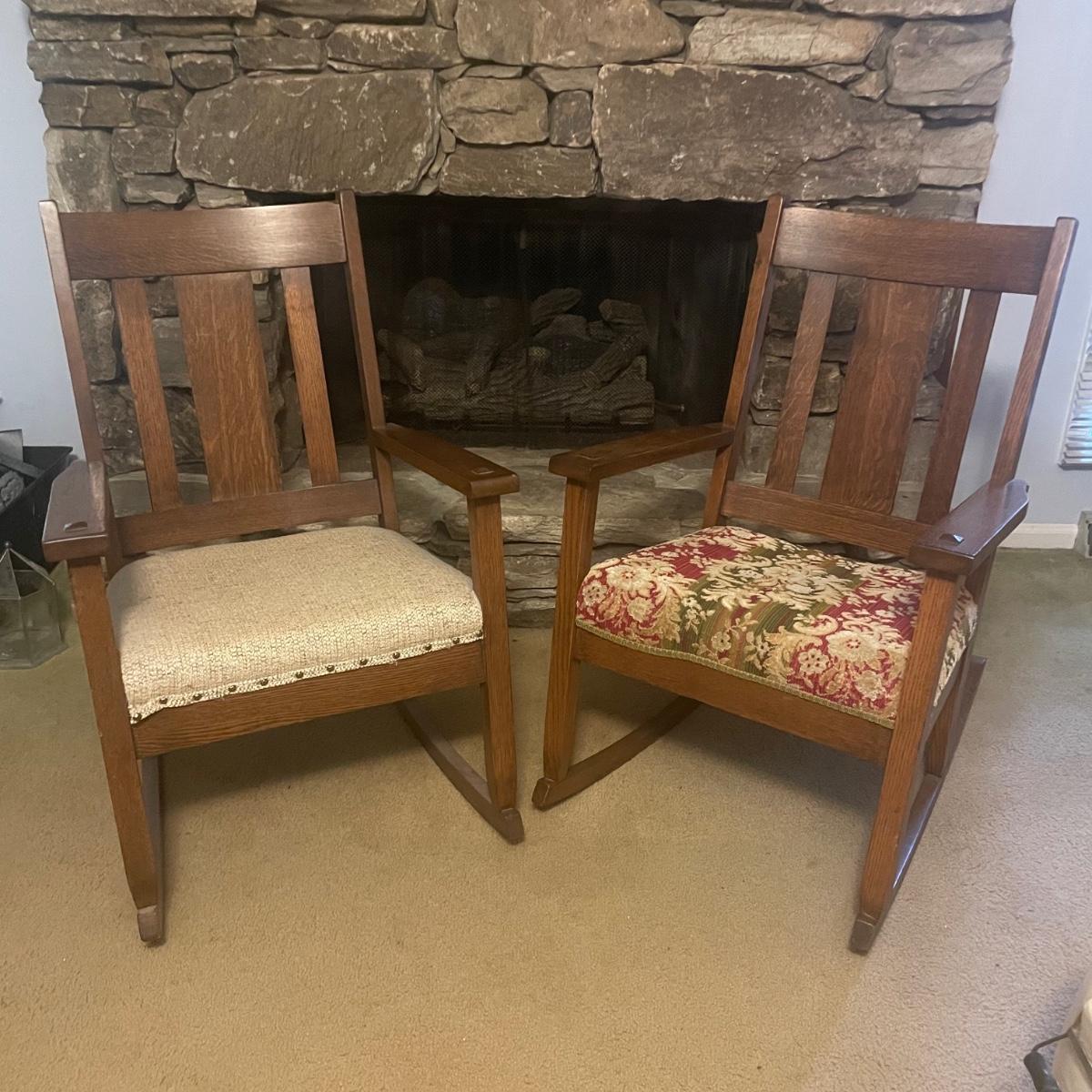 This matching pair of rockers are solid wood with upholstered seats; the upholstery and the undersides are the only difference as the frames of the chairs match one another. The cream colored seat is a woven wool like material, the other is a brocade style. Both are in very good condition and measure 24” wide x 33” deep x 36” tall with 17” seat heights.