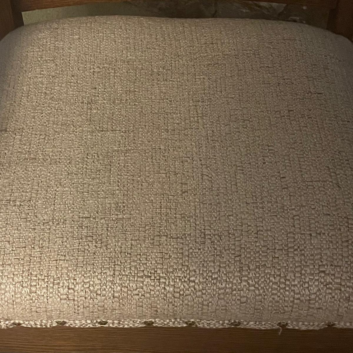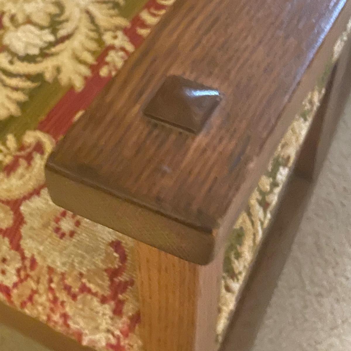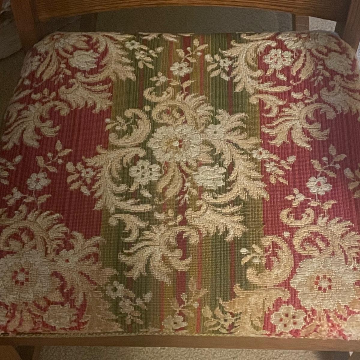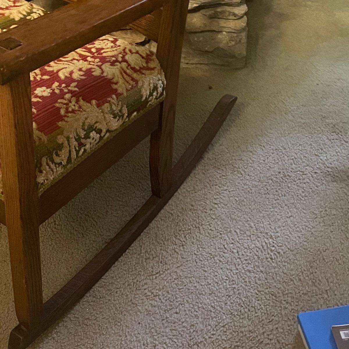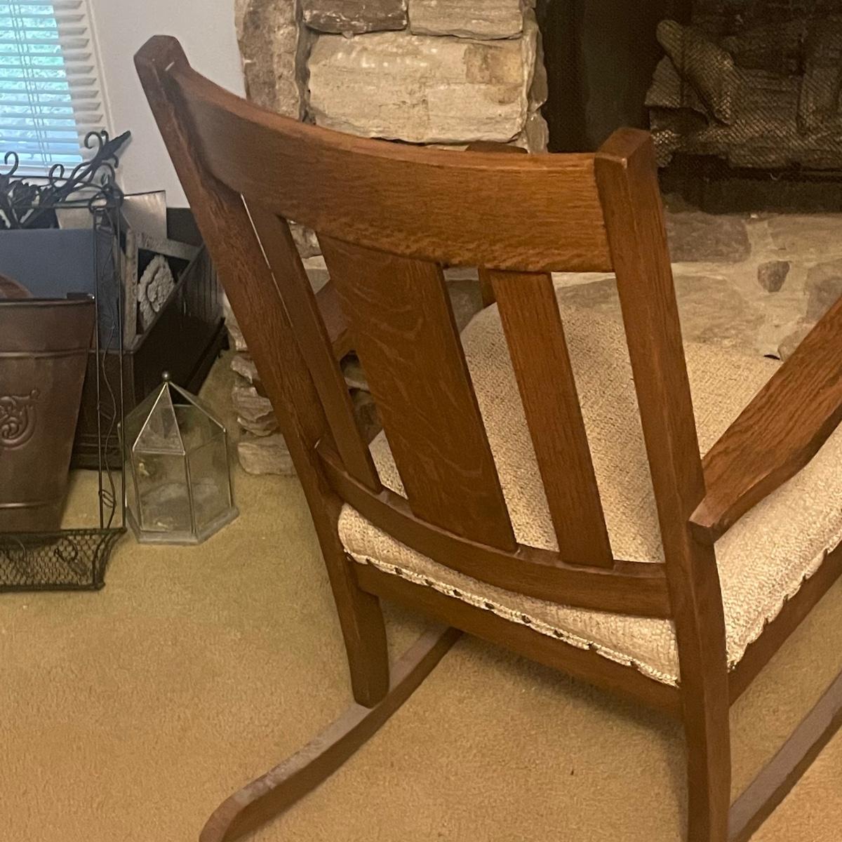 This matching pair of rockers are solid wood with upholstered seats; the upholstery and the undersides are the only difference as the frames of the chairs match one another. The cream colored seat is a woven wool like material, the other is a brocade style. Both are in very good condition and measure 24” wide x 33” deep x 36” tall with 17” seat heights.