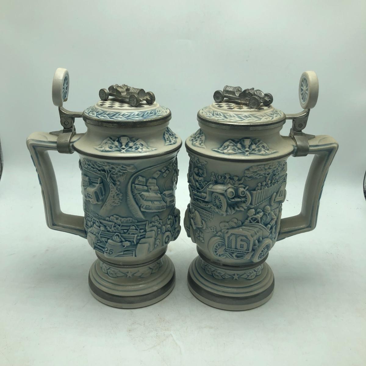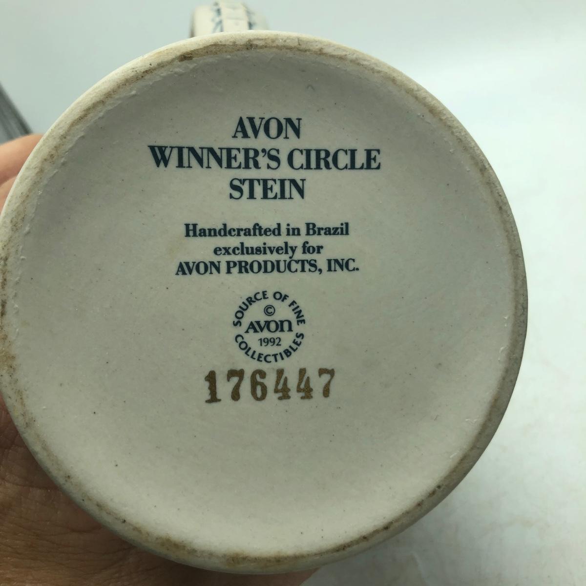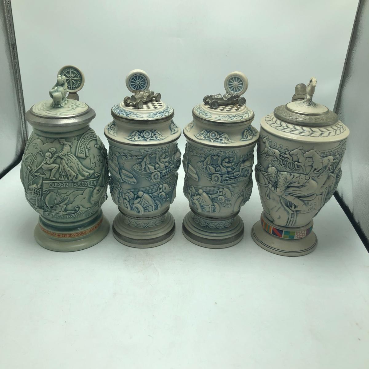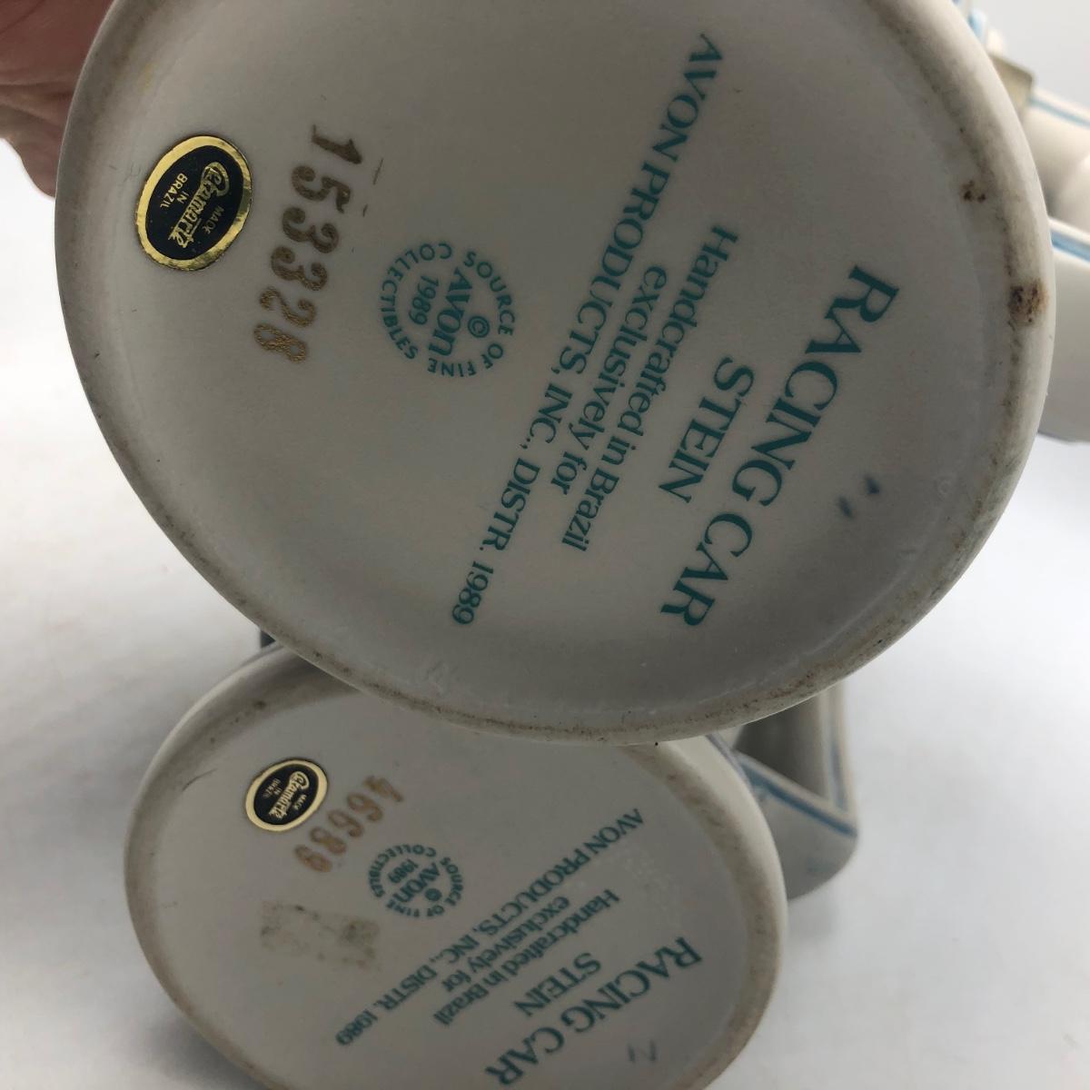 Lot includes two Avon Racing Car steins, Avon Winners Circle stein and a Avon Christopher Columbus New World stein. Largest stein measures 4” x 6” x 9.5”.
