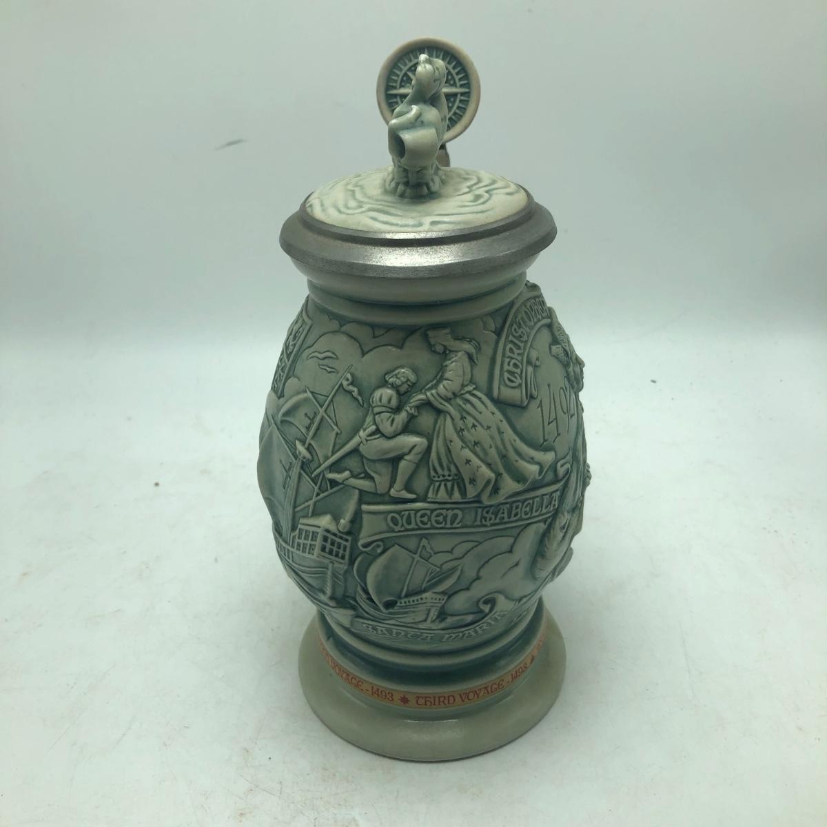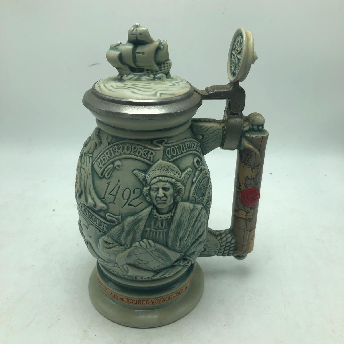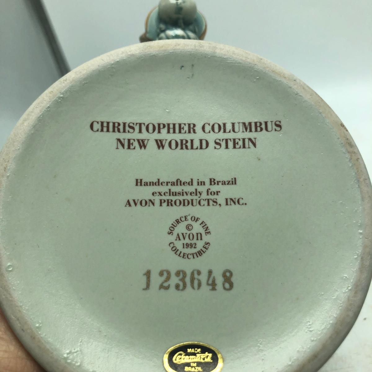 Lot includes two Avon Racing Car steins, Avon Winners Circle stein and a Avon Christopher Columbus New World stein. Largest stein measures 4” x 6” x 9.5”.