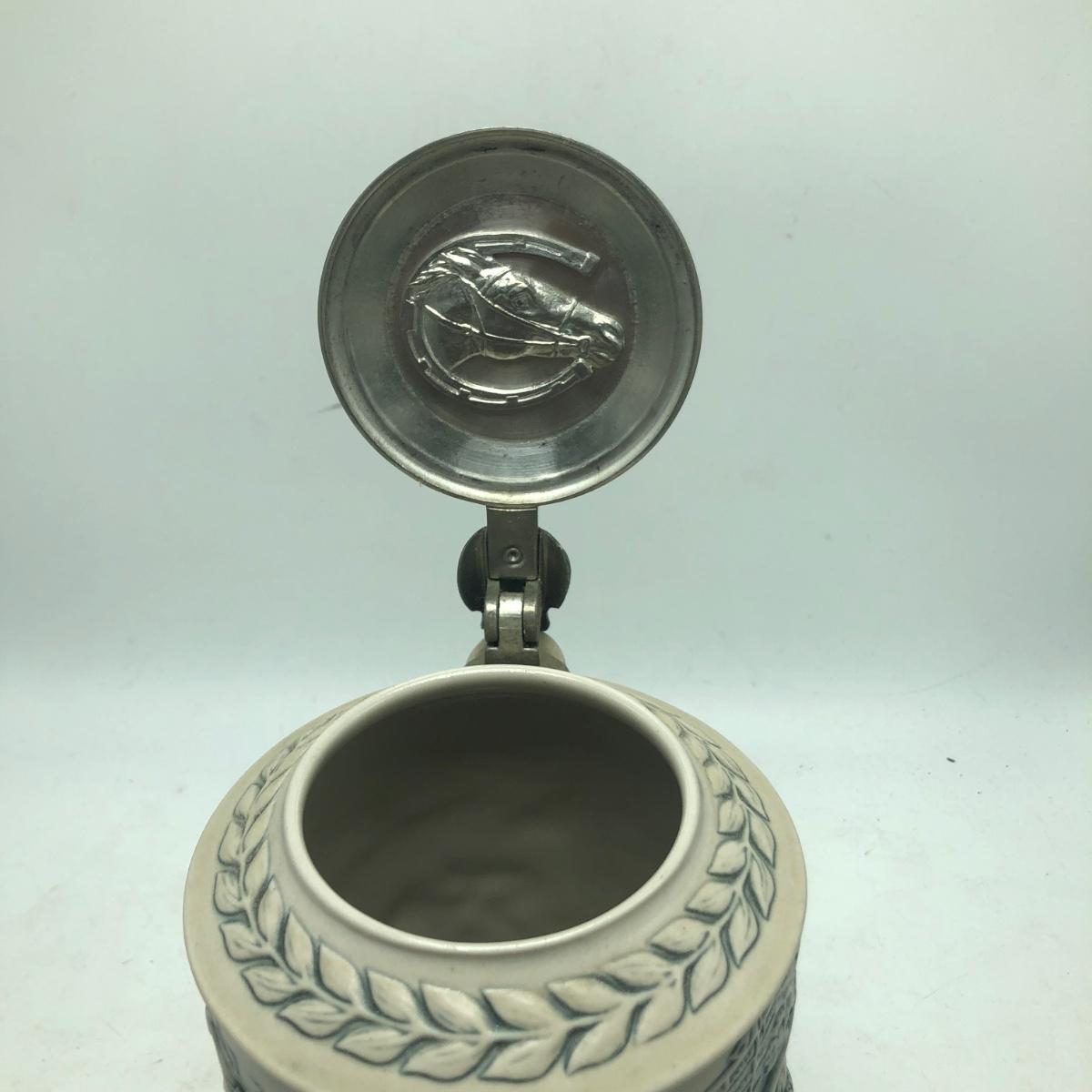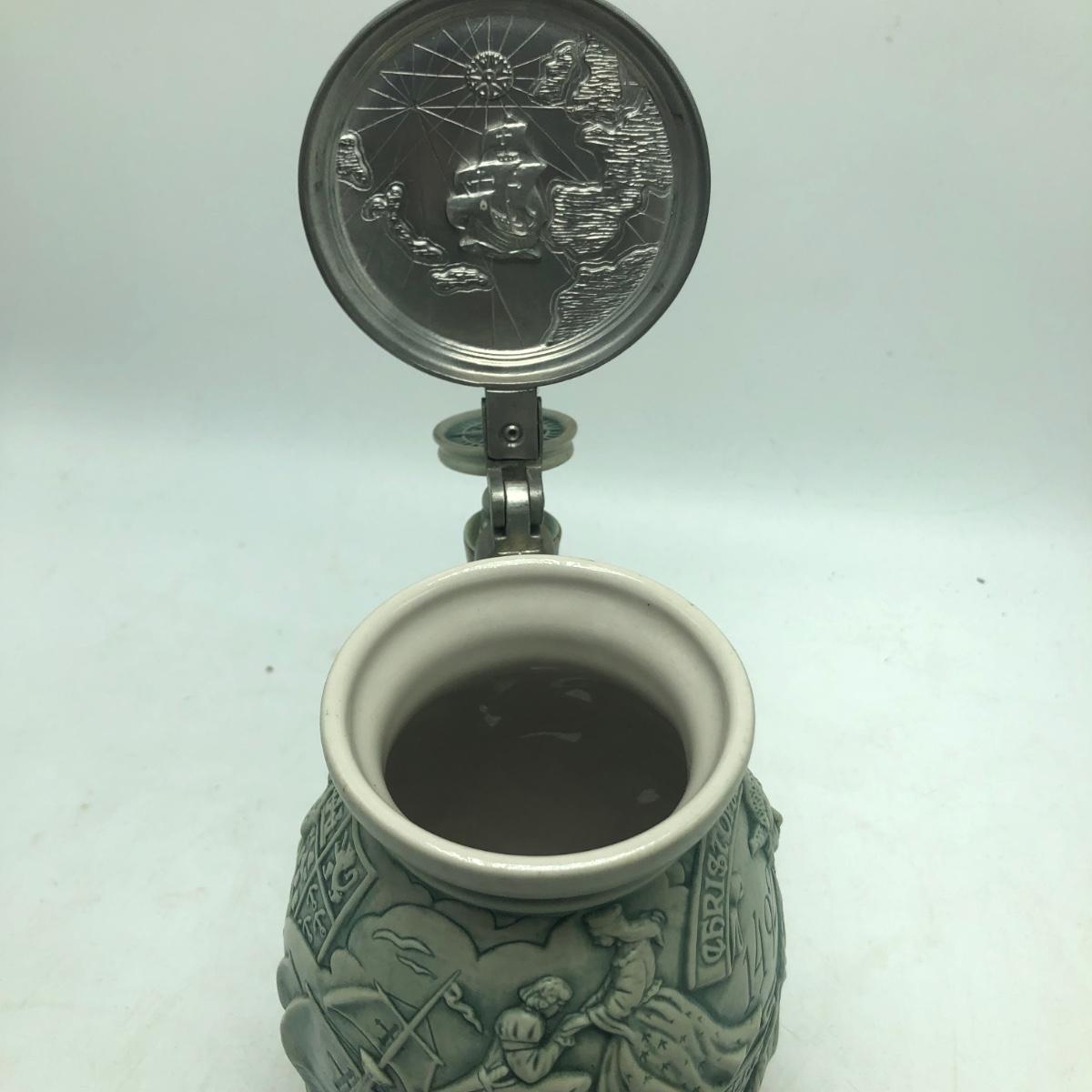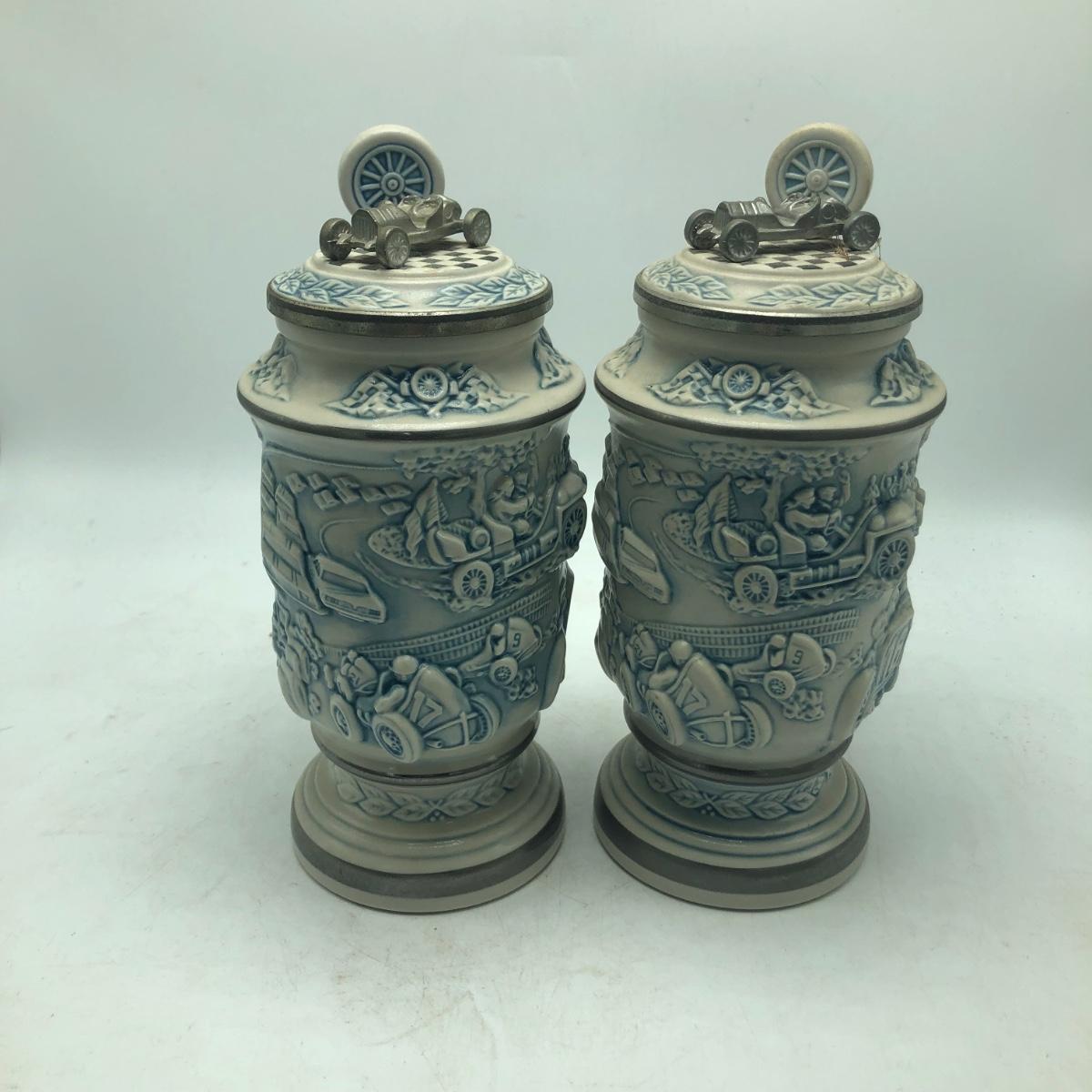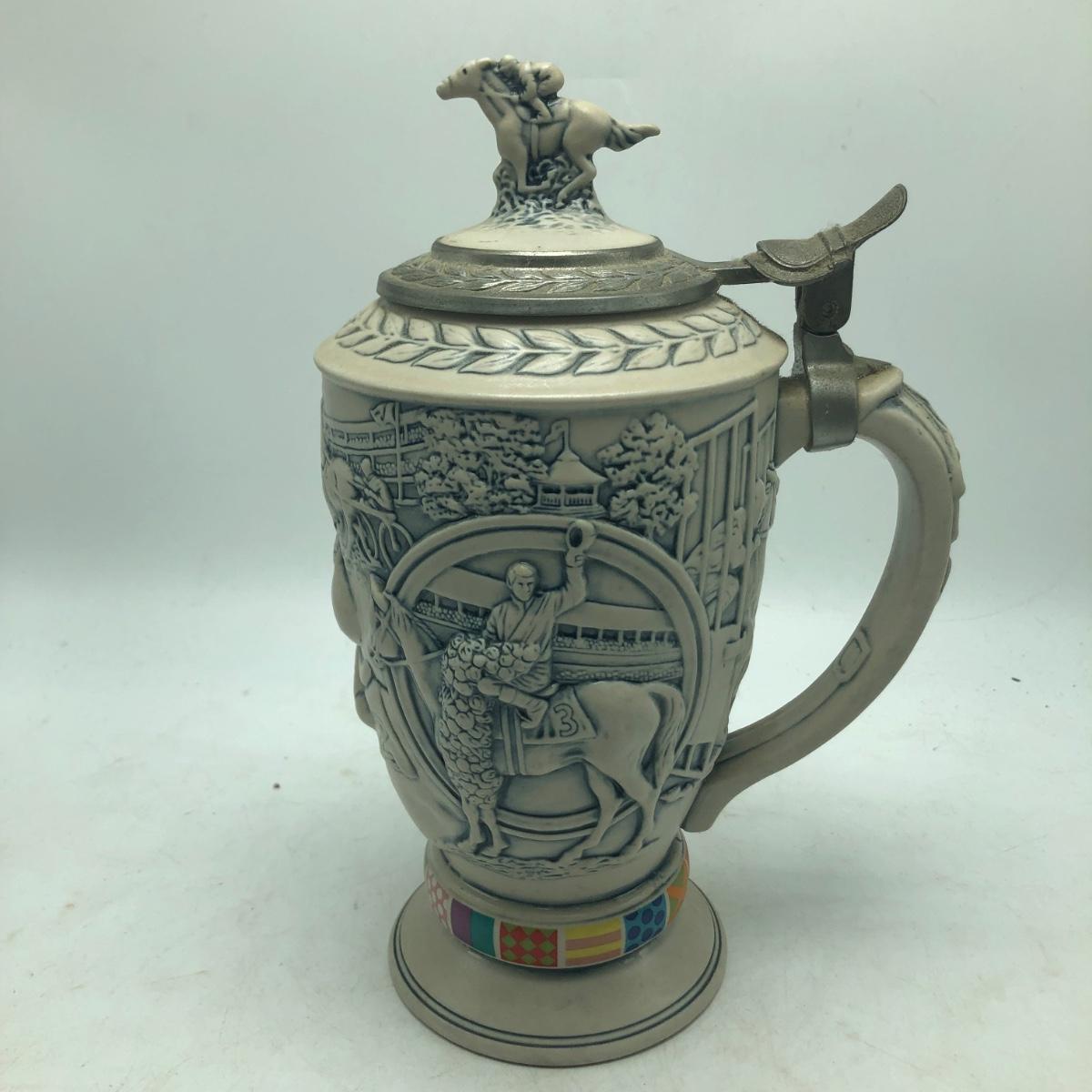 Lot includes two Avon Racing Car steins, Avon Winners Circle stein and a Avon Christopher Columbus New World stein. Largest stein measures 4” x 6” x 9.5”.