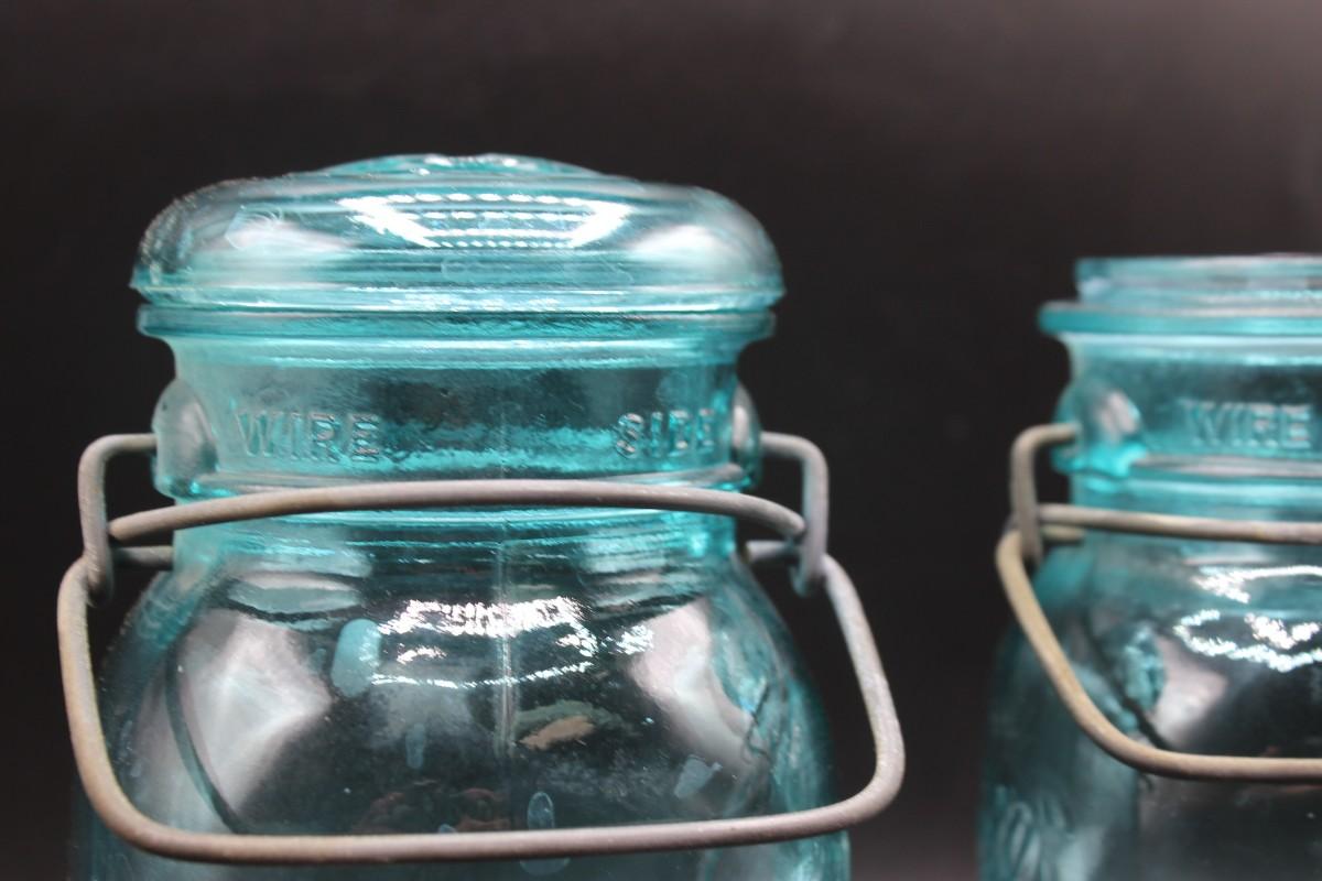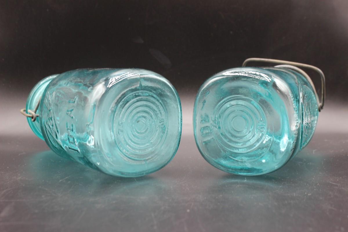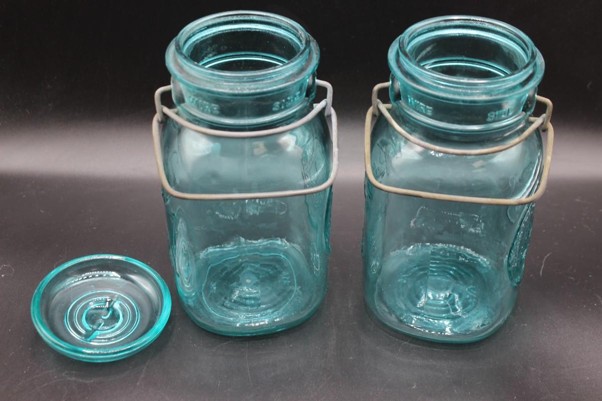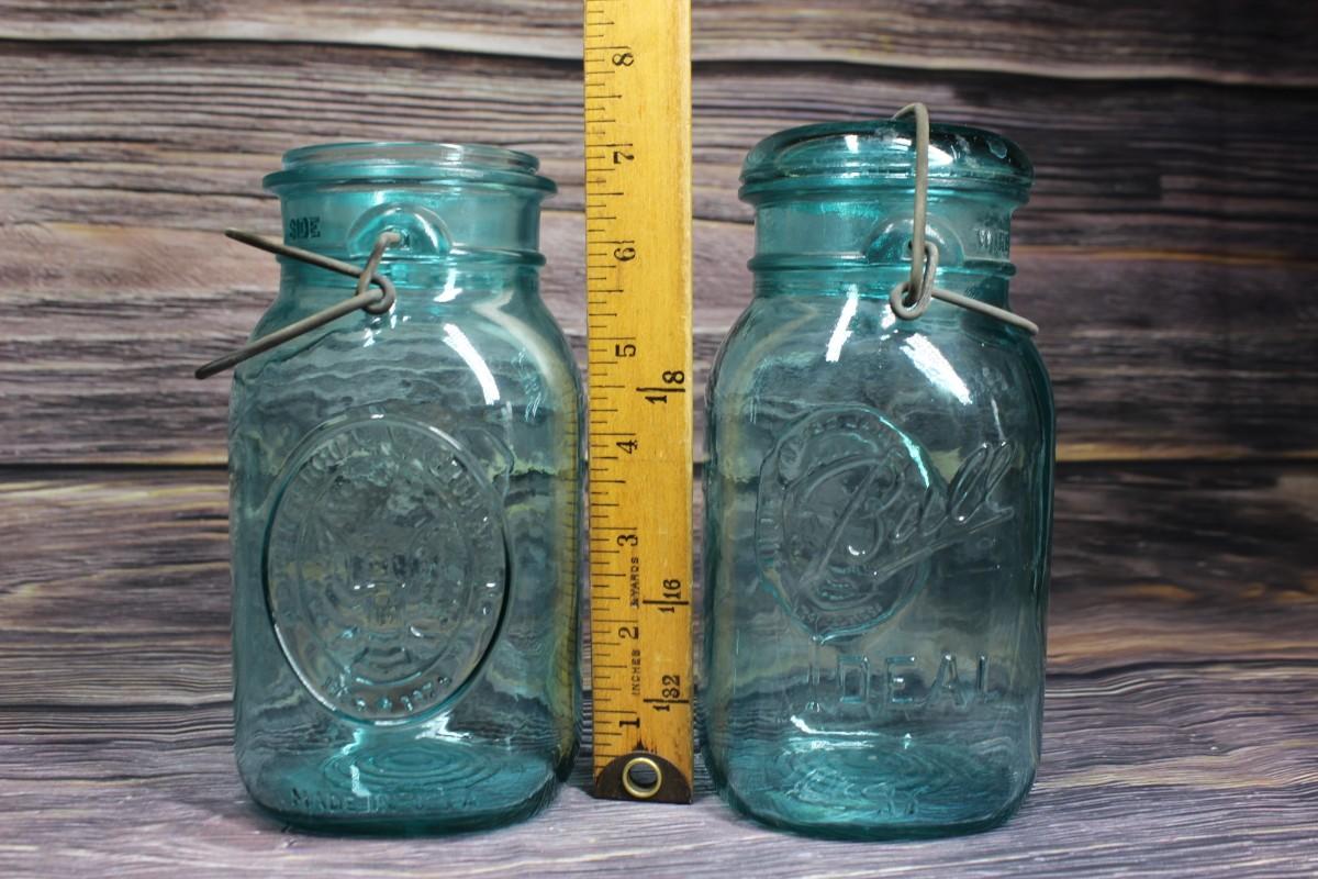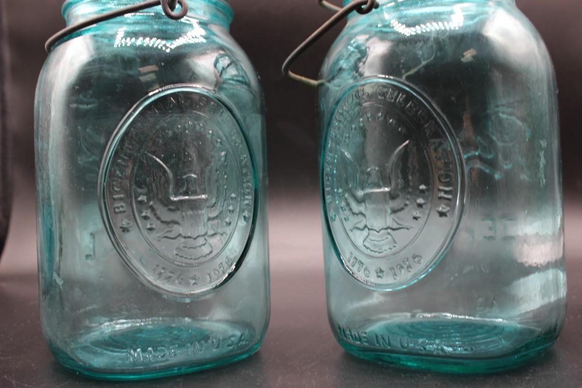 Pair of Ball Ideal Bicentennial Historical Reproduction Blue Wire Mason Jar, there are no cracks and chips to any of the pieces and is in good condition. One of the mason jars has a missing lid, the tightening wires on both jars work perfectly. Check pictures for more details and for sizing.