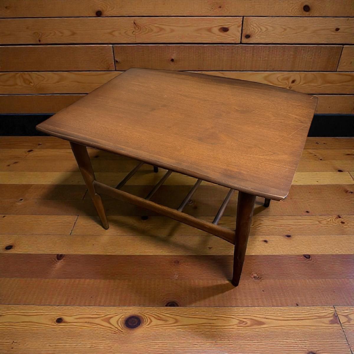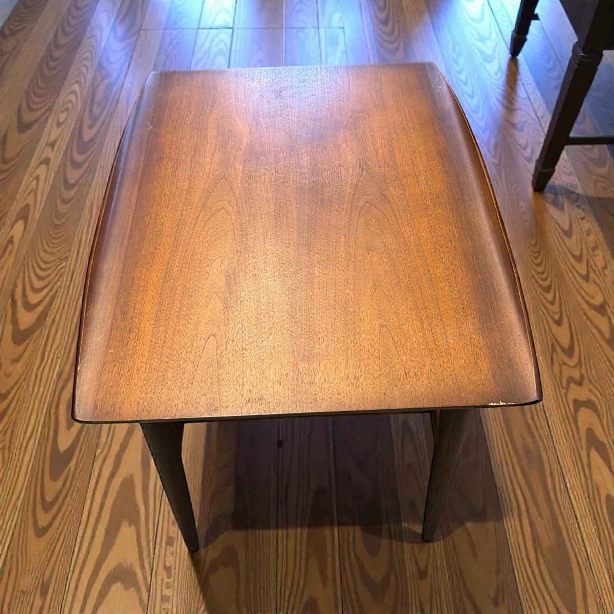 Pair Of Bassett Artisan Collection MCM Walnut Surfboard End Tables with a Spindled Lower Shelf