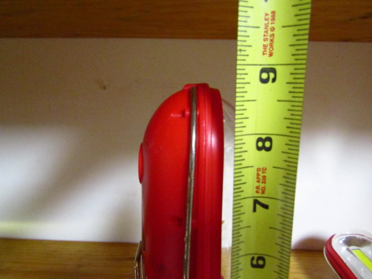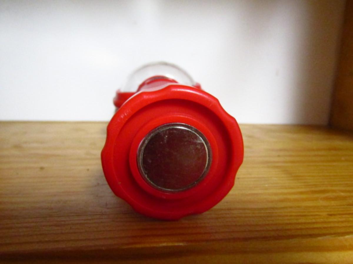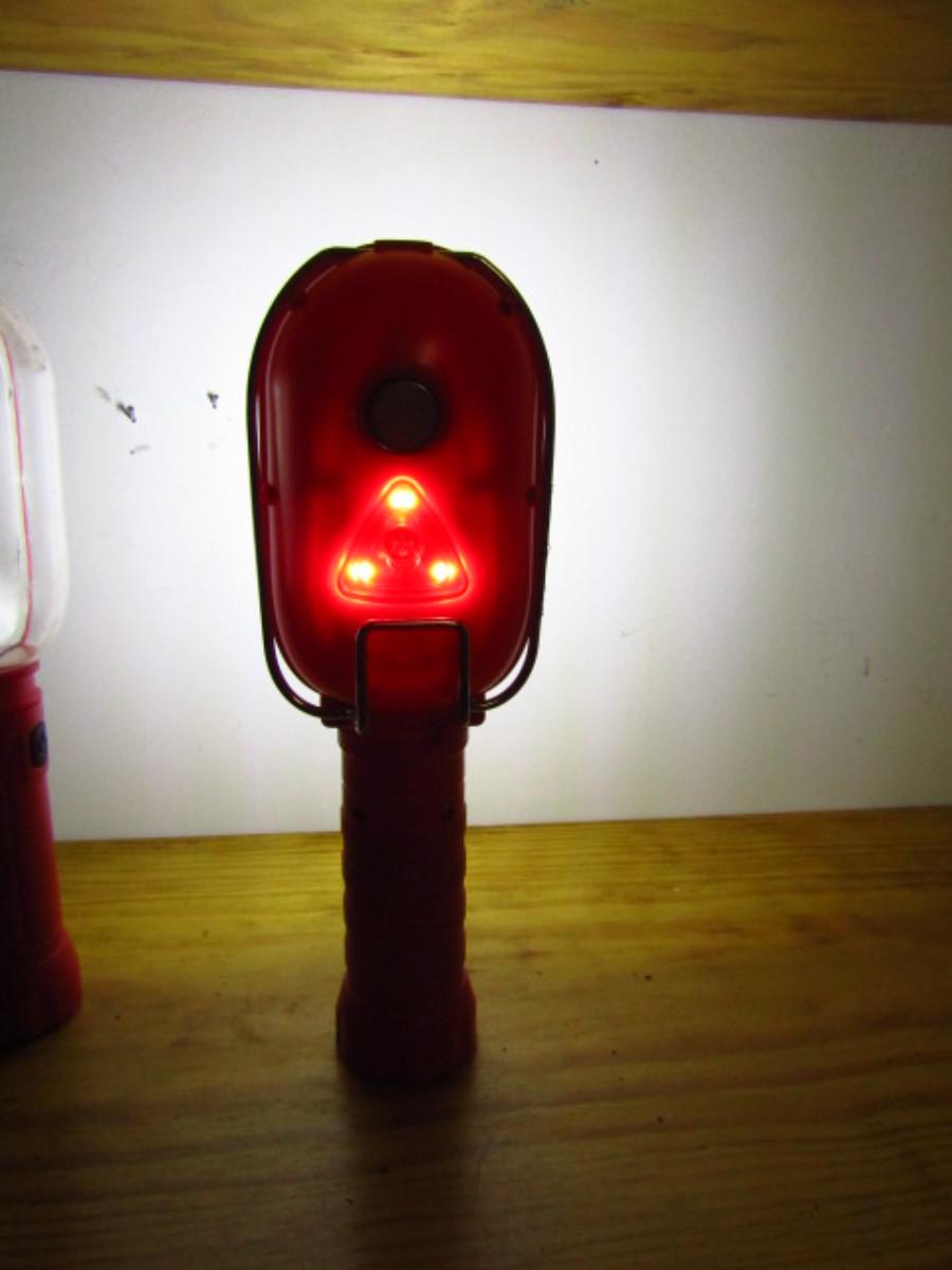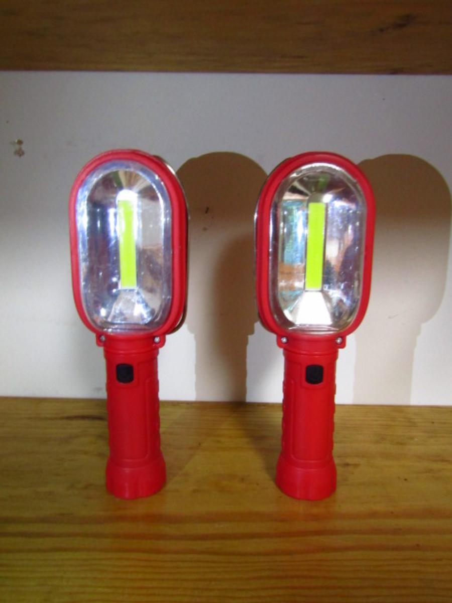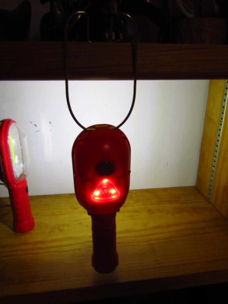 Pair of Battery Operated LED Lights. Plastic housing. Uses three AA size batteries. Multiple ways of hanging- magnet on bottom of handle and on back, also metal hook. Also, push button, flashing red caution light on back. Smartly designed- please see all pictures.