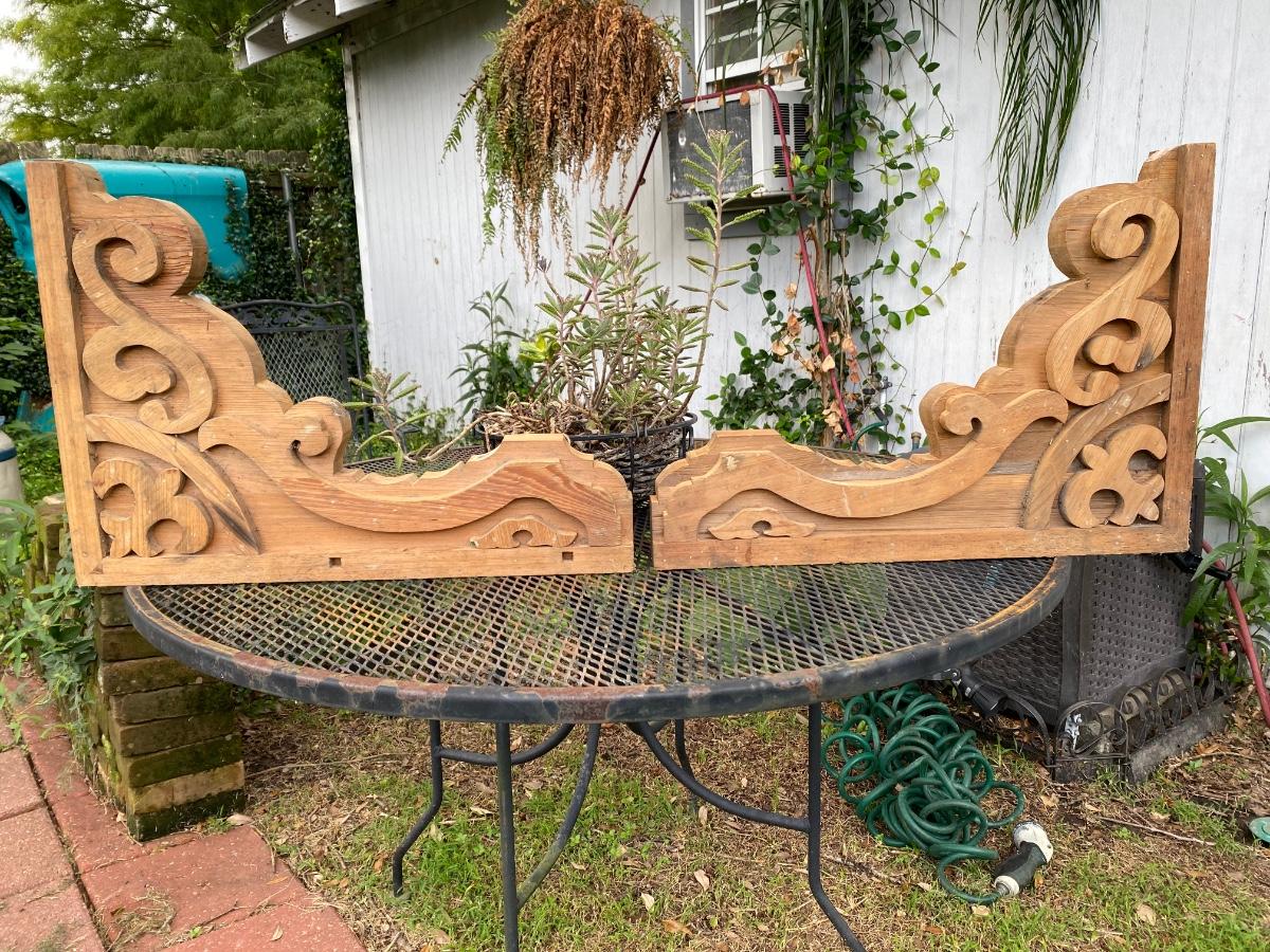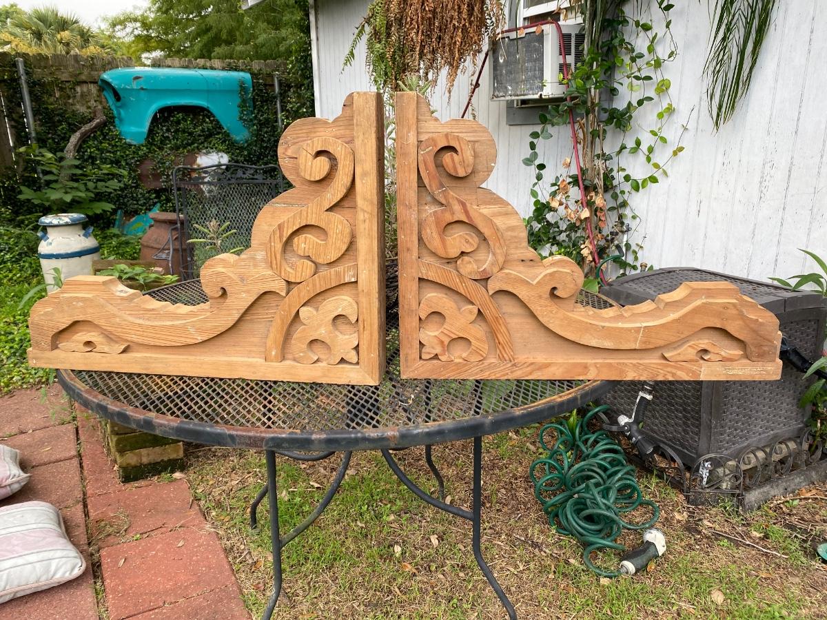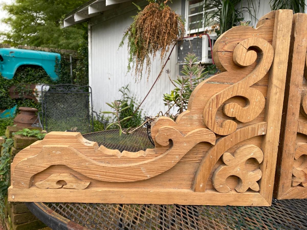 Pair of beautiful large vintage carved cypress corbels. Approx 24-1/2” x 18” x 3”