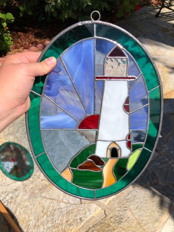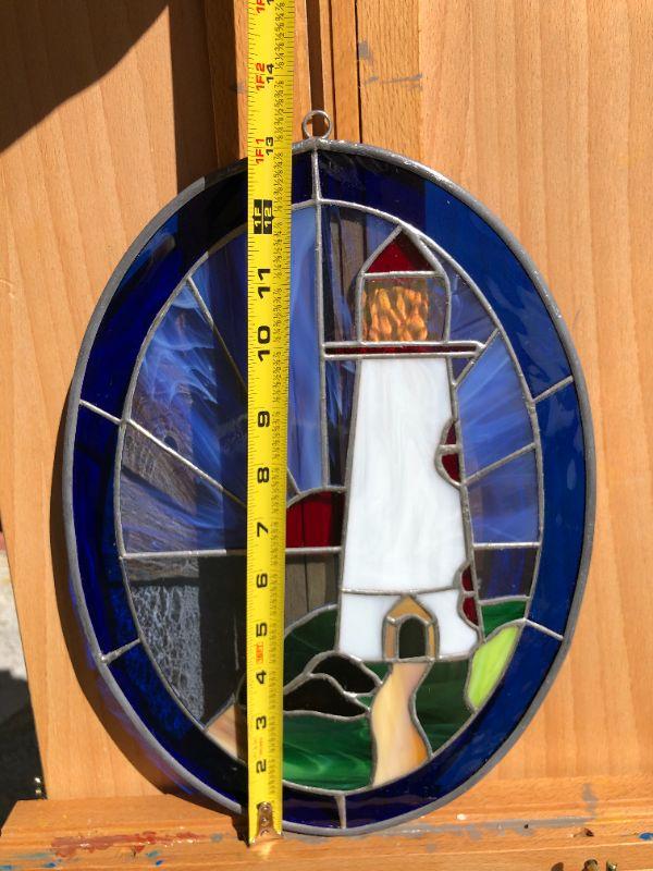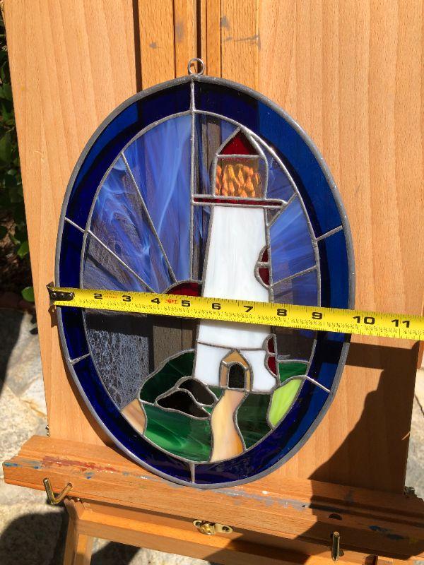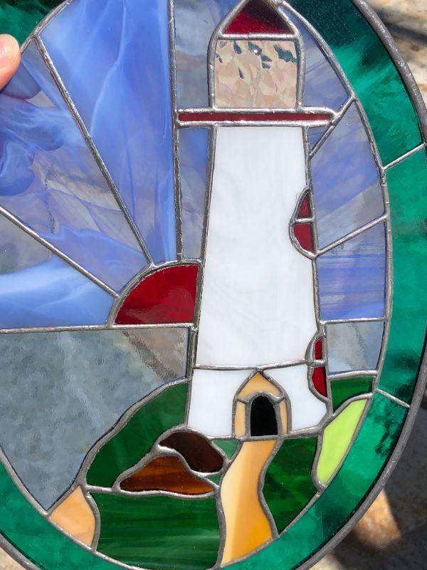 A lovely pair of lighthouse coastal stained glass windows! Transport yourself to Maine or some faraway coast with these beautiful windows. With complimentary green and blue color palettes, they look wonderful together or separate! In excellent condition, no visible cracks or chips. Each window has dimensions of approximately 13 x 10 inches (as shown in photos).