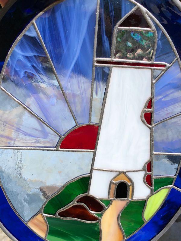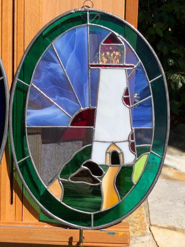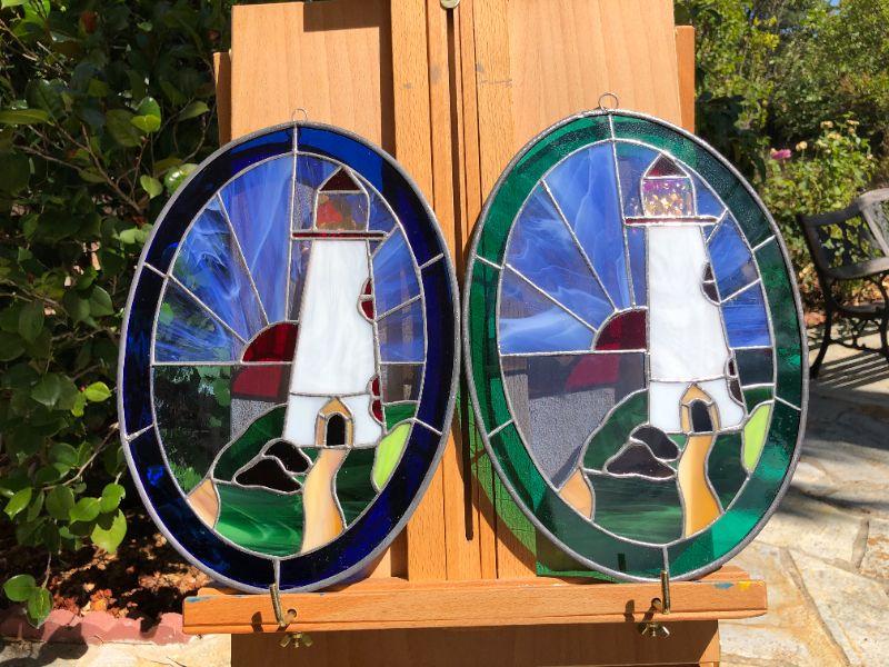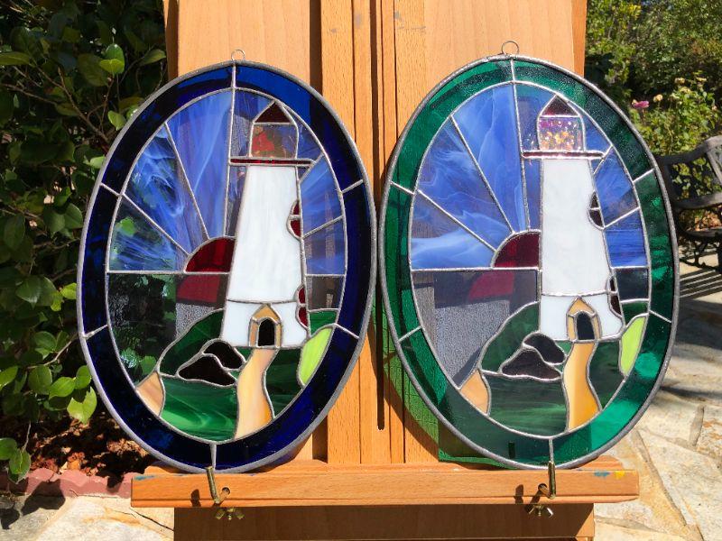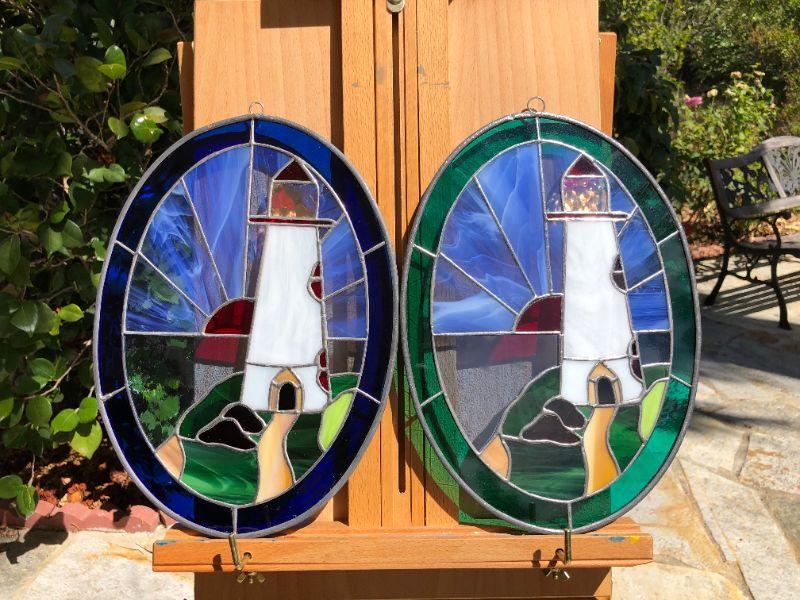 Pair of Beautiful Lighthouse Coastal Scene Stained Glass Oval Windows