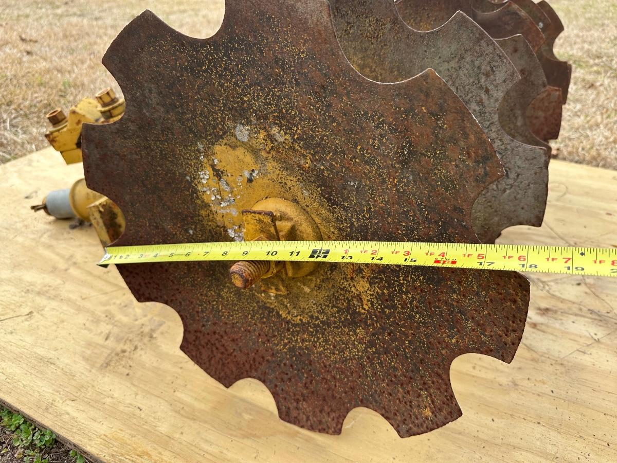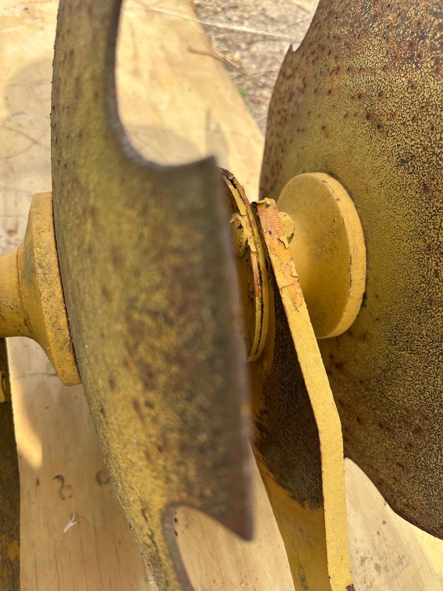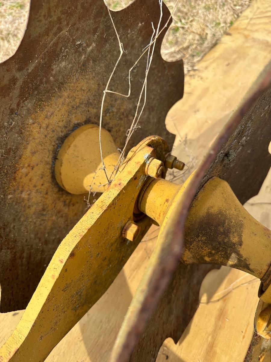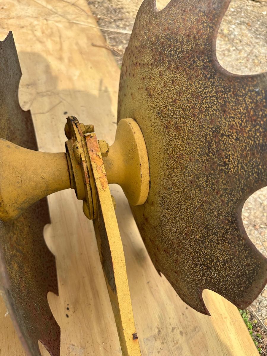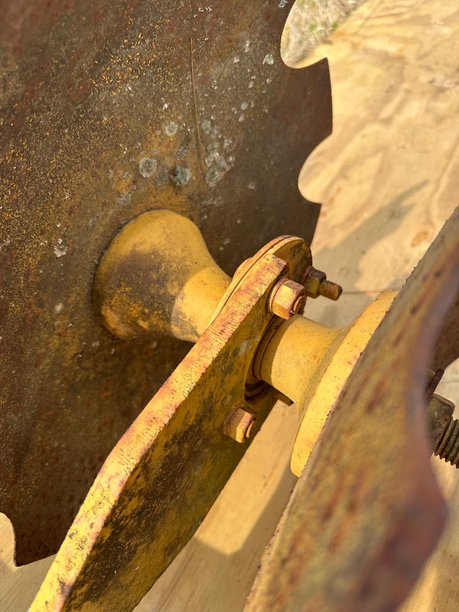 Used farm condition with surface rust on discs and cosmetic wear from storage. Cast housings and brackets appear solid with no visible cracks. Discs show typical wear but remain structurally sound.