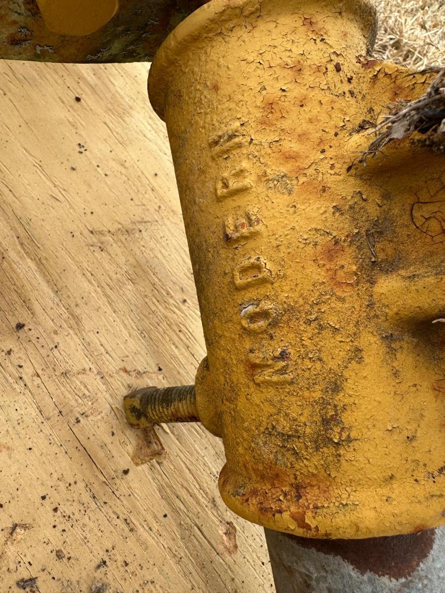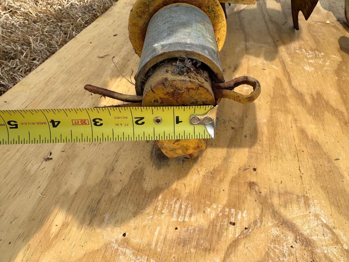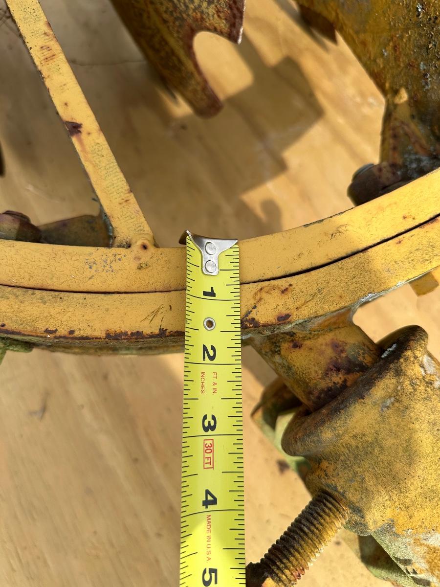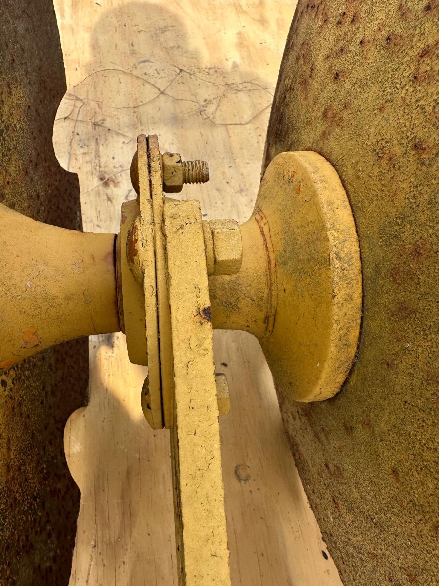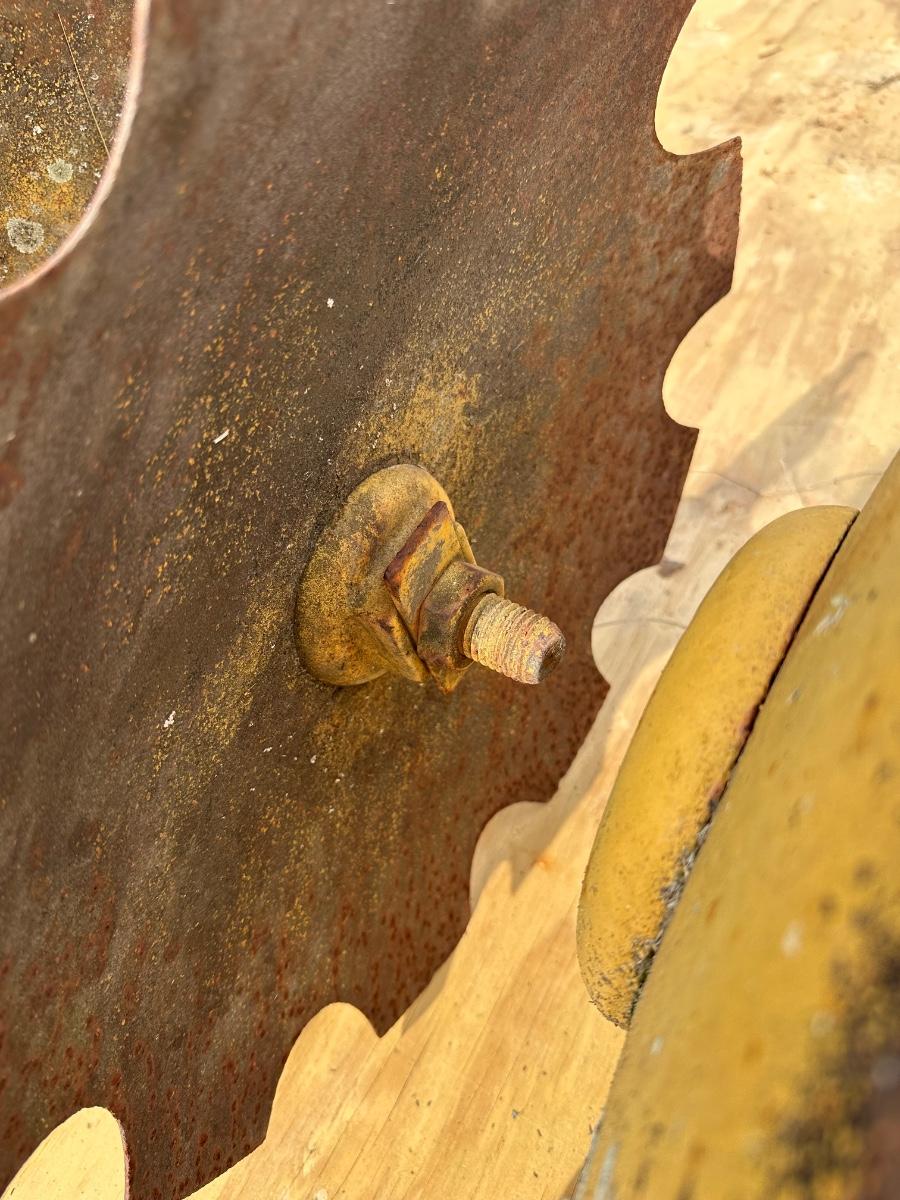 Used farm condition with surface rust on discs and cosmetic wear from storage. Cast housings and brackets appear solid with no visible cracks. Discs show typical wear but remain structurally sound.