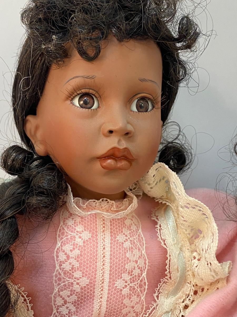 Pair of Bisque African American Collector Dolls. Shelf or chair sitting dolls. Good previously displayed condition.