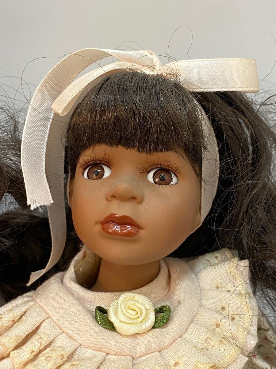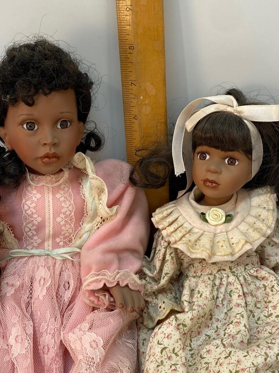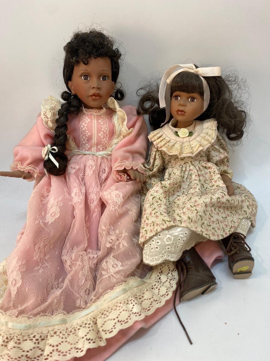 Pair of Bisque African American Collector Dolls. Shelf or chair sitting dolls. Good previously displayed condition.