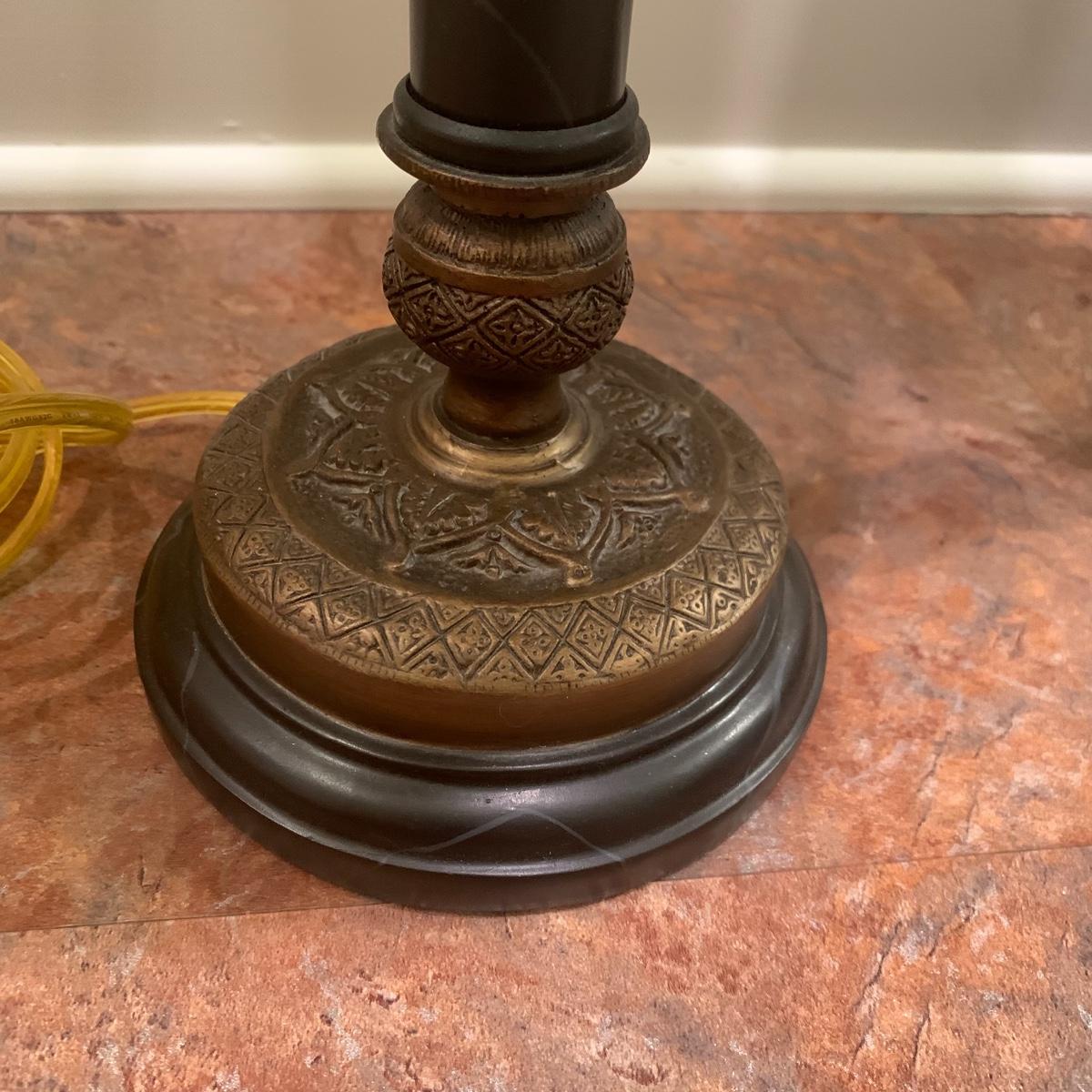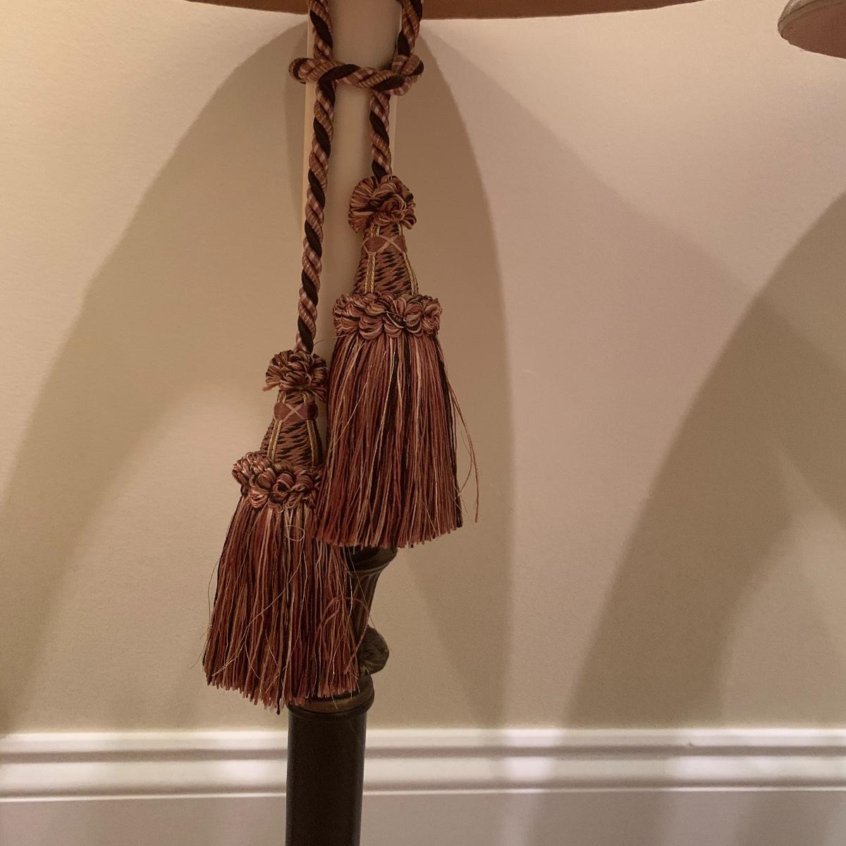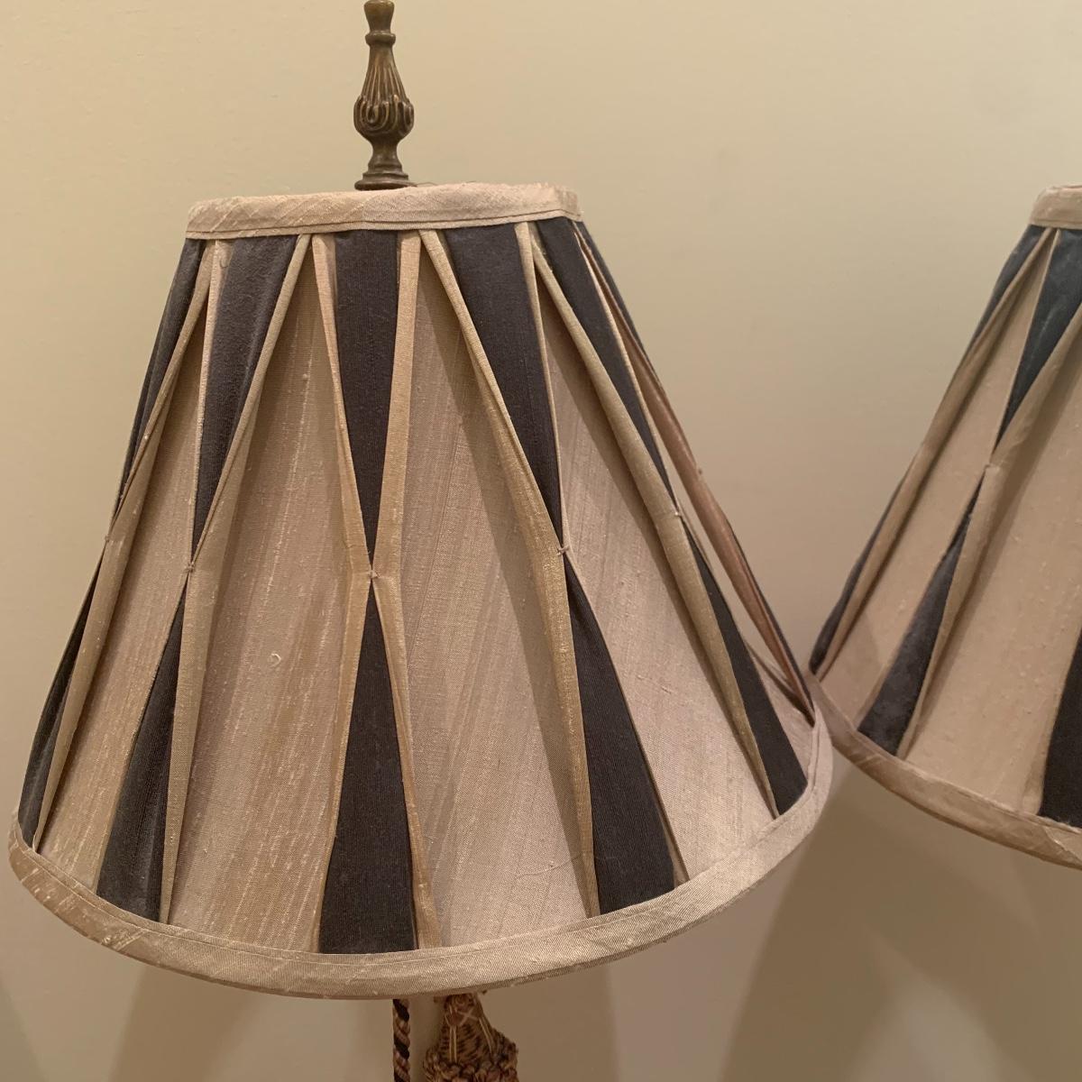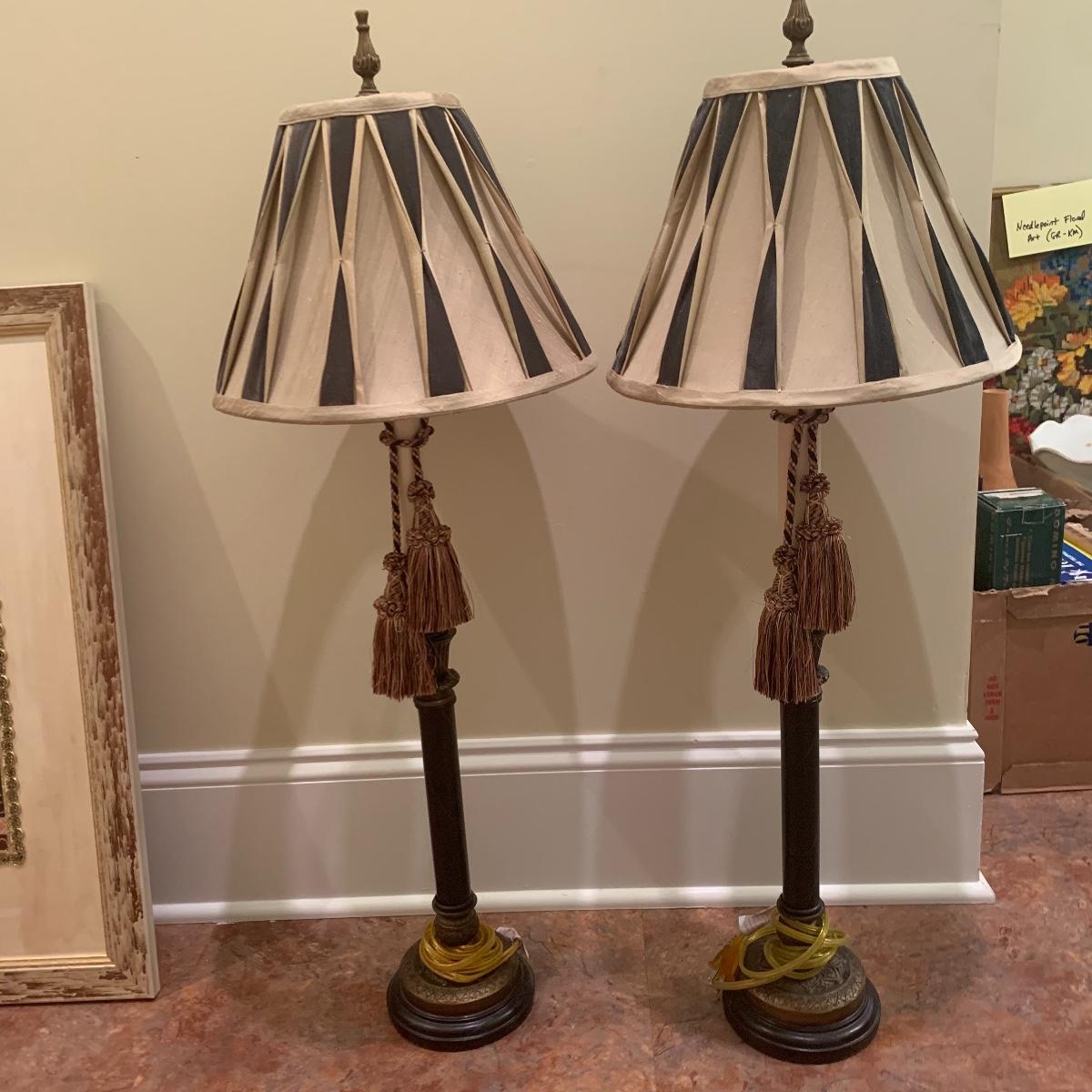 Pair of lamps each stand 33.5” to finel and have earthtone with gold tassels that are removable. Both are in working and good condition. Local pick up only.