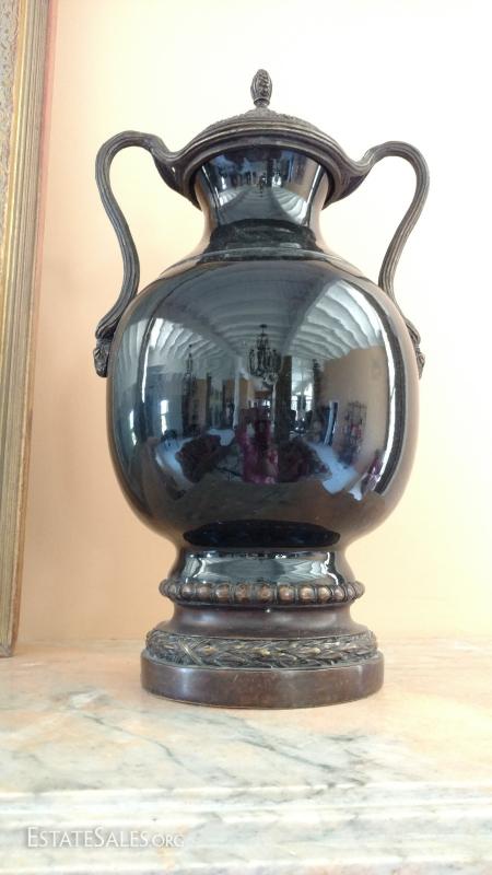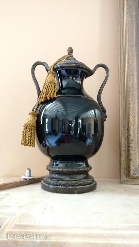 This lot features two matching classic black, tiered lids, high gloss finish, ceramic and metal urns, jars with handles. Tassle not included.