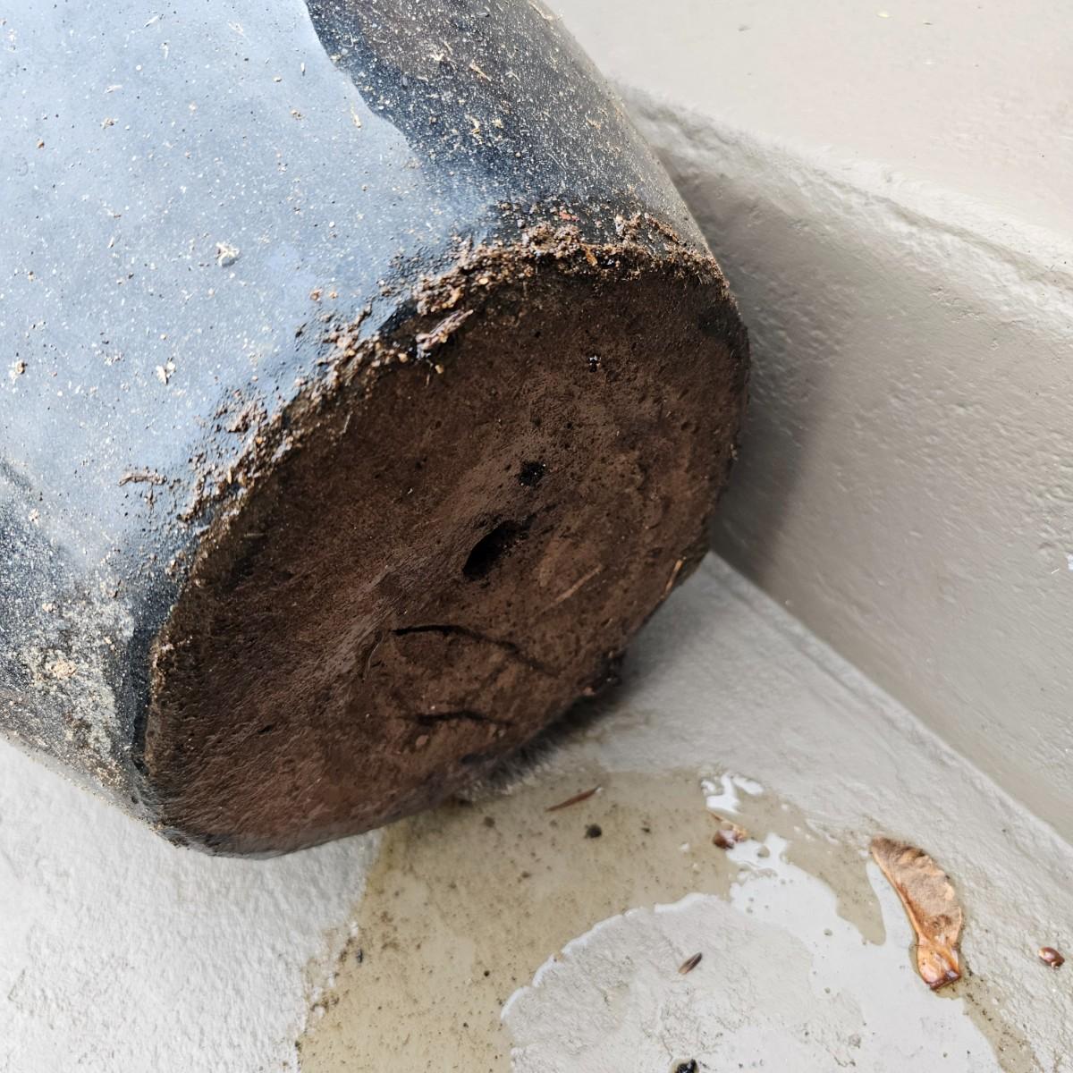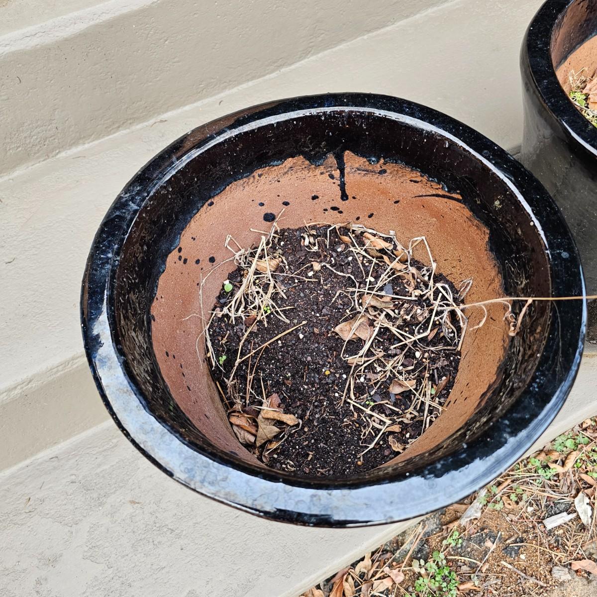 Two highly glazed black terra cotta planters for porch or other. Pots have drain holes in bottoms, measure 13.5"D x 15.5"H. See photos for details. Local pickup only.