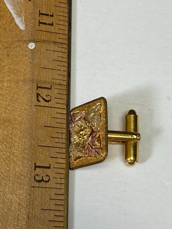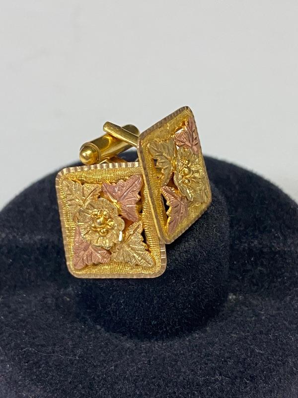 Beautiful pair of Black Hills Gold cufflinks. 3/4" square with a flower and leaves design. Post on links is gold fill, the flower and leaves are 10k & 12k mix. Good condition.