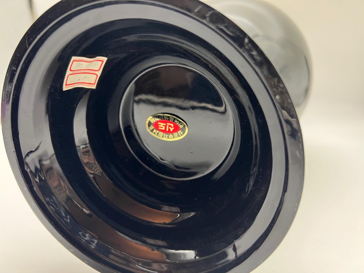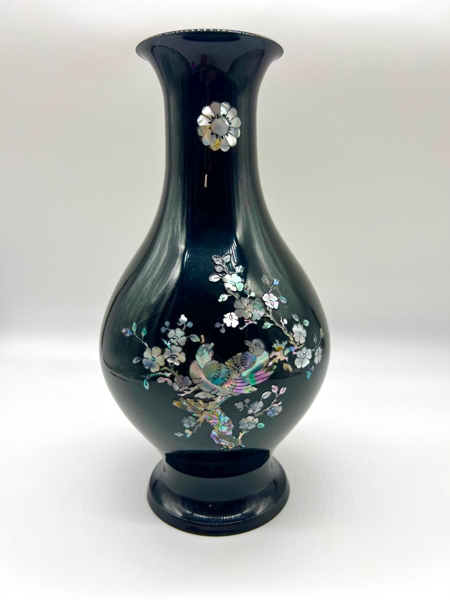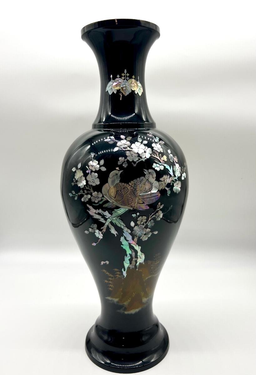 LARGE & MEDIUM SIZED Oriental Black Lacquered Mother of Pearl Vase. Large vase measures 22 inches tall, 6 inches at the base. Small vase measures 14 inches tall and 6 inches at the base.