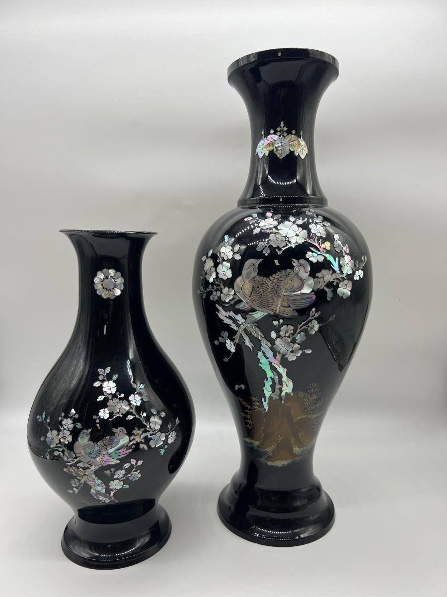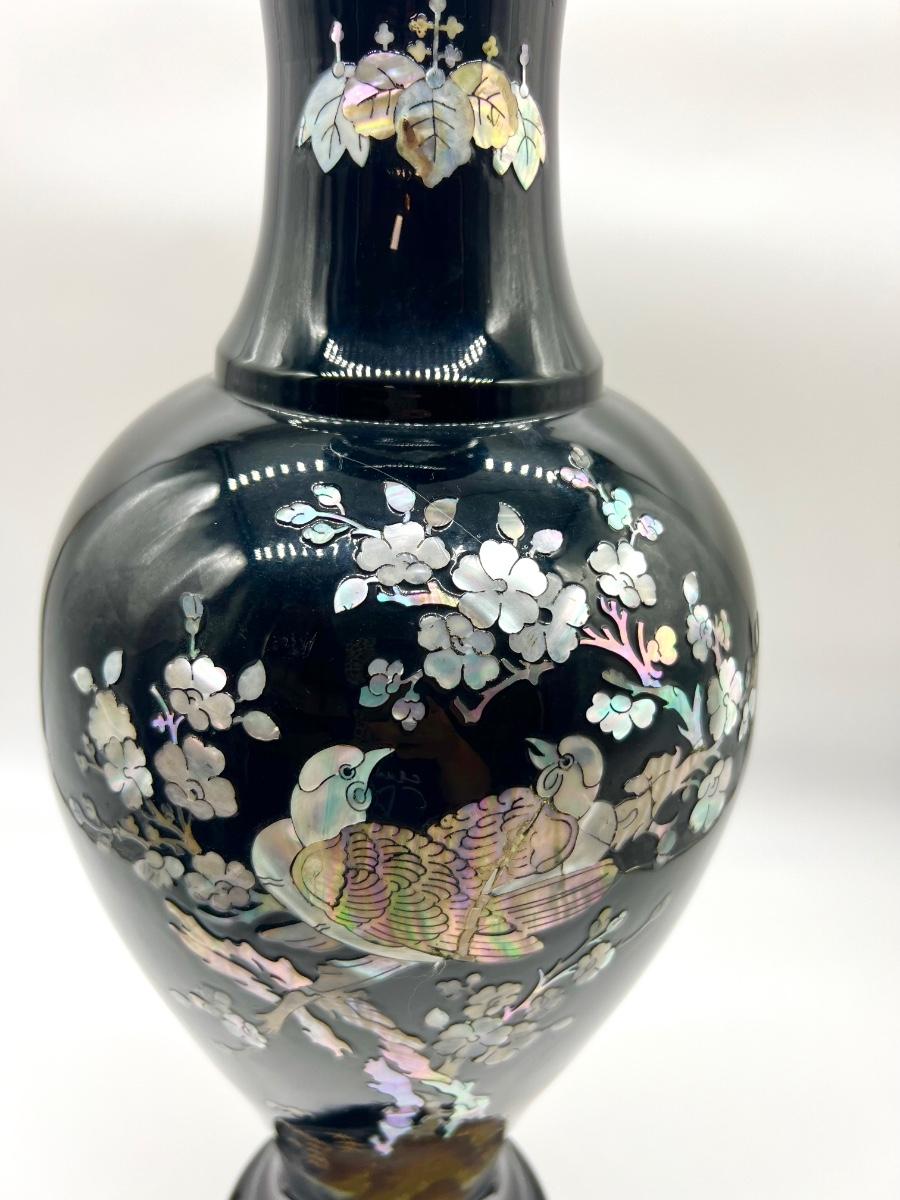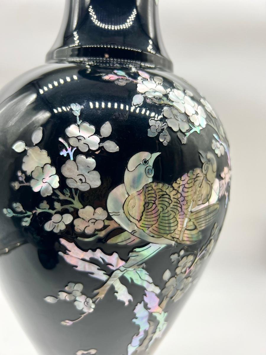 Pair Of Black Lacquered Mother of Pearl Vase
