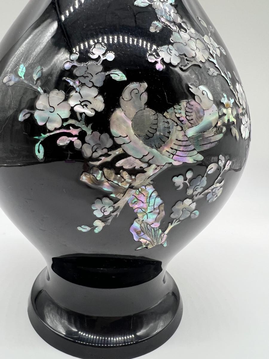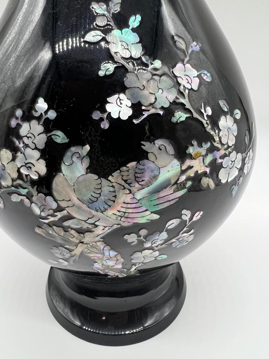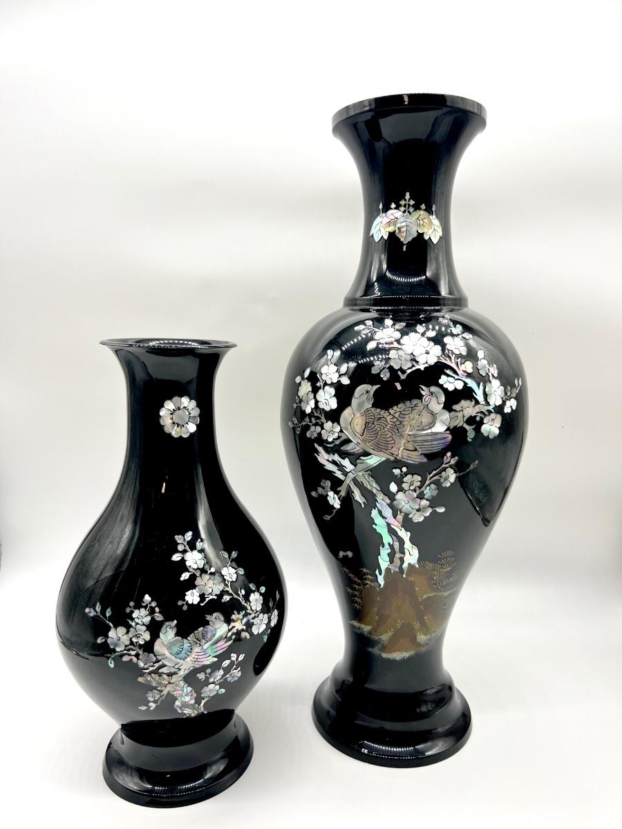Pair Of Black Lacquered Mother of Pearl Vase