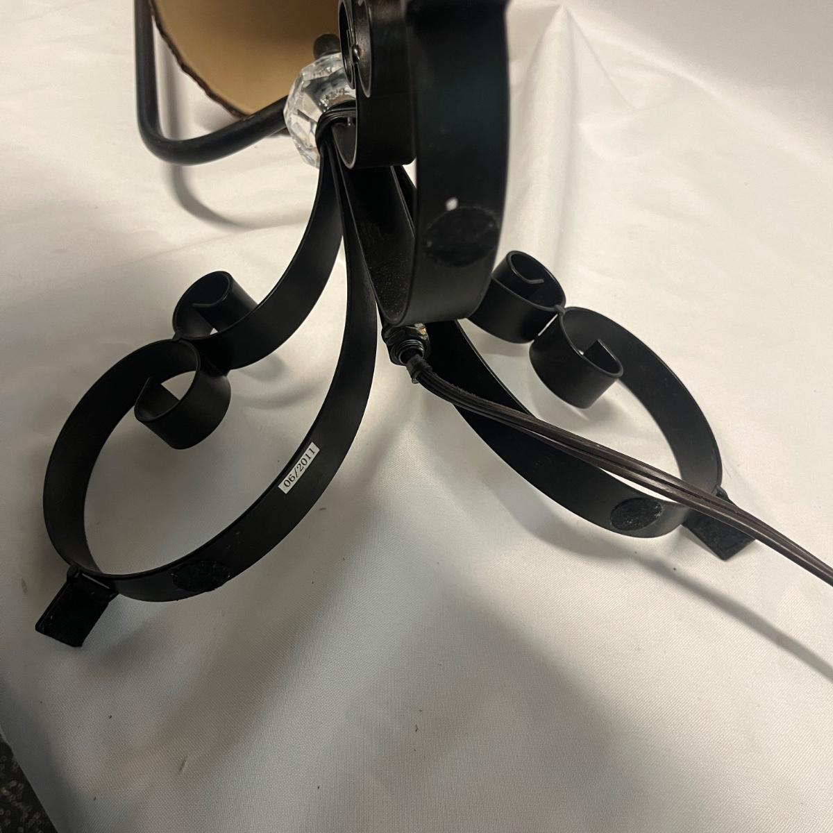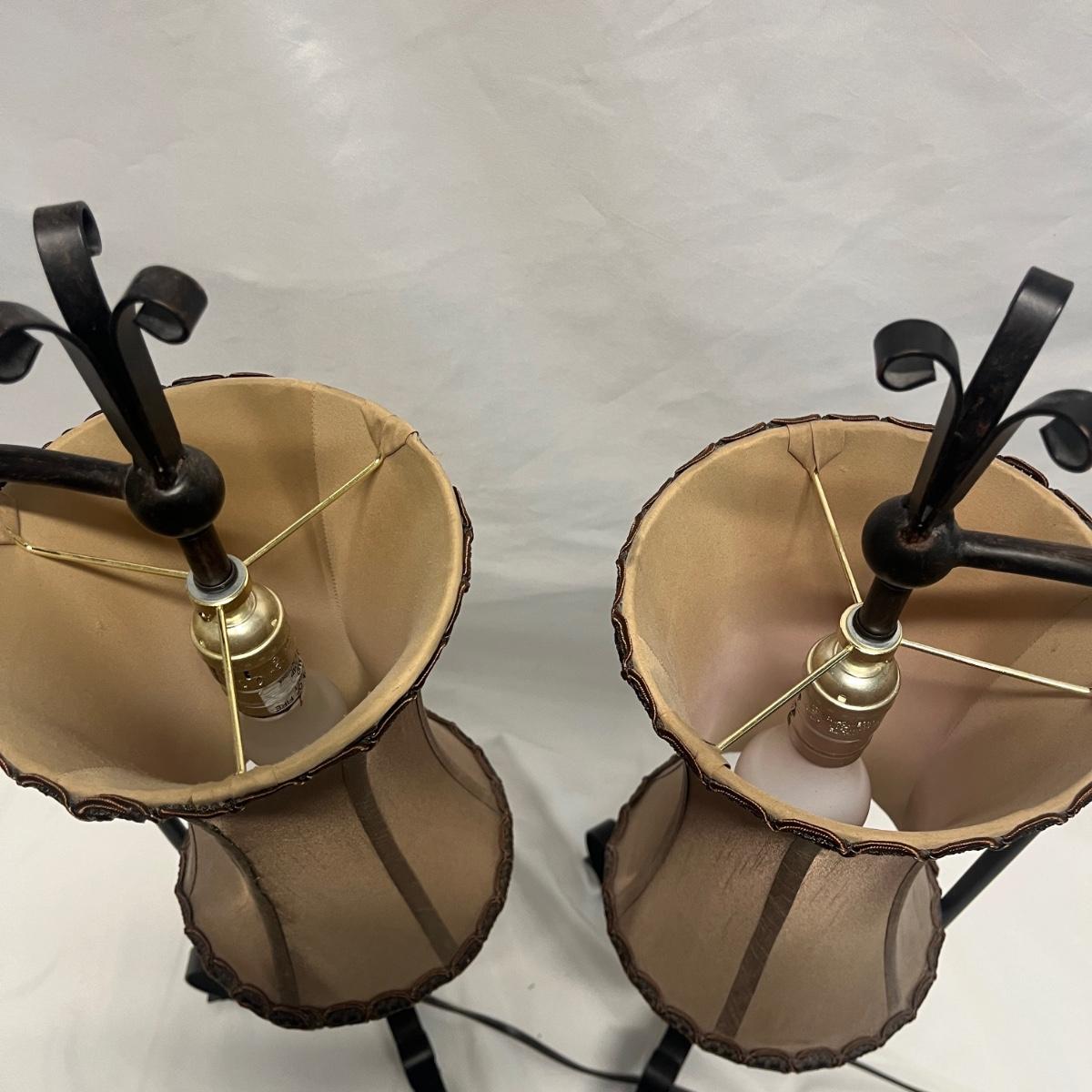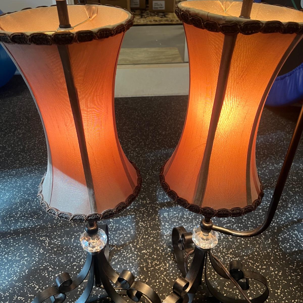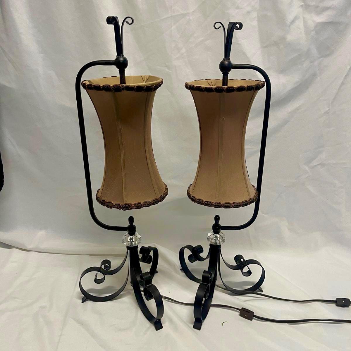 This pair of metal table lamps have black metal decorative frames. A glass ball adorns each frame. Both lamps powered on when plugged in and their tan colored shades light up with an orange glow. Lamps have inline on/off switches.
