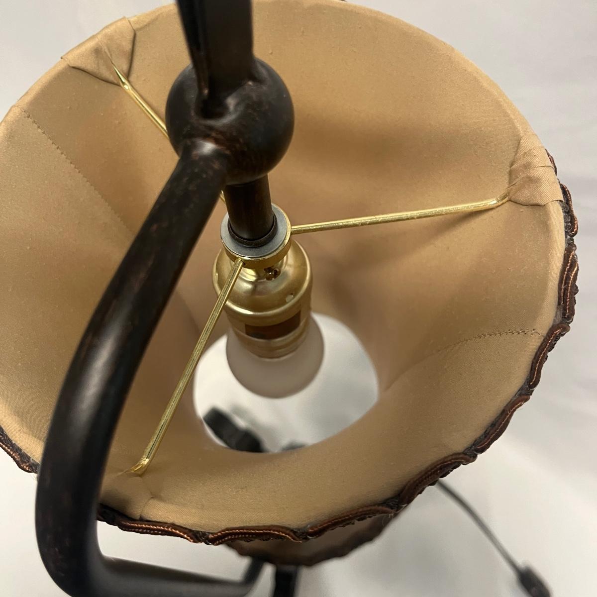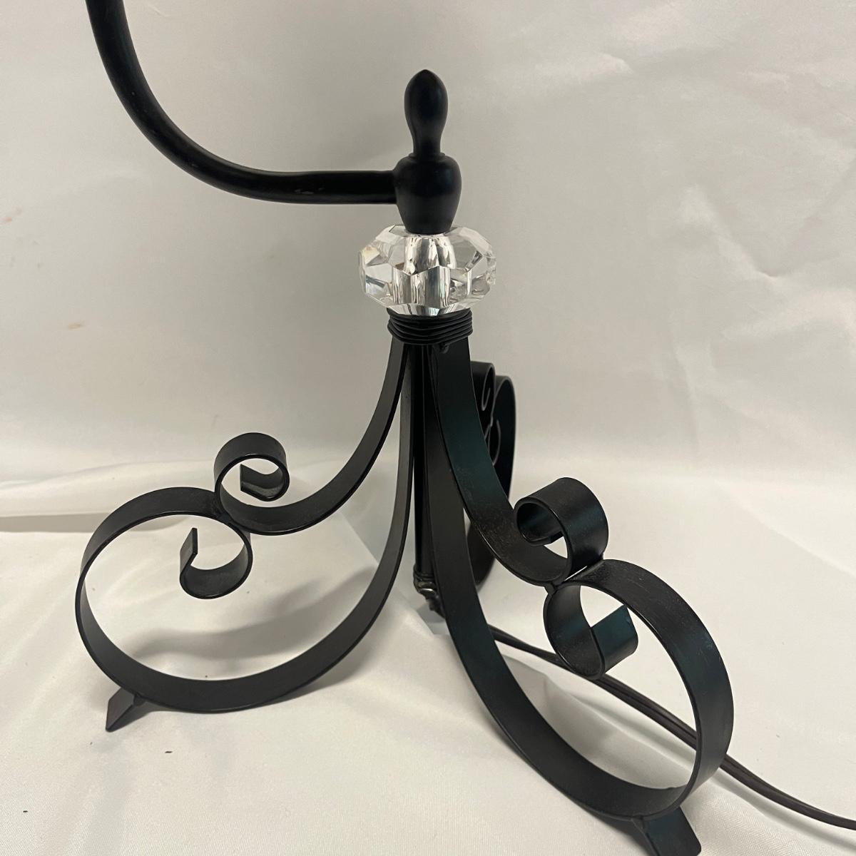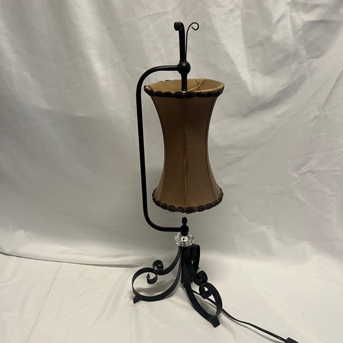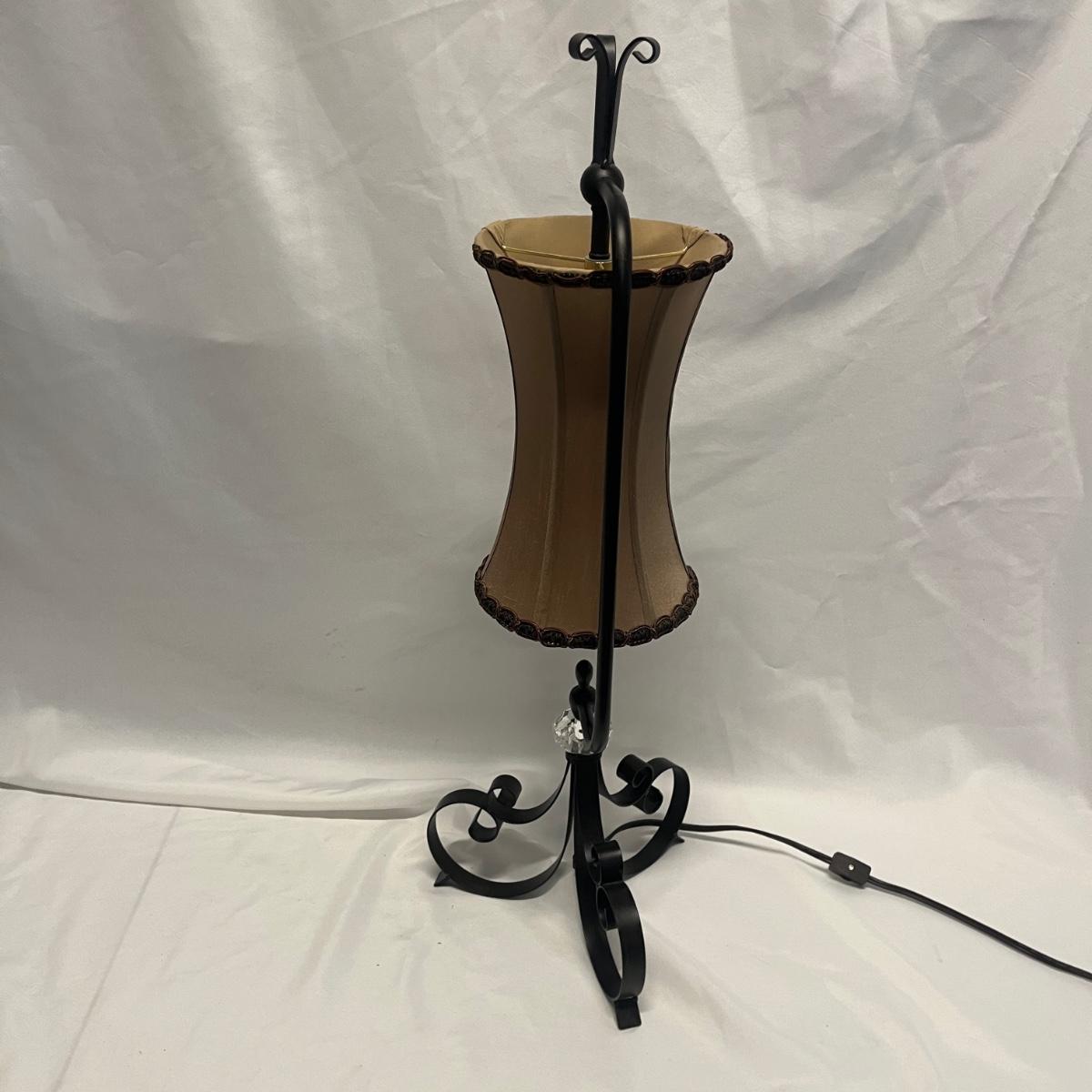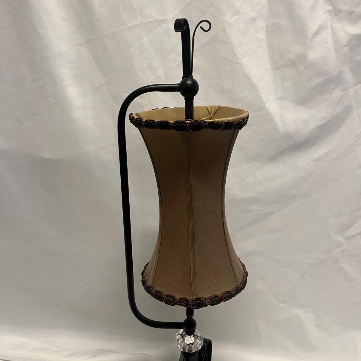 This pair of metal table lamps have black metal decorative frames. A glass ball adorns each frame. Both lamps powered on when plugged in and their tan colored shades light up with an orange glow. Lamps have inline on/off switches.