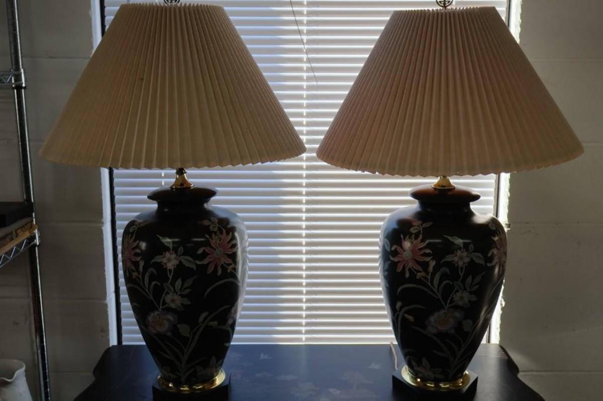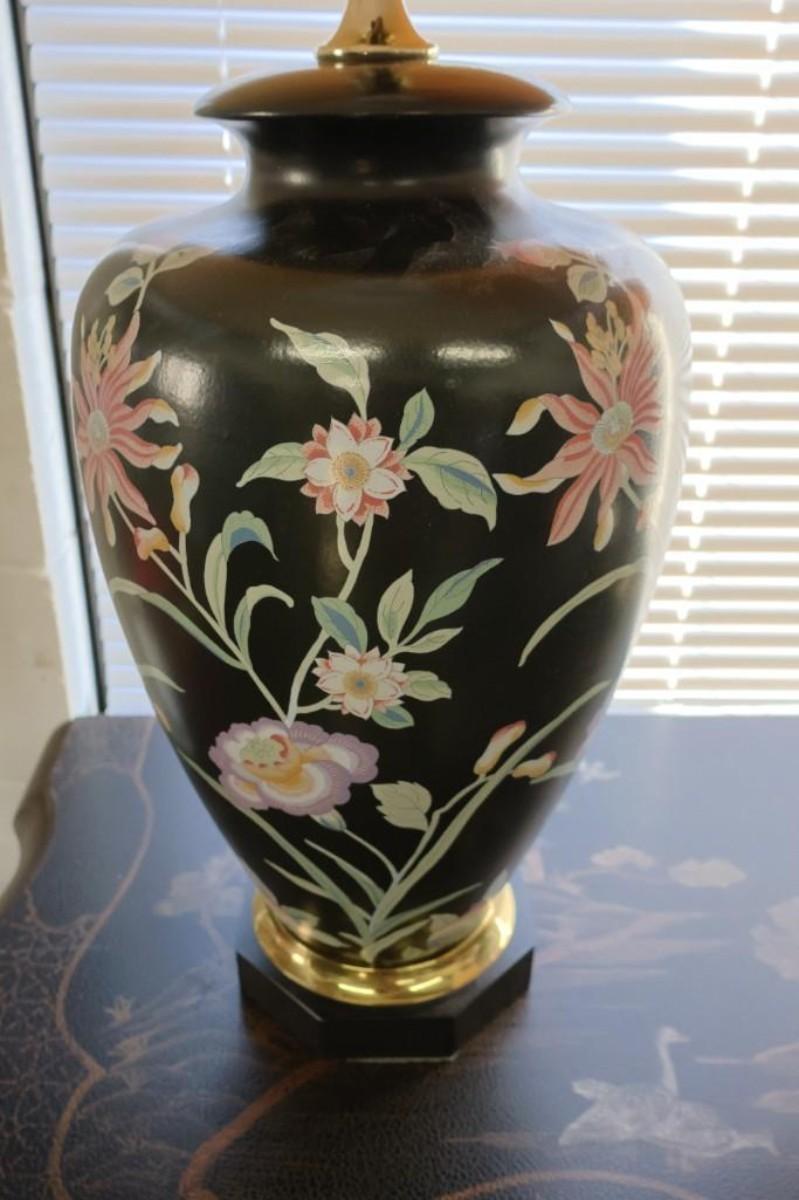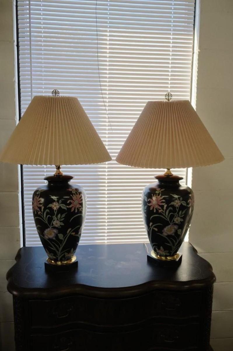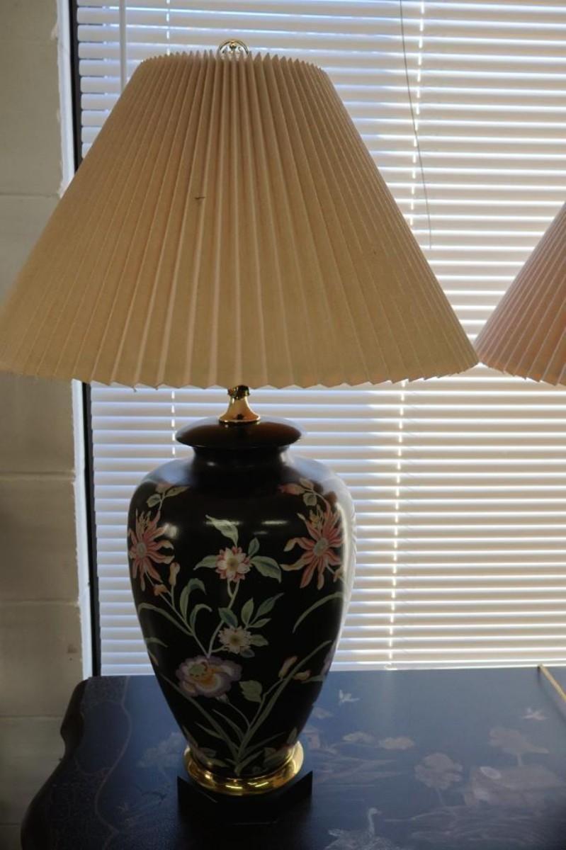 Pair of Black Porcelain Table Lamps with Flowers Size: 32"H Condition: Used